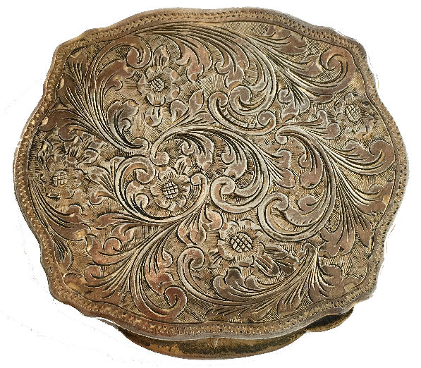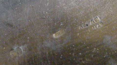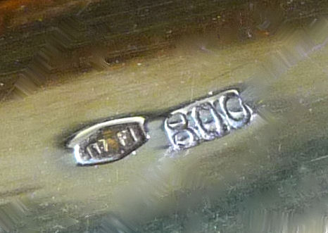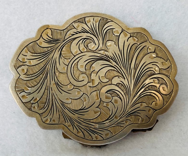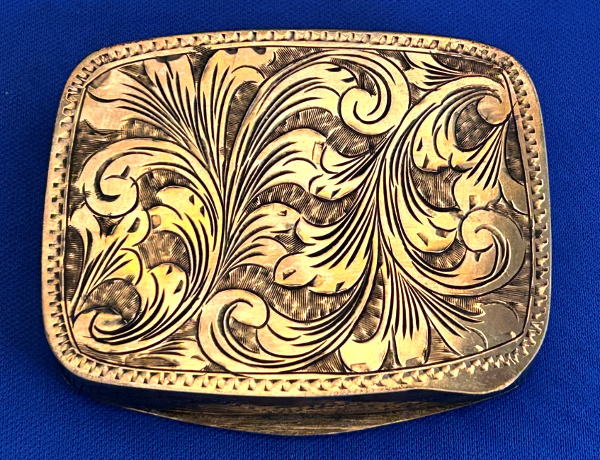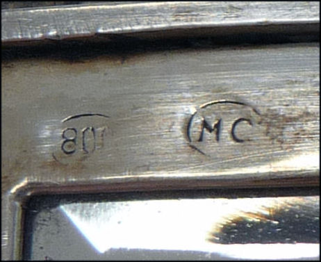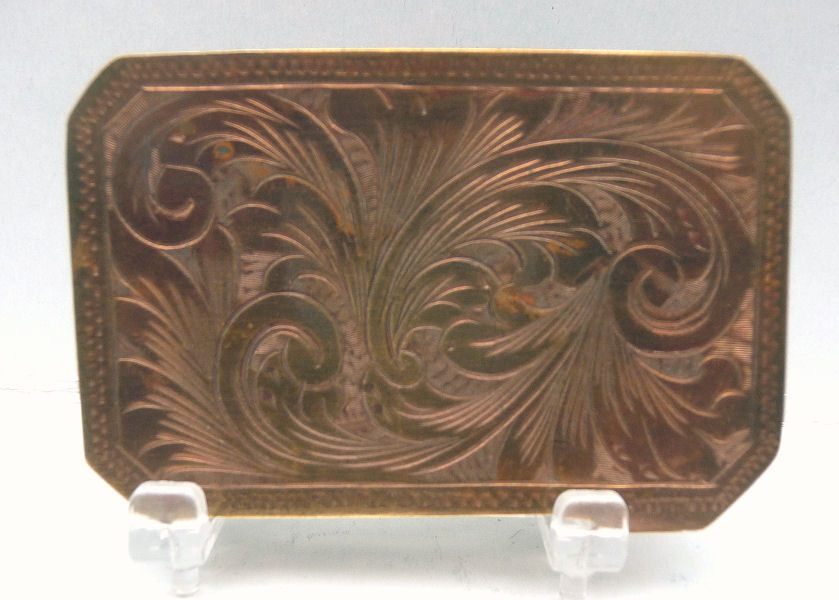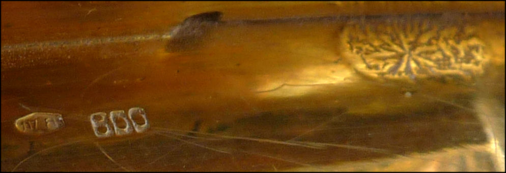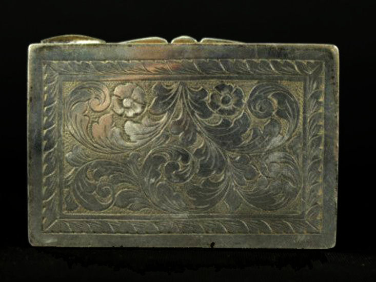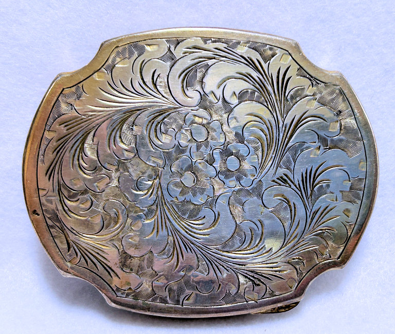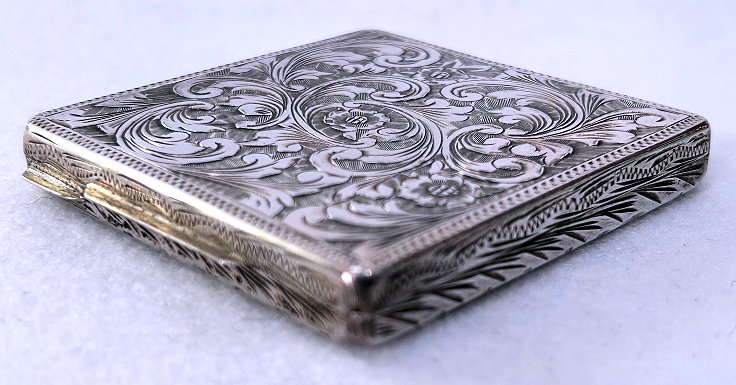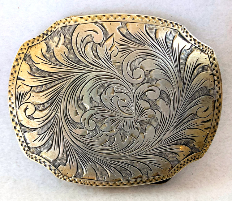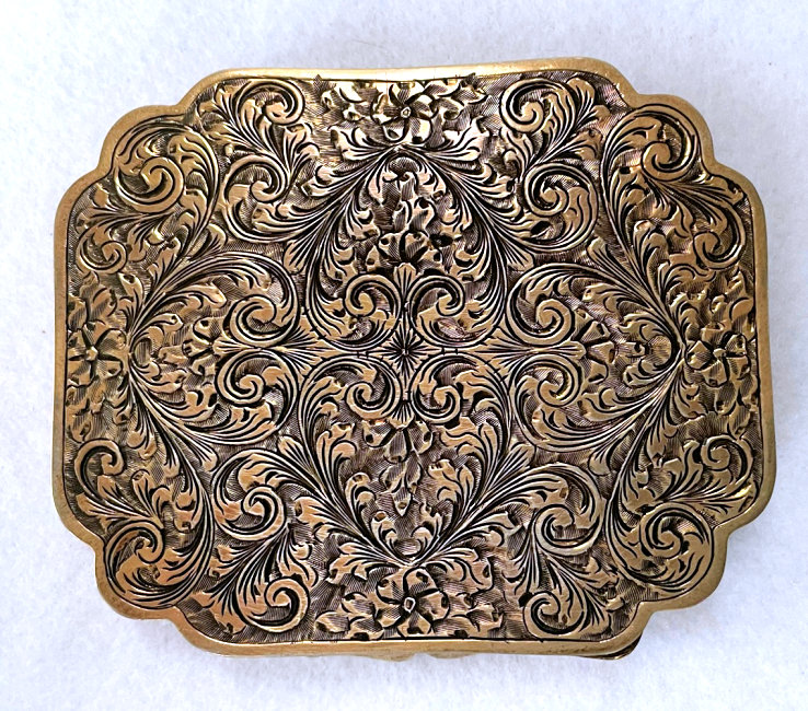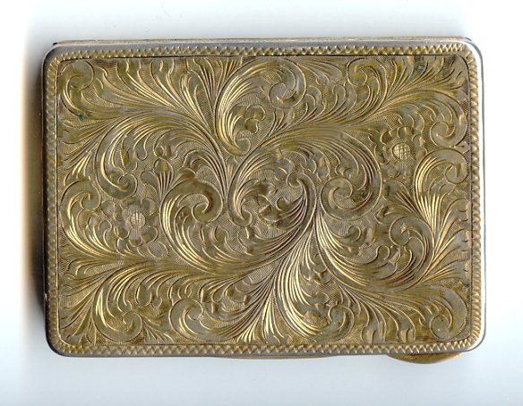 Wow! is all I can say about this compact. The engraving on this compact is referred to as "Bright-Cut" and was used on luxury items from the 1920's to 1930's era. It is not machine done but rather hand-engraved with a flat graver tool that cuts shallow facets into the silver which catches the light like gemstones.I have never had another like this and it is truly gorgeous. Inside is a round beveled mirror in the lid and a covered powder well in the bottom with original puff and screen, both never used. It is marked Silver 950* in the powder well and there is a monogram on the lid that I think reads "AMP" but I can't be sure it is so fancy. It comes in its original wooden box for protection which is also a sign of high-quality luxury items sold in France in the Art Nouveau thru Art Deco period.. Although unmarked, the SILVER 950 mark and design of the interior signify that it was made in France. Measures approx. 3" square. Box is 3-5/8" square. *The SILVER 950 mark denotes a higher purity than sterling: 950 silver = 95% pure silver. This marking and the design are most likely French in origin. (Click on pic for more photos.) |