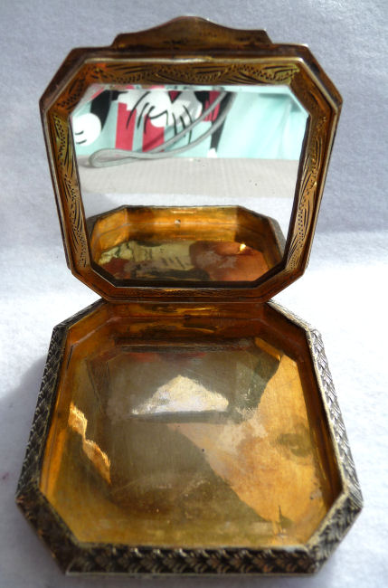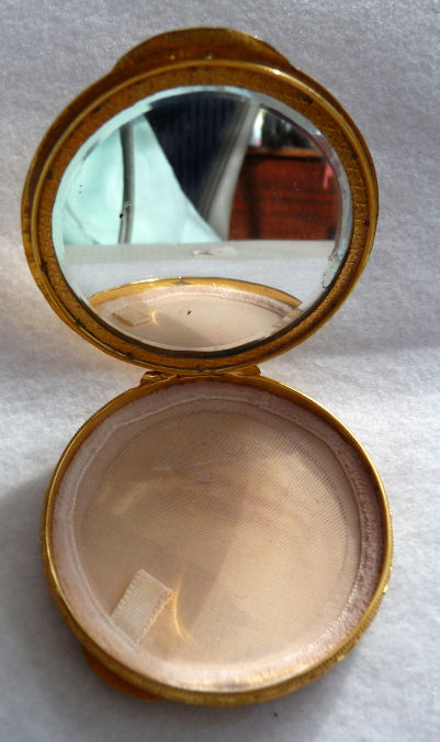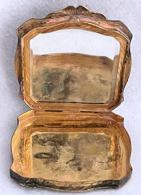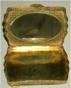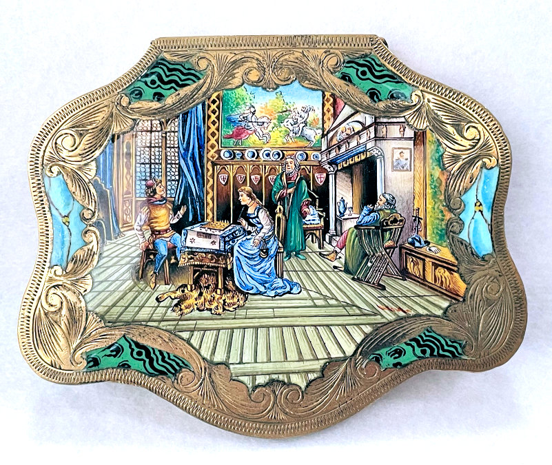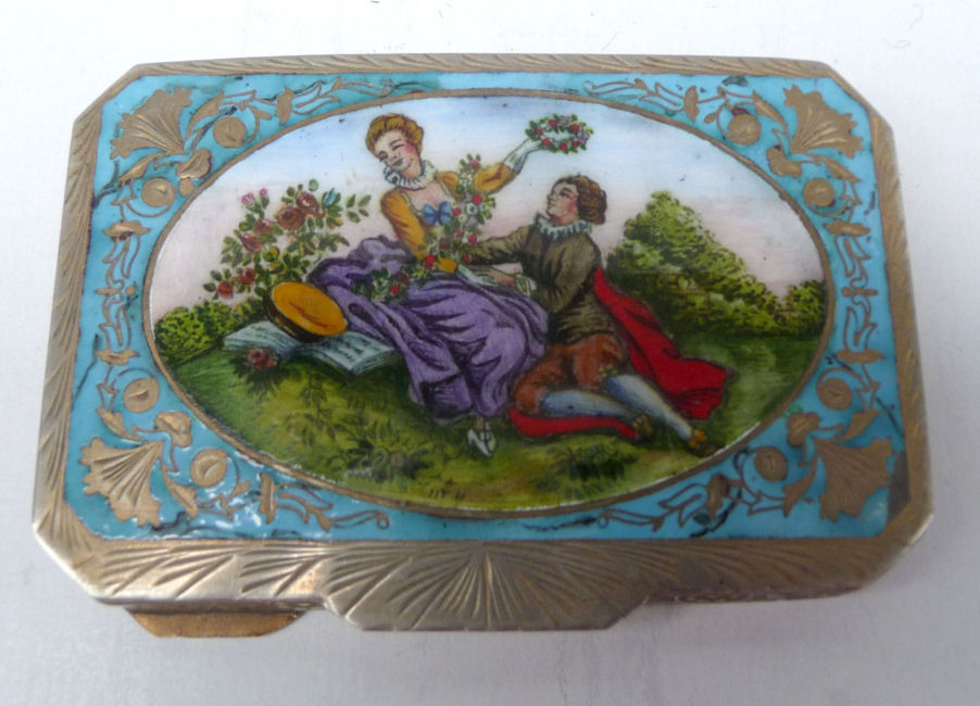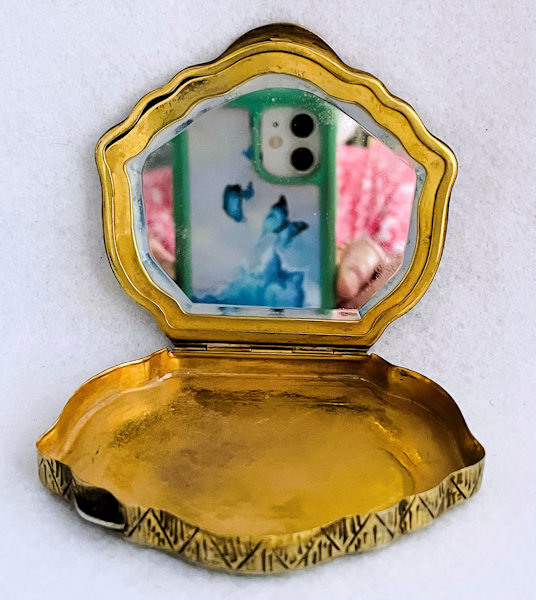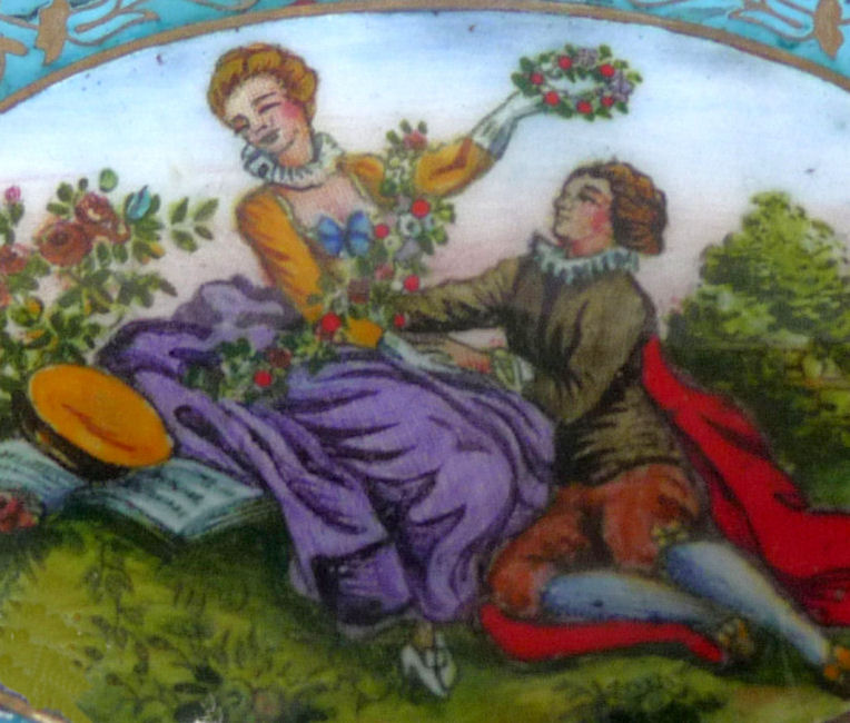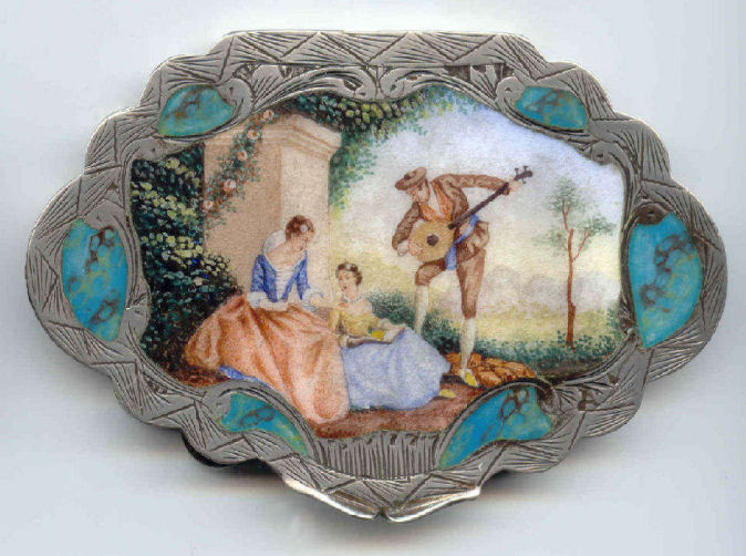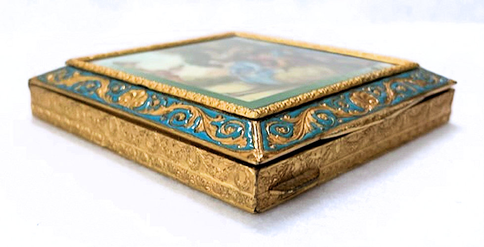 Here we have a courtier gallant with his lady fair ... his hat is swept off as he bows toward her. The object of his affections is richly begowned in overflowing skirts, dainty slippers, and wide-brimmed feathered hat. Rich in detail and beautifully surrounded in faux turquoise enameling. Interior features a large mirror in the lid which is beginning to lose its silvering. If there was a retaining border around the mirror, it is missing, but mirror is glued in place (I would replace mirror if I were keeping this one). Measures 3-5/8" x 2-5/8" overall. Previously listed for $450. (Click on pic for more photos.) |