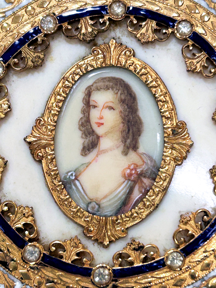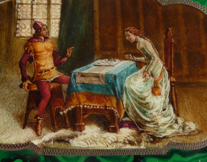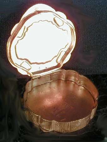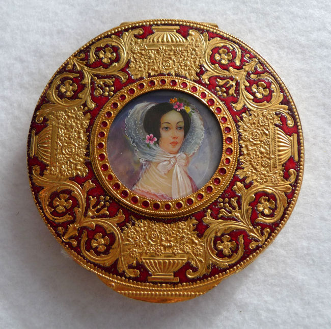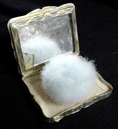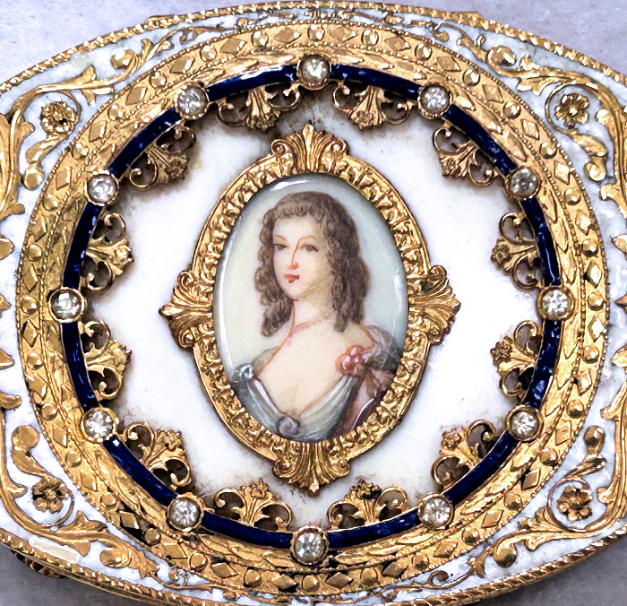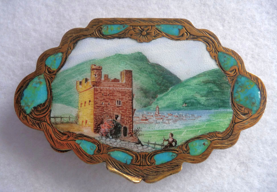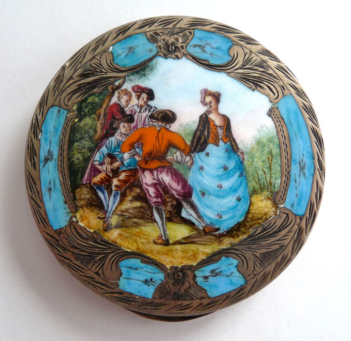 Here we have a courtier gallant with his lady fair ... his hat is swept off as he bows toward her. The object of his affections is richly begowned in overflowing skirts, dainty slippers, and wide-brimmed feathered hat. Rich in detail and beautifully surrounded in faux turquoise enameling. Interior features a large mirror in the lid which is beginning to lose its silvering. If there was a retaining border around the mirror, it is missing, but mirror is glued in place (I would replace mirror if I were keeping this one). Measures 3-5/8" x 2-5/8" overall. Previously listed for $450. (Click on pic for more photos.) |