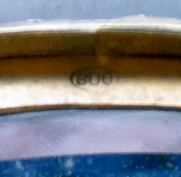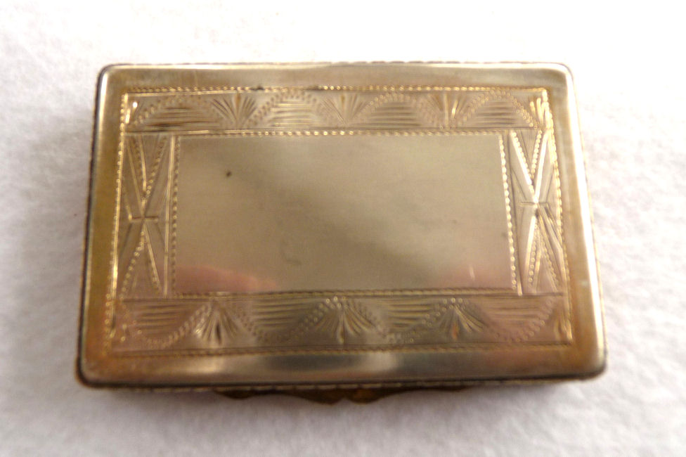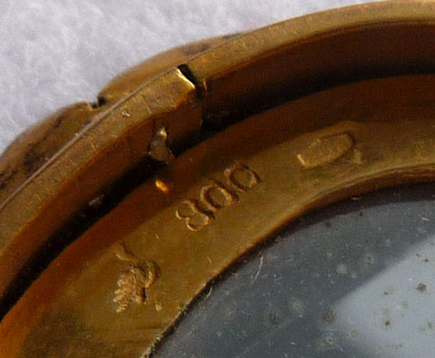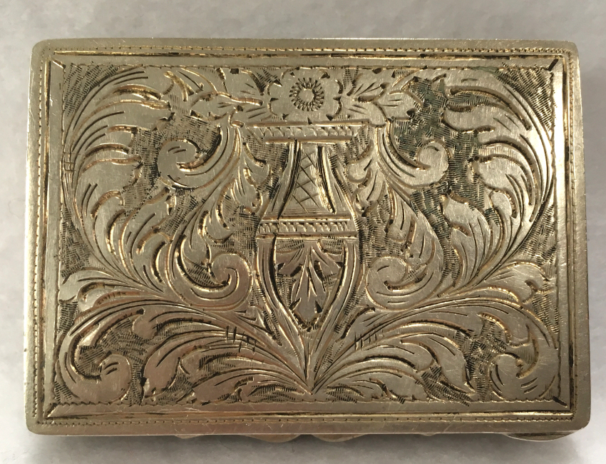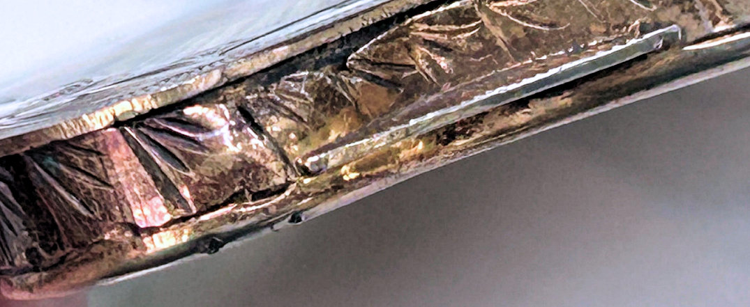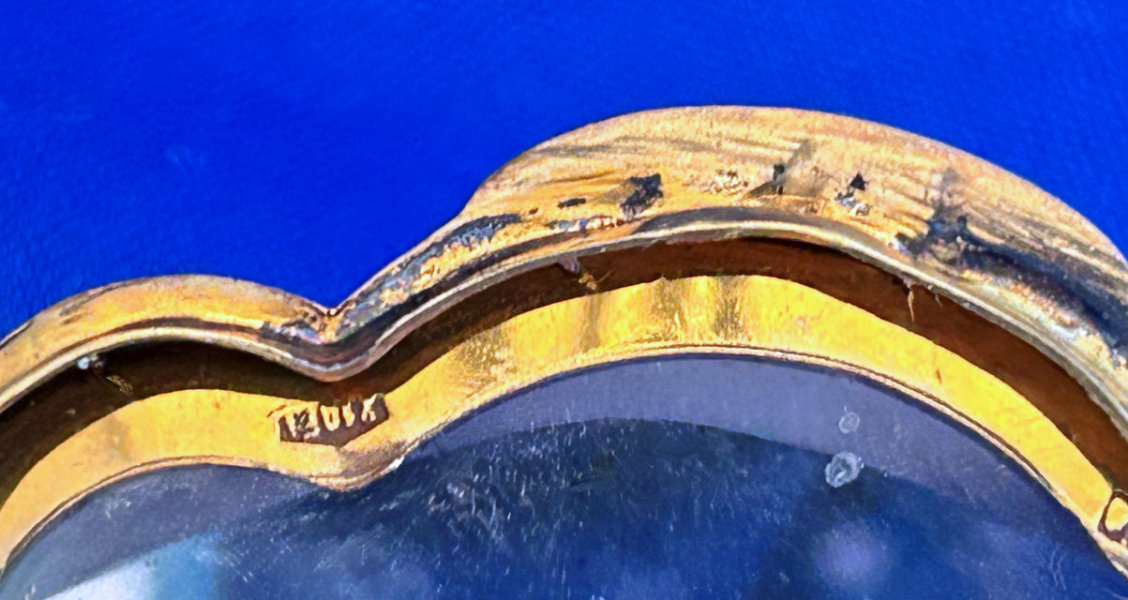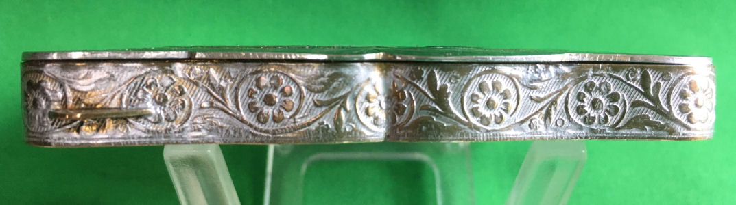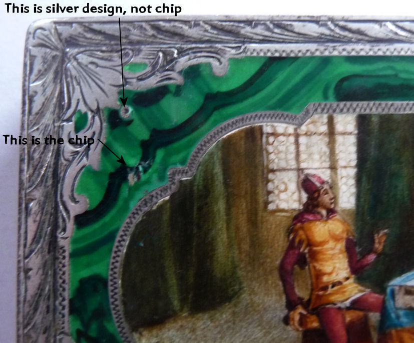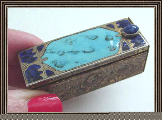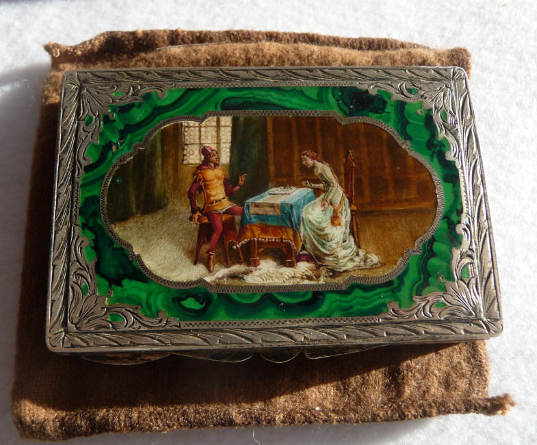 This cute little Italian sterling vermeil features a romantic couple on the lid and lots of finely inlaid faux malachite enameling around the border. Embossed daisies go all around the side and the bottom has the typical curlicue scrollwork design. Snaps shut tightly and will hold pills securely. There is a fair amount of scuffing to the surface of the enamel but it does not go through to the design. fine for viewing. Enameling has some minor scuffs from use visible with a glass or when held to light ... no significant damage anywhere. Measures 1-3/8" x 1-1/2" overall. Previously listed for $275. (Click on pic for more photos.) |