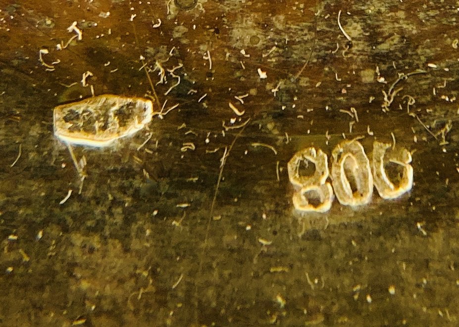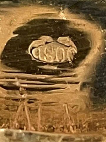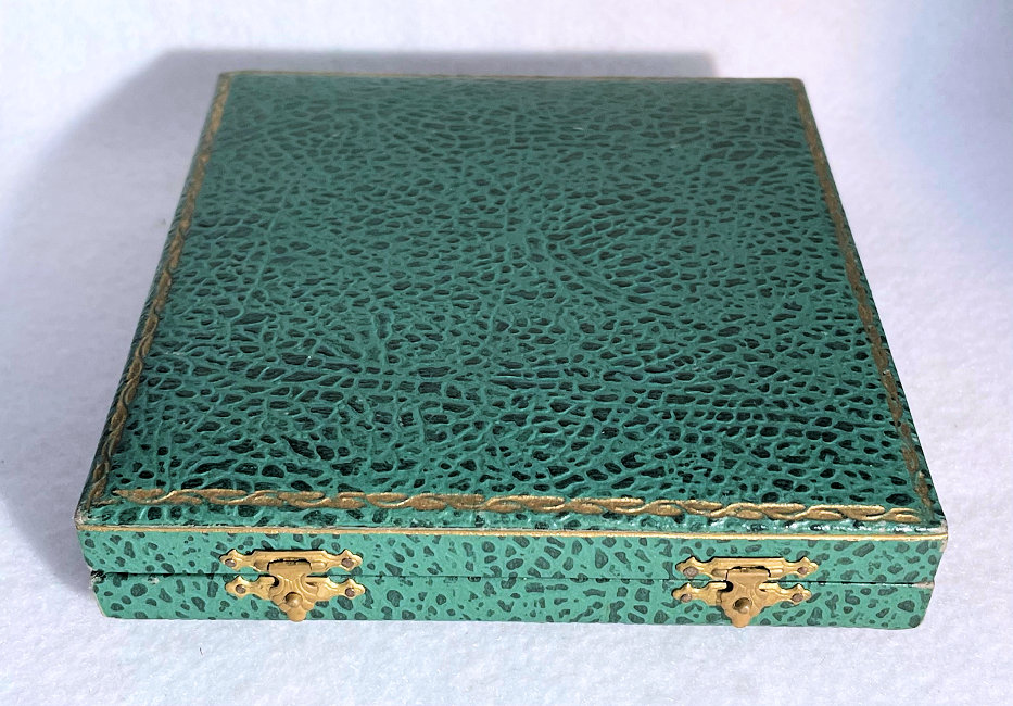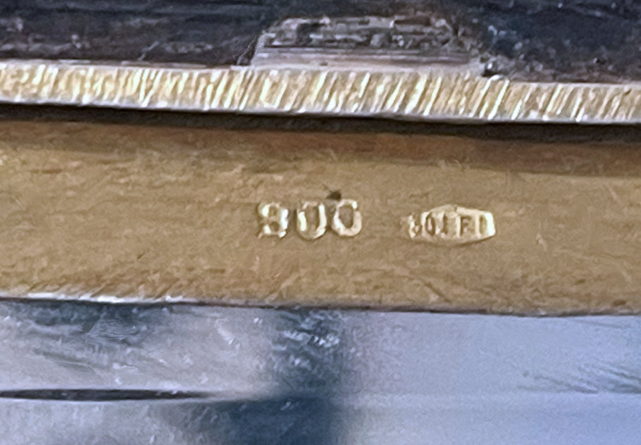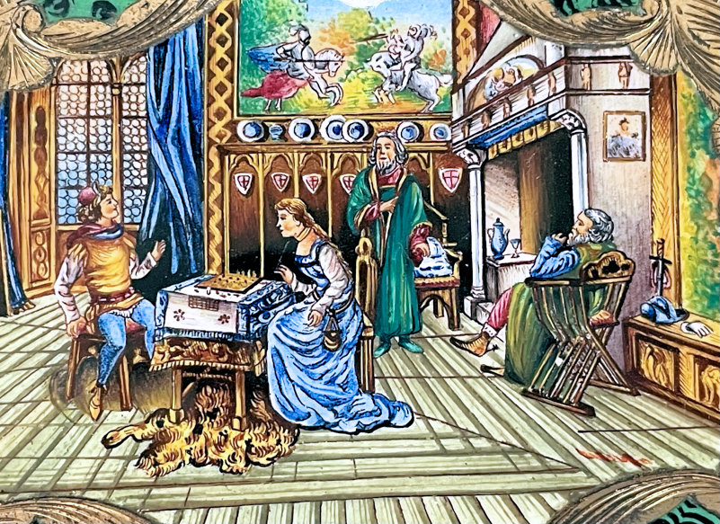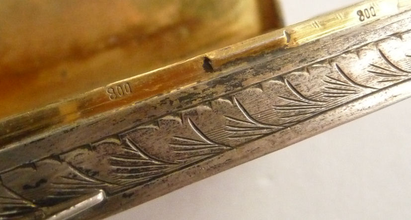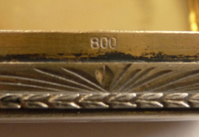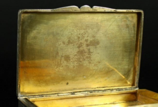 Indoor scenes are rarely found and highly prized on Italian sterling compacts. This particular one features a famous painting done circa 1881 by Gerolamo Induno titled "Uno Partita a Scacchi" or "A Game of Chess". It depicts a richly dressed couple engaged in a game of chess in an elegant room. The lady has a purse around her waist. The scene is surrounded by faux malachite enamel trim. The case is empty inside and could be used for paper money, calling cards, patches, or what have you. The entire case is richly embossed and the inside is gold vermeil which has some wear. It is marked 800 on the rim. As for condition, there are several tiny scratches on the surface that are visible when held to light. None of them are visible when looking at it straight on. There is a chip in the green border enameI in the upper left corner (close-up can be viewed in photos). Due to the rarity of the painting, I was more than happy to own this even with the flaws which don't bother me since they really are not easily noticed and I don't believe would be seen unless you look for them. Measures 3" x 2" overall. (Click on pic for more photos.) |
