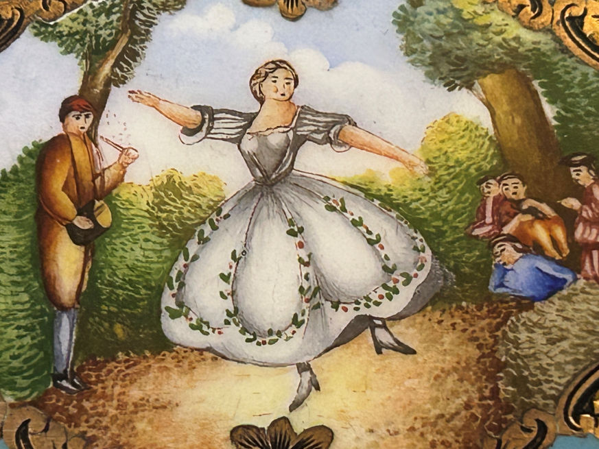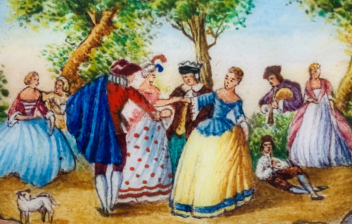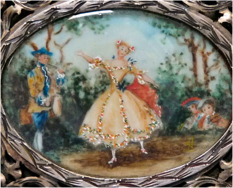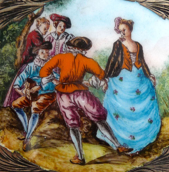 This darling Italian sterling vermeil compact features a scene of a young woman with her arms outstretched in an obvious happy dance with musicians visible in the background. The scene is a rendition of a painting done in 1730 by Nicolas Lancret (title above). The interior features an oval beveled mirror in the lid and original powder screen and swansdown puff in the base. It is stamped ITALY in the base but I can't find the 800 mark although I am sure it is sterling. It's probably too small to make out. Enameling has some very, very minor scuffs from use visible with a glass or when held to light ... no significant damage anywhere. Measures approximately 3-1/8" wide x 2-1/2" high. Previously listed for $750. (Click on pic for more photos.) |
