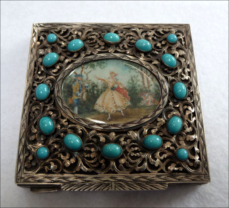 This is a very rare compact made in Italy and is all done in sterling silver. The top of the case is all filigree openwork with 16 turquoise gemstones inset all around the center vignette. The scene is handpainted (probably on ivory) and mounted under beveled glass. The scene is a rendition of a painting done in 1730 by Nicolas Lancret (title above) featuring a young woman with her arms outstretched in an obvious happy dance with musicians visible in the background. There appears to be an artists signature or initial in the lower right corner but I cannot identify it. The interior has a large beveled mirror in the lid and original powder screen in the base. Included is a new maribou feather puff. Back of the case has beautiful flowers and scrolls carved in the silver. It is in perfect condition with exception of some minor foxing on the mirror inside. Case is signed MC and 800. Measures 3-1/8" square ... it is a large compact! (Click on pic for more photos.) |