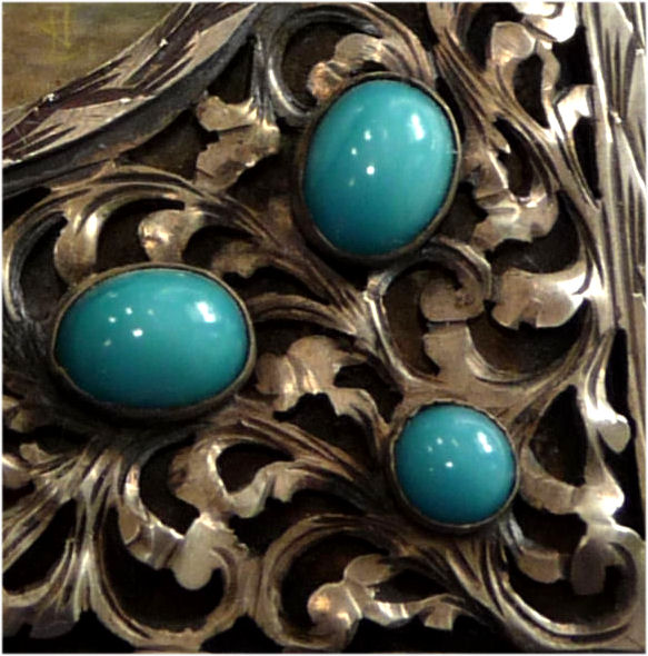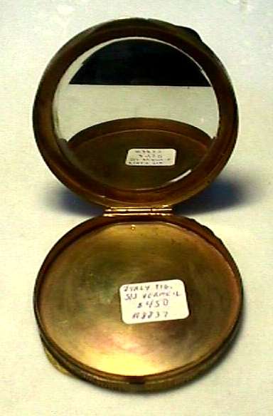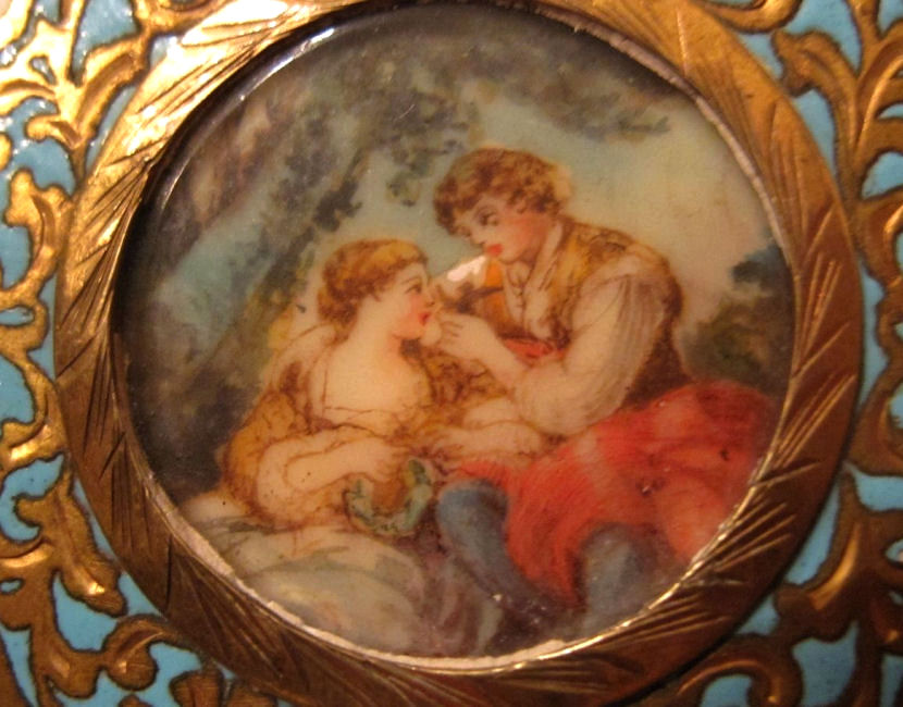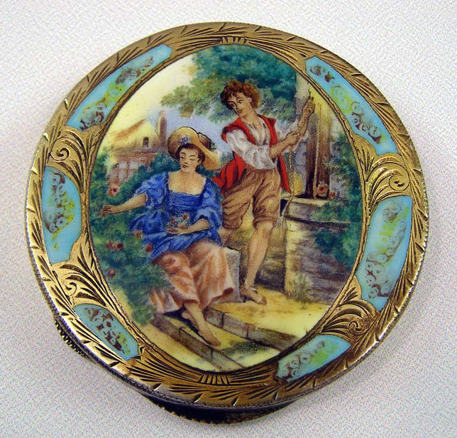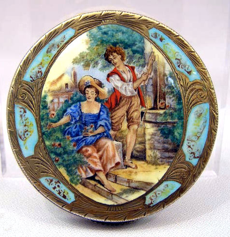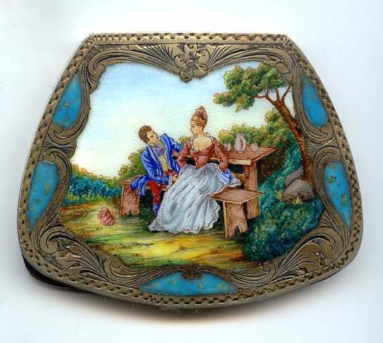 This lovely compact features a romantic couple and faux turquoise trim. The exterior has no gold vermeil at all; it is only on the inside of the compact. Compact has a beveled mirror in the lid but the silvering is pretty well shot. Base has original powder screen and puff, both used. Enameling on compact does have surface scratches in the clearcoat visible when held to light ... they do not go into the enameling. Compact measures 3-1/2" x 2-7/8" overall. Previously listed for $599. (Click on pic for more photos.) |