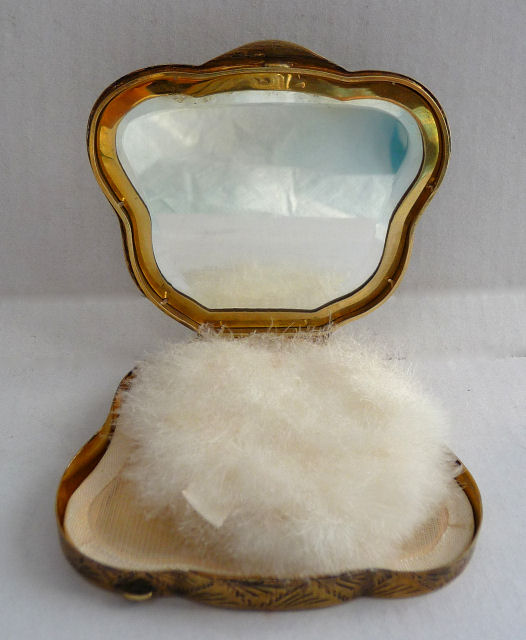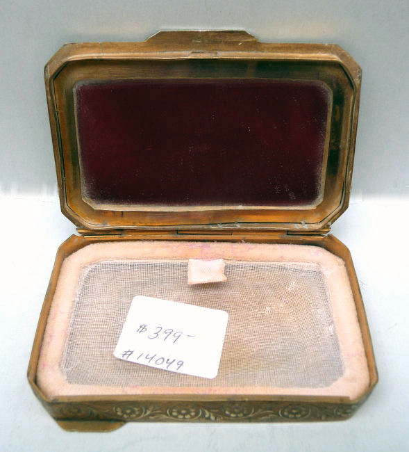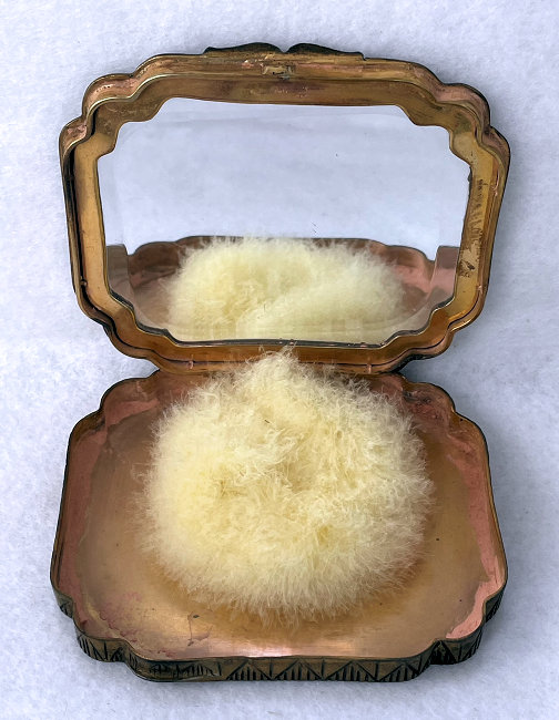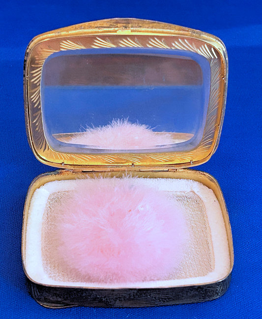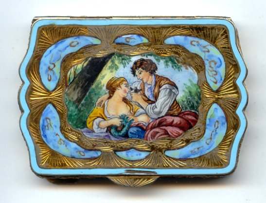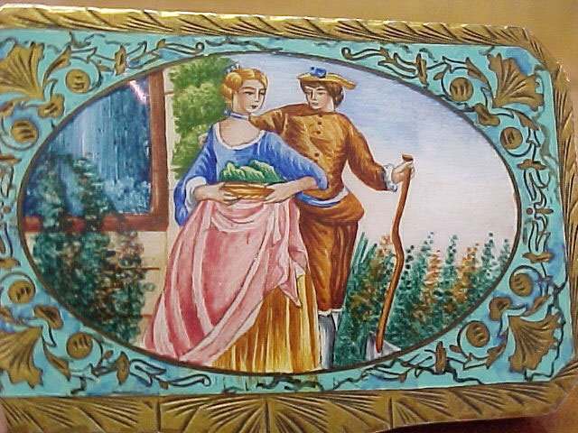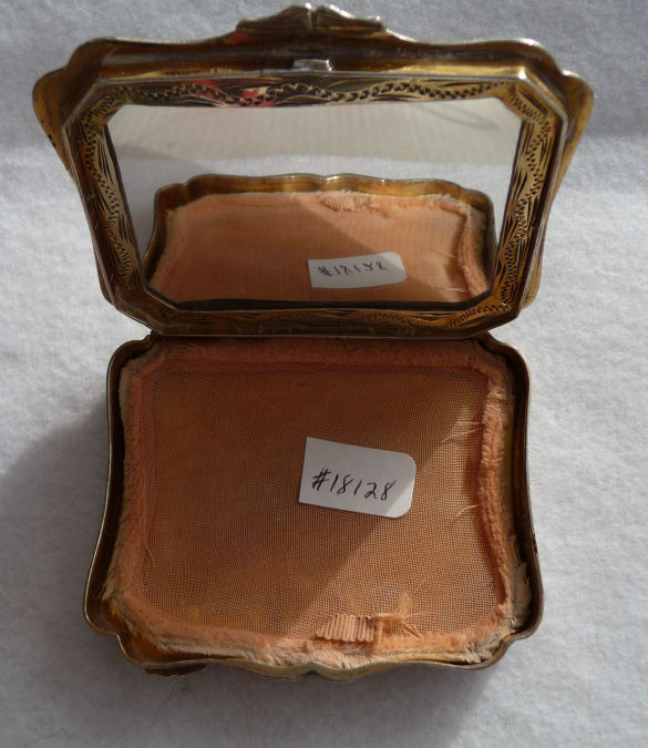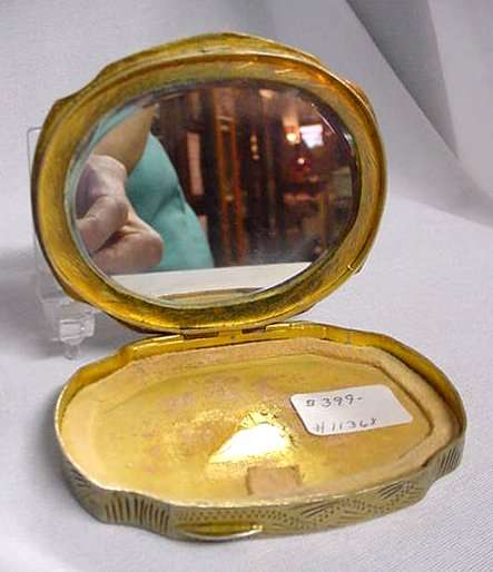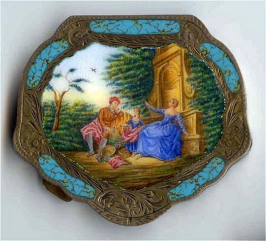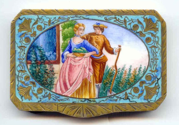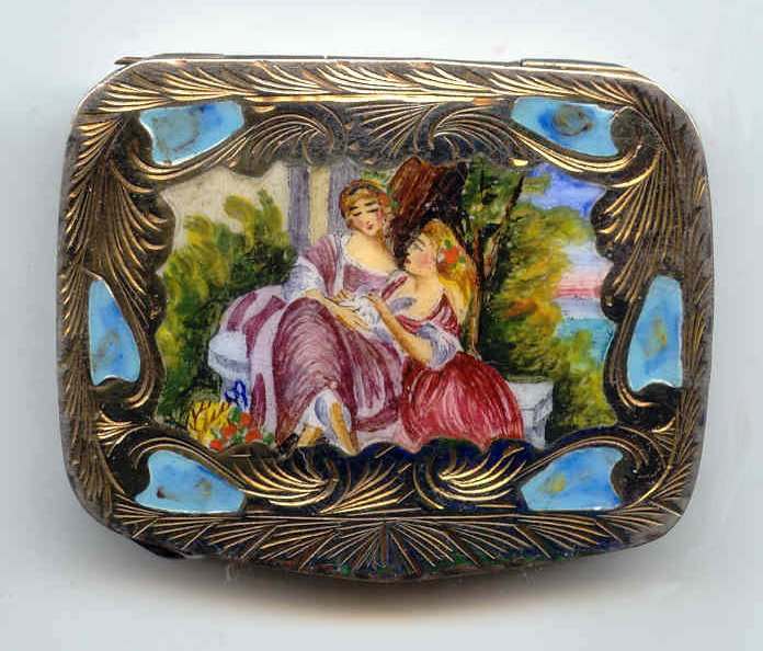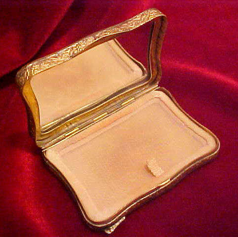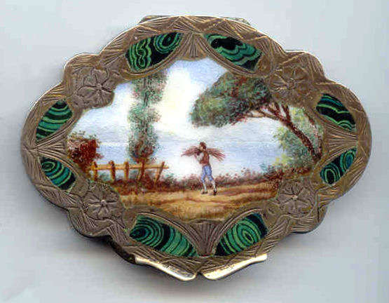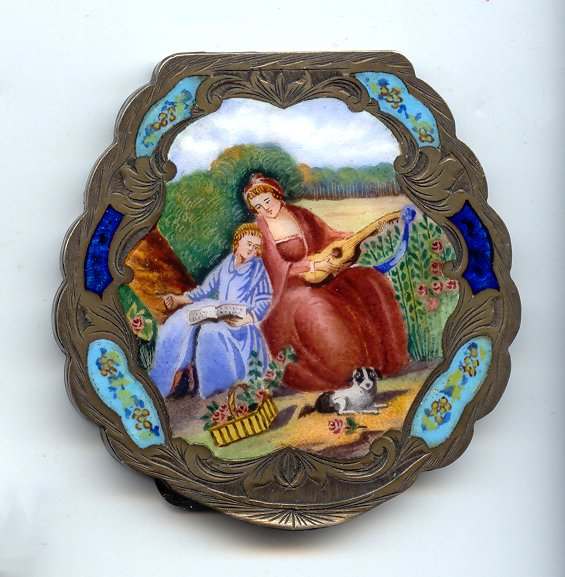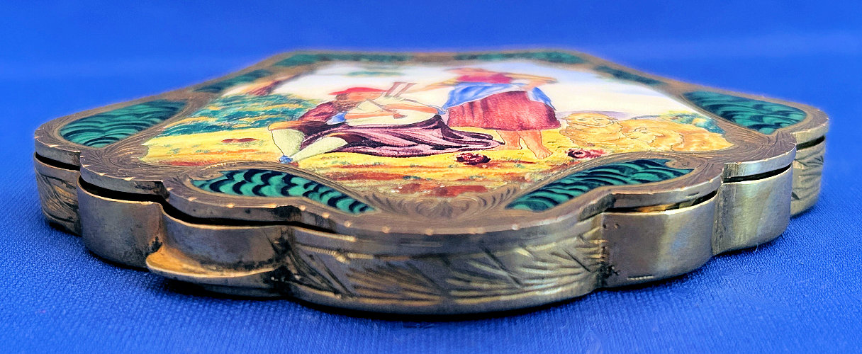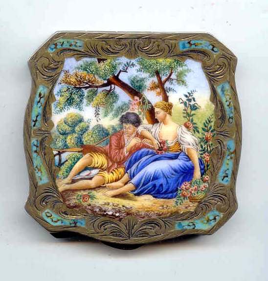 This is a beautiful case done in bright gold (probably solid brass) with faux malachite enamel around a hand-painted scene of a romantic couple with sheep. Lady's hat can be seen in the lower left corner. The interior is without a mirror and there is no sign of ever having one nor does it show any traces of powder. My guess is that this was made to hold calling cards. It is in mint condition and the enameling has no scuffs or scratches at all ... it is gorgeous! Measures 3-1/2" x 3" overall. (Click on pic for more photos.) |