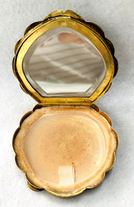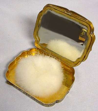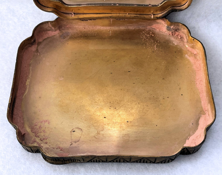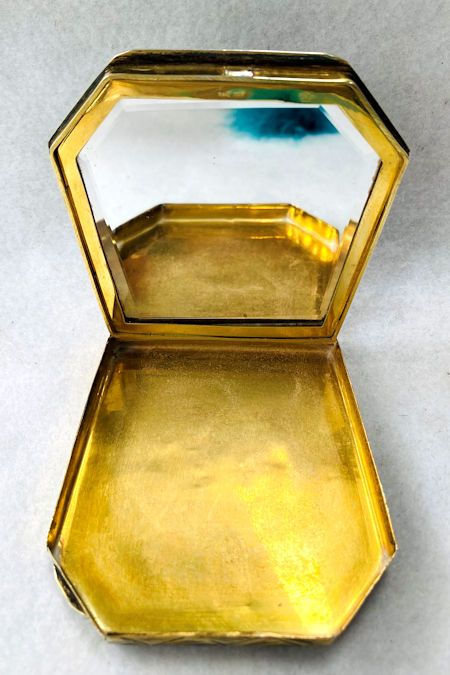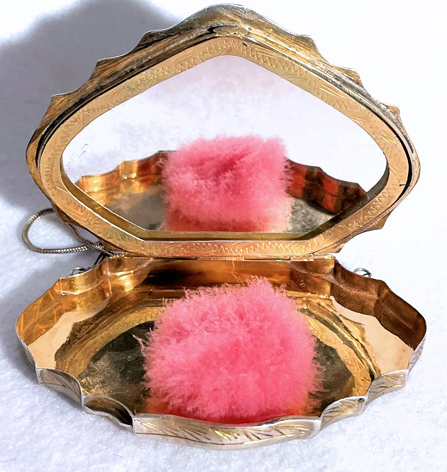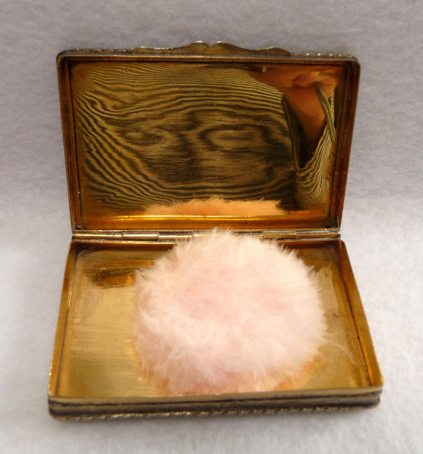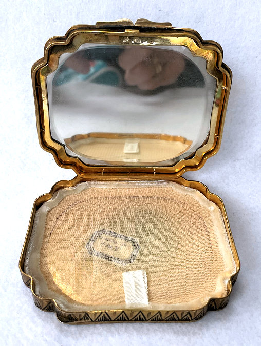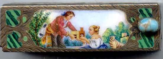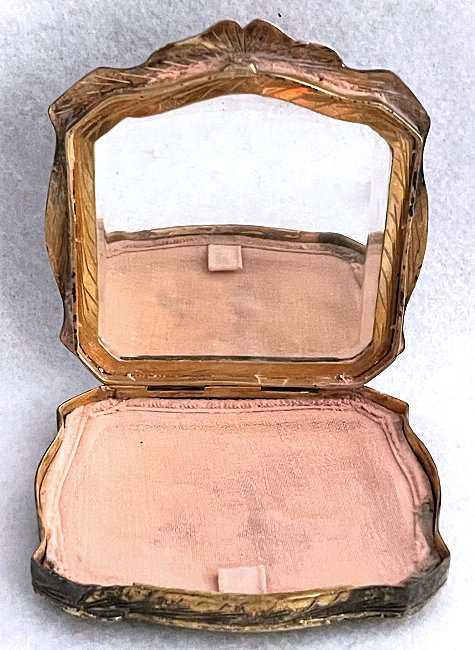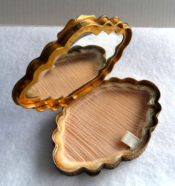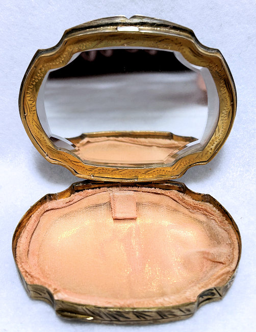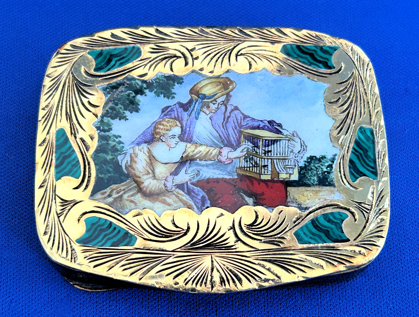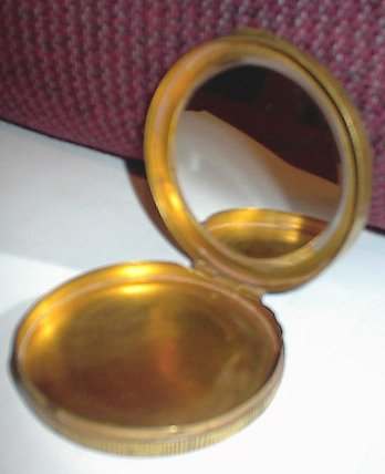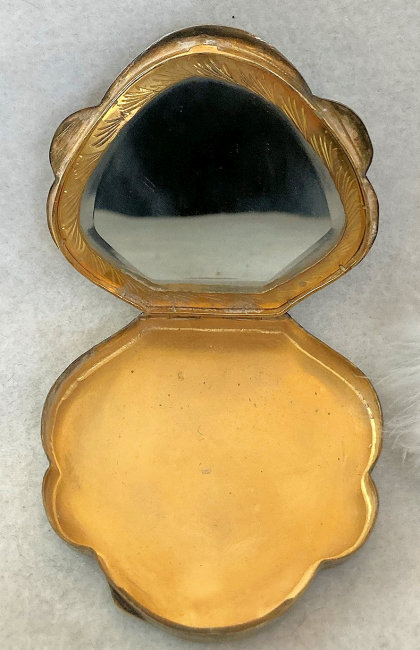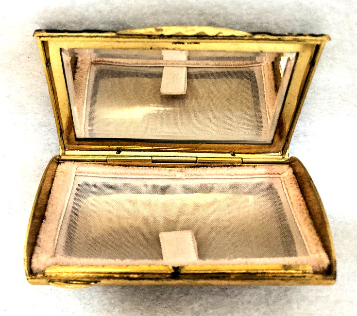 This is a beautiful case done in bright gold (probably solid brass) with faux malachite enamel around a hand-painted scene of a romantic couple with sheep. Lady's hat can be seen in the lower left corner. The interior is without a mirror and there is no sign of ever having one nor does it show any traces of powder. My guess is that this was made to hold calling cards. It is in mint condition and the enameling has no scuffs or scratches at all ... it is gorgeous! Measures 3-1/2" x 3" overall. (Click on pic for more photos.) |