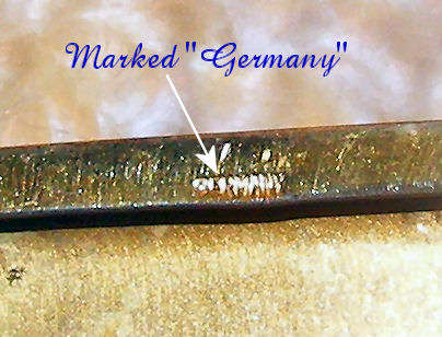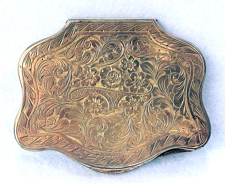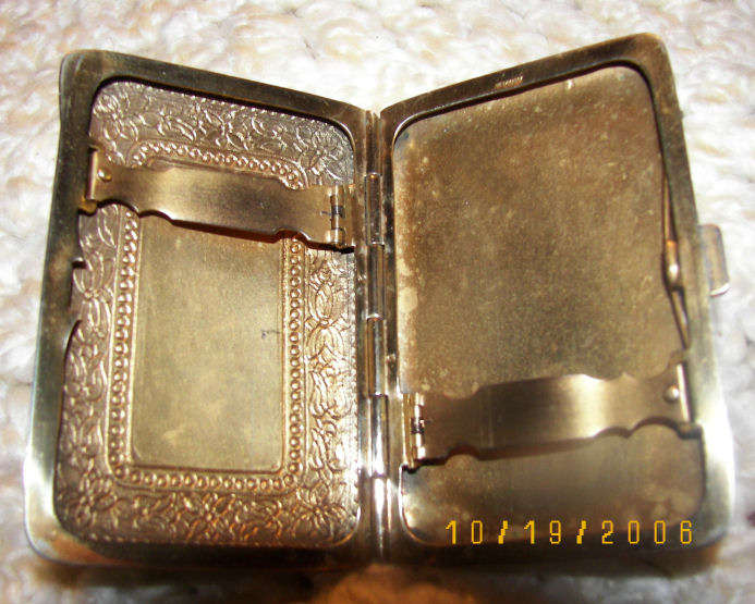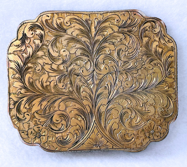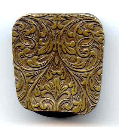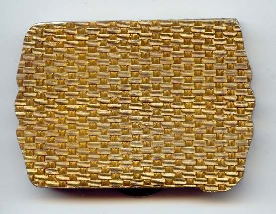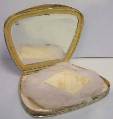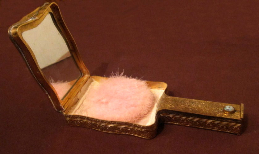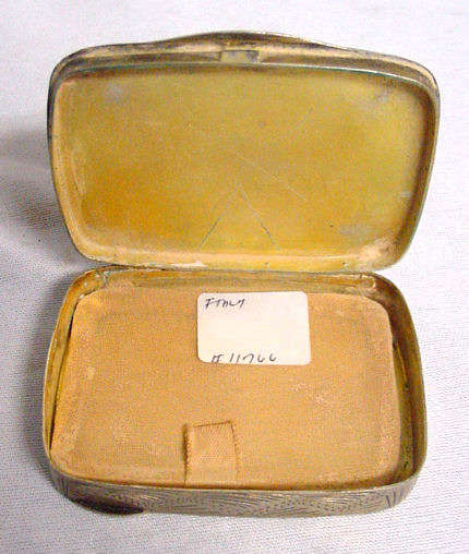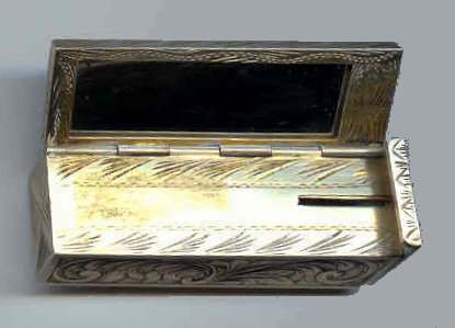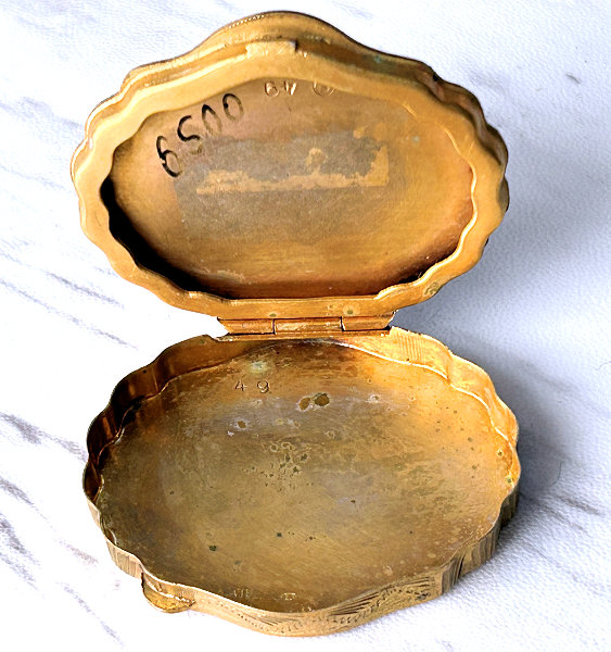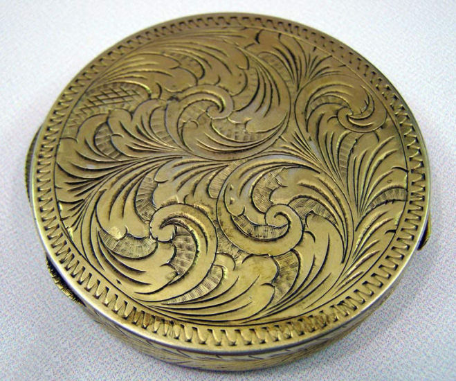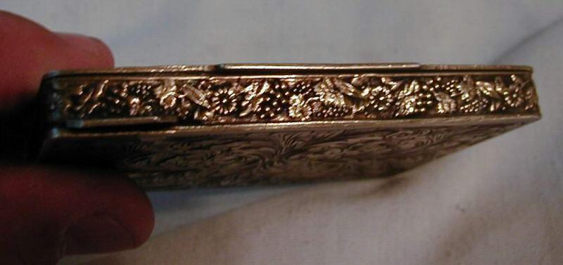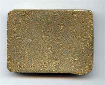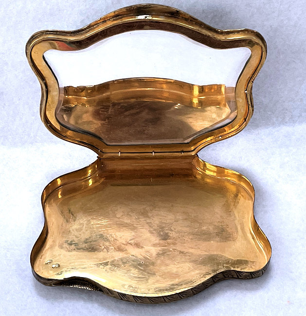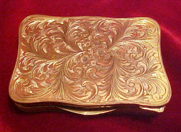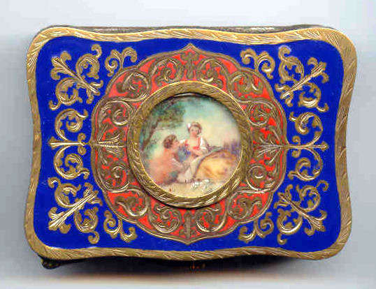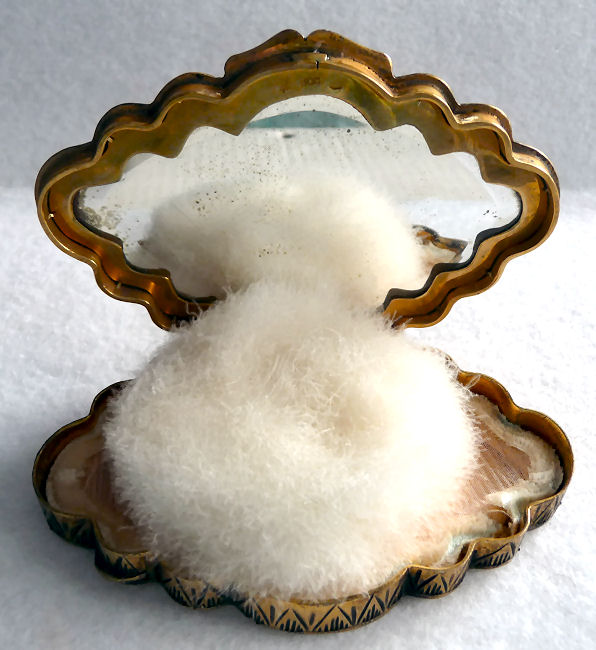 This is a beautiful case done in bright gold (probably solid brass) with faux malachite enamel around a hand-painted scene of a romantic couple with sheep. Lady's hat can be seen in the lower left corner. The interior is without a mirror and there is no sign of ever having one nor does it show any traces of powder. My guess is that this was made to hold calling cards. It is in mint condition and the enameling has no scuffs or scratches at all ... it is gorgeous! Measures 3-1/2" x 3" overall. (Click on pic for more photos.) |