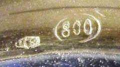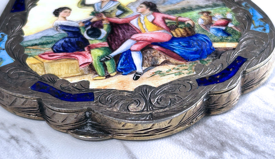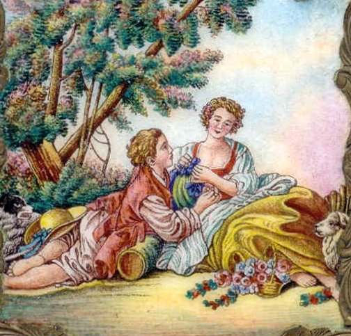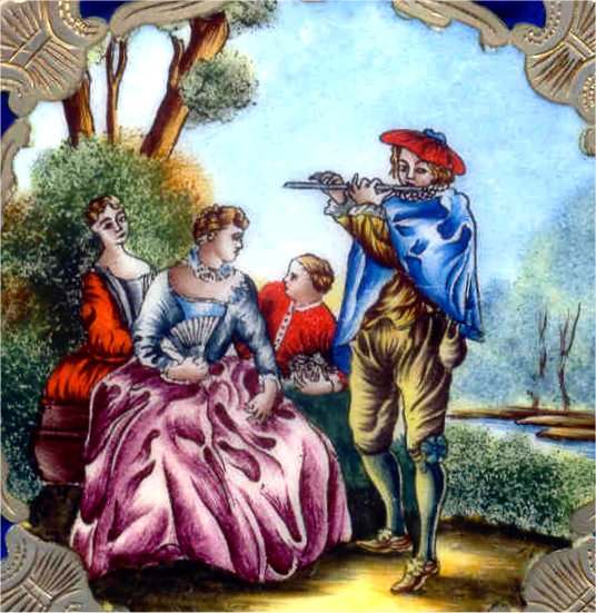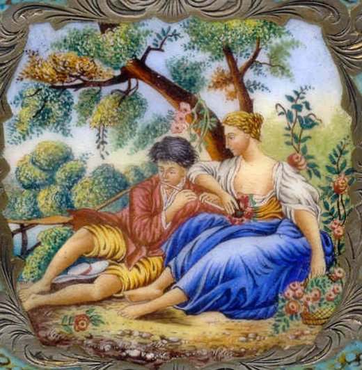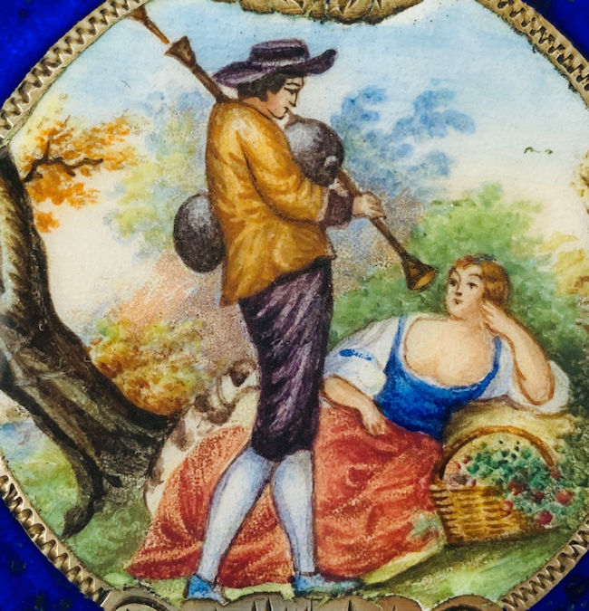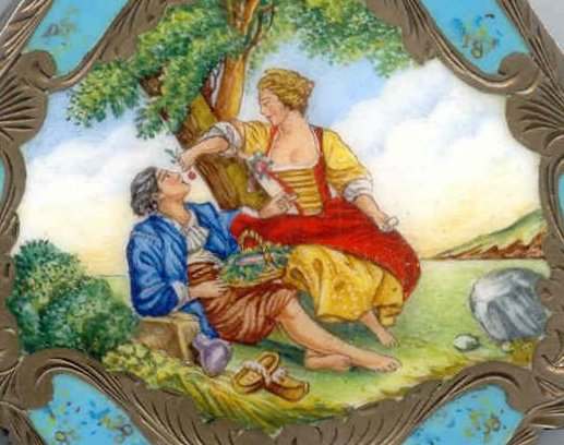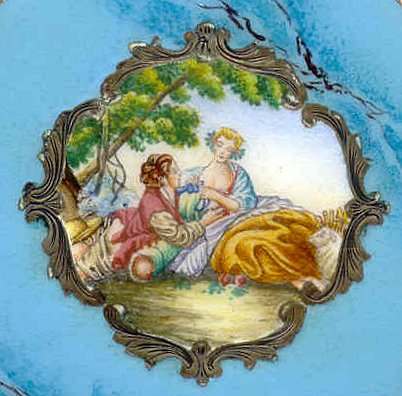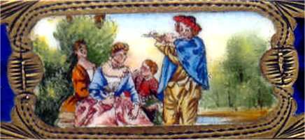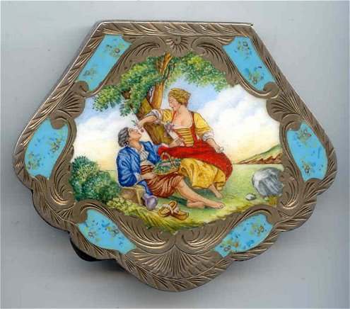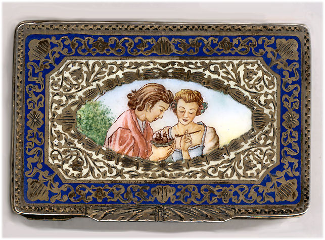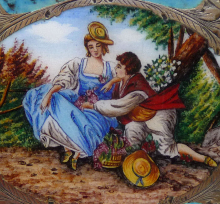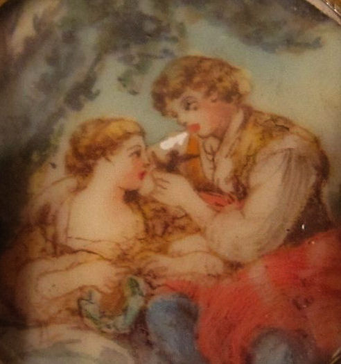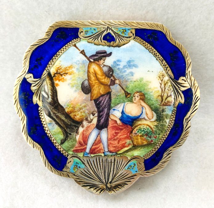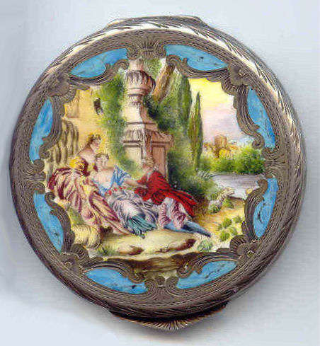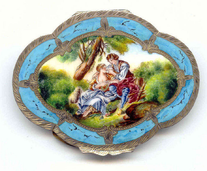 Here is a wonderful compact featuring a gentleman playing his flute for his lady's pleasure ... taken from the 1748 painting by Francois Boucher titled "Shepherd Piping to a Shepherdess." The border around the scene is a deep blue faux lapis. THe interior features a beveled mirror and a swansdown puff. The mirror has some age clouding but still usable. Marks in base are 800 and a bullet with indistinguishable marks inside. Very good condition with some surface scratches visible when held to light. Measures 3" wide x 2-3/4" high. (Click on pic for more photos.) |