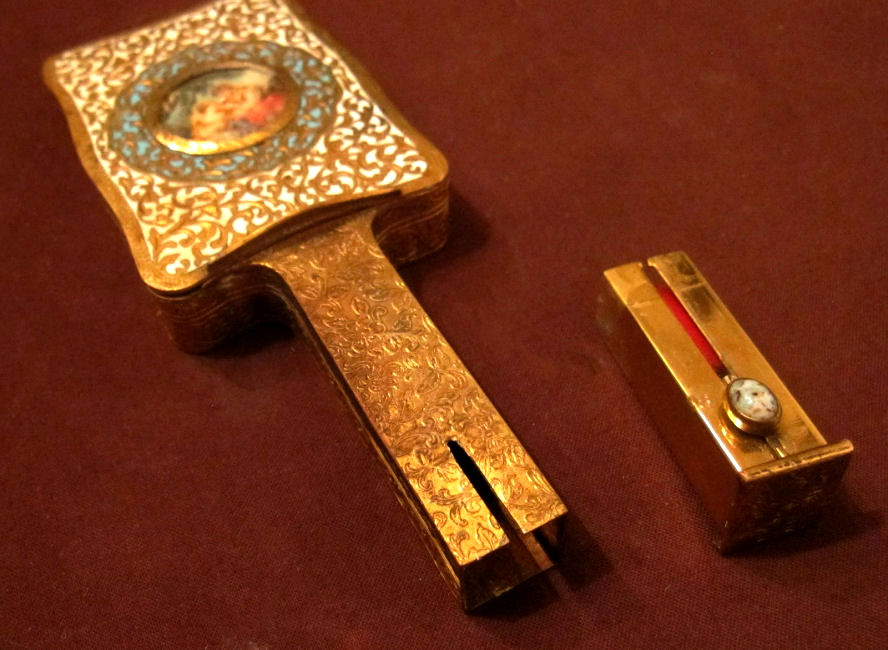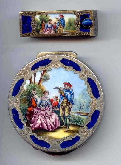 Here we have a wonderful original matched set ... a compact and jeweled lipstick featuring a gentleman serenading his lady fair while her chaperones look on. Rich cobalt enameled 'jewels' surround the scene. The matching lipstick also has cobalt ends with a sapphire cabochon jewel. Lipstick slides out and a mirror pops up for easy viewing. Interior of compact features a round beveled mirror in the lid ... marked '800 Italy.' Both pieces are in excellent condition with some minor scuffs visible on the compact when viewed with a loupe. Swansdown puff included. Compact measures 2-3/4" diameter and lipstick is 2-1/8" long. Previously listed for $950. (Click on pic for more photos.) |