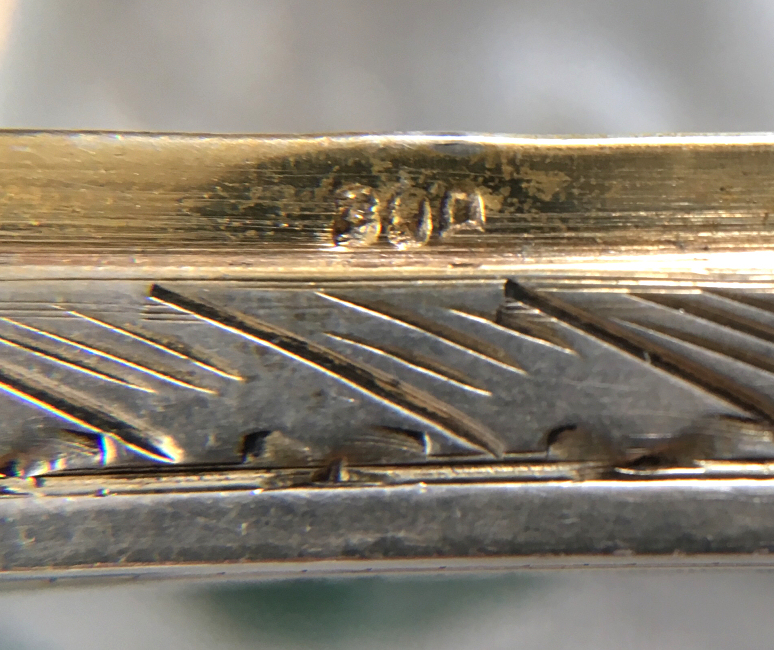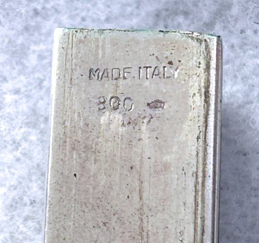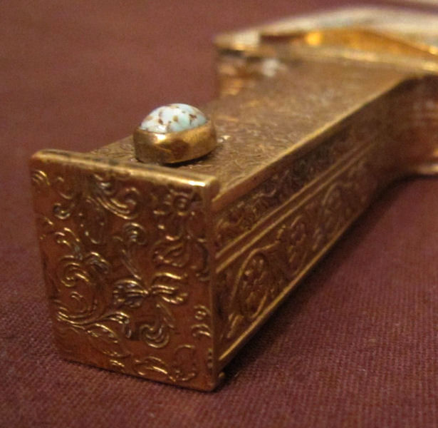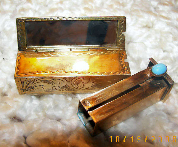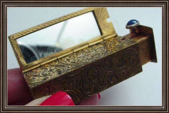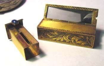 Here is a darling little lipstick case in sterling vermeil also made in Italy. Beautifully embossed sides and base with an inlaid faux malachite. The end pulls out and a mirror flips up so you can see your lips while applying the lipstick. Mirror is in great shape, enameling is all fine, and there is still lipstick (red!) in the tube. Measures approximately 2-1/4" long x 3/4" square. Previously listed for $95. (Click on pic for more photos.) |