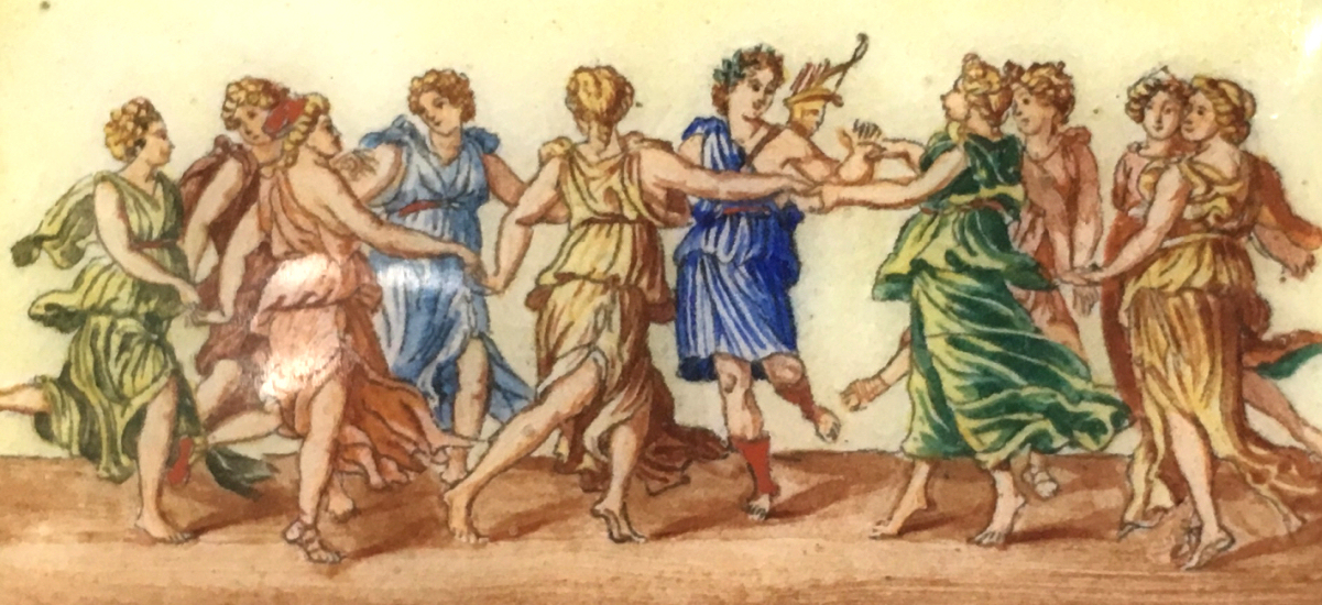 This gorgeous Italian compact has a beautiful rendition of the painting done by Francesco Bartolozzi in the early 1800's entitled "Apollo Dancing with the Nine Muses". The scene is inset in the center of an oval cloisonné in cream enamel. This is then surrounded by a deep cobalt blue enamel in cloisonné. The inside features a mirror in the lid but the original retainer is gone. The mirror also has quite a bit of silver loss but is still usable. as the center section is clear and free of any loss. The original powder screen is in the base and I am including a new maribou puff to go with it. There are a handful of scratches to the clearcoat but very hard to see even when held to light due to all the detail in the painting. Measures 3-1/4" wide x 2-3/4" high. (Click here for link to painting this was taken from) (Click on pic for more photos.) |