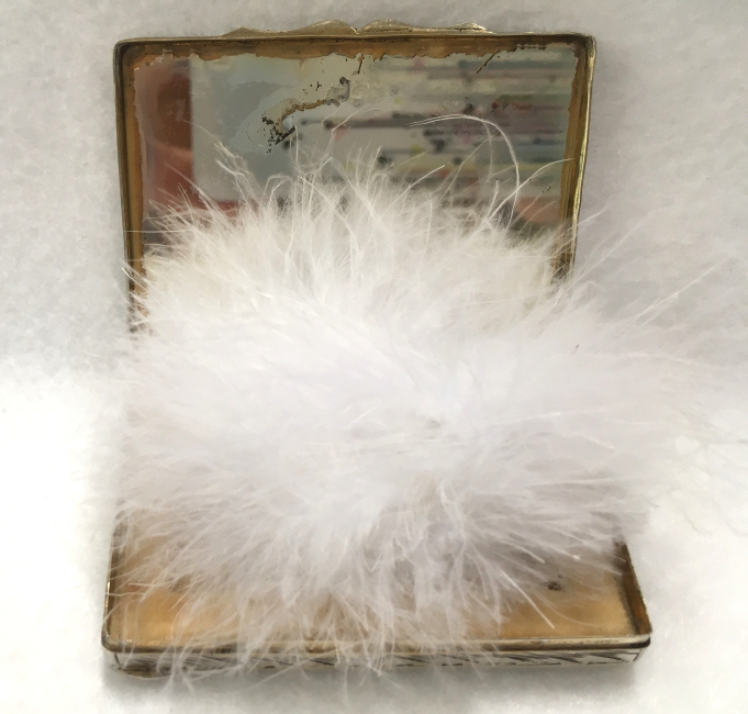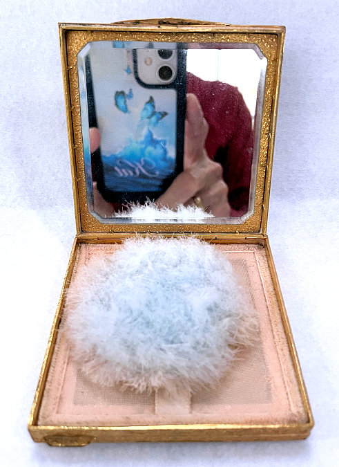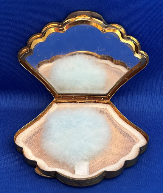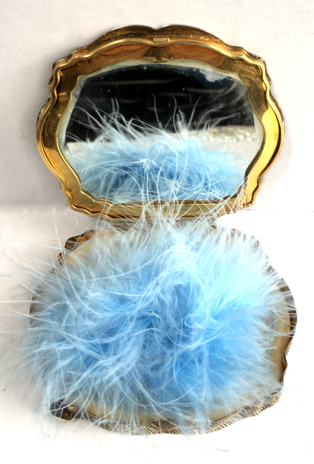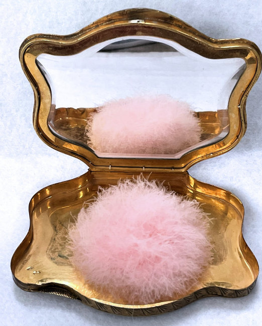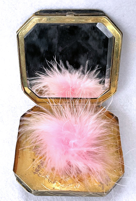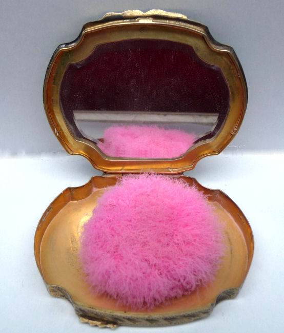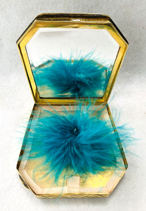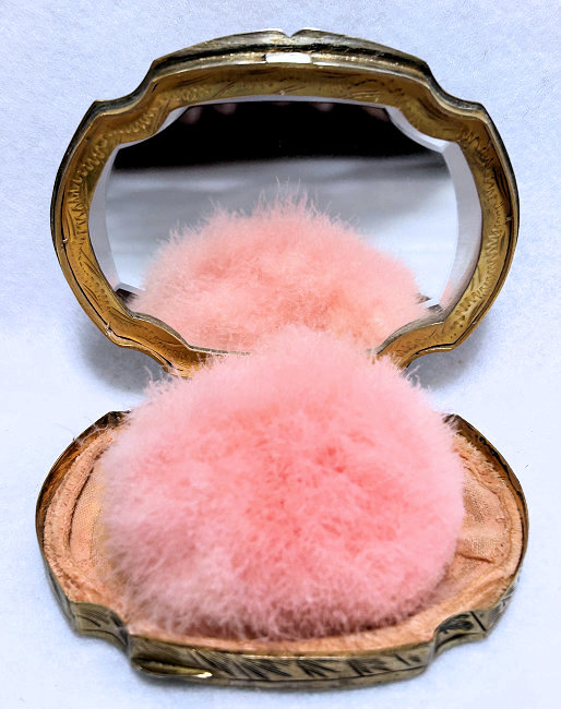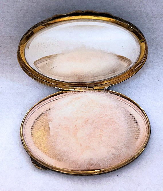 One of my very favorite paintings is this copy of Jean-Baptiste Hilaire's "La Lecture" done originally in 1781. It depicts two women in a garden setting in elegant garb ... and their pet kitty is on the pedestal on the left looking on. This compact is exquisitely shaped and the scene is surrounded in faux turquoise enameling. Inside is a shaped mirror with just a teeny mark visible on the bottom edge but is clear and usable. The original powder screen is intact and is in excellent condition and I have added a lime green maribou puff to go with it. Condition is extraordinarily good with no noticeable wear worth mentioning at all. This is a large compact measuring 4" across x almost 3-1/2" high. (Click on pic for more photos.) |