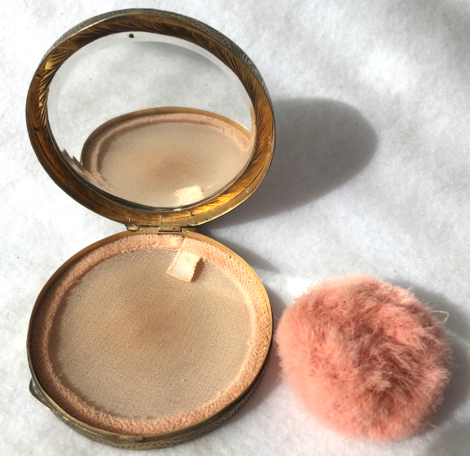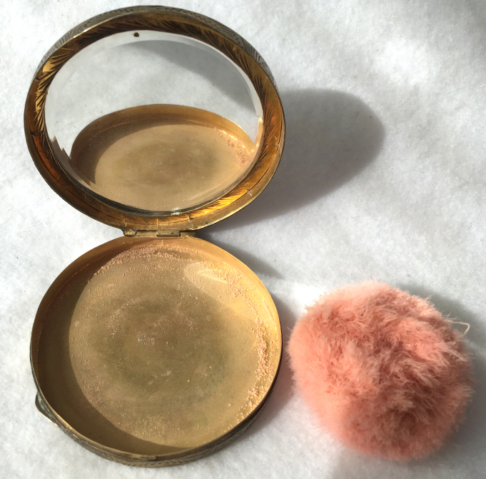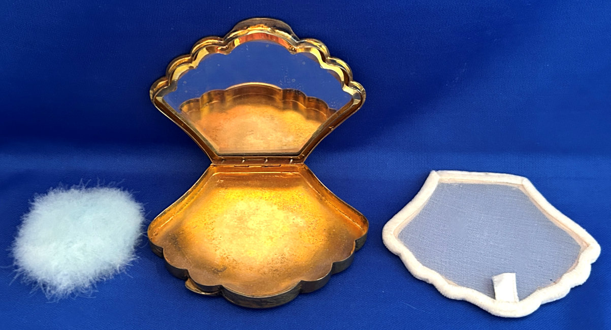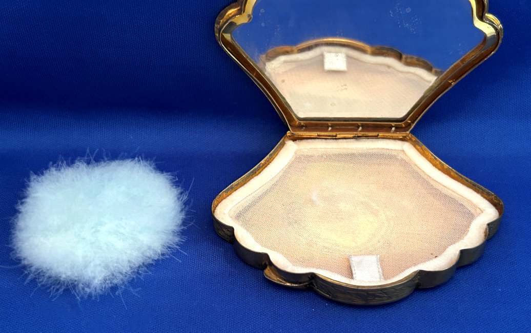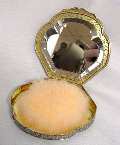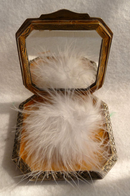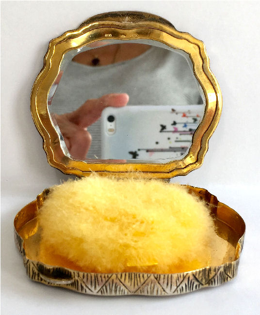 One of my very favorite paintings is this copy of Jean-Baptiste Hilaire's "La Lecture" done originally in 1781. It depicts two women in a garden setting in elegant garb ... and their pet kitty is on the pedestal on the left looking on. This compact is exquisitely shaped and the scene is surrounded in faux turquoise enameling. Inside is a shaped mirror with just a teeny mark visible on the bottom edge but is clear and usable. The original powder screen is intact and is in excellent condition and I have added a lime green maribou puff to go with it. Condition is extraordinarily good with no noticeable wear worth mentioning at all. This is a large compact measuring 4" across x almost 3-1/2" high. (Click on pic for more photos.) |