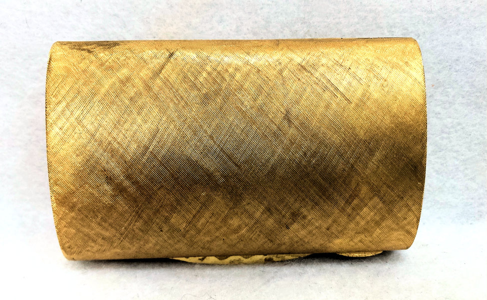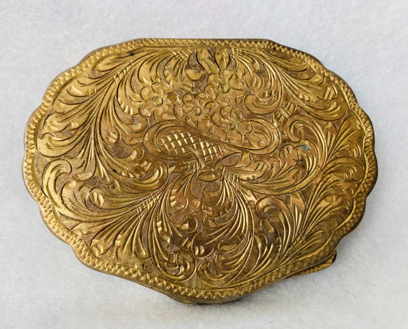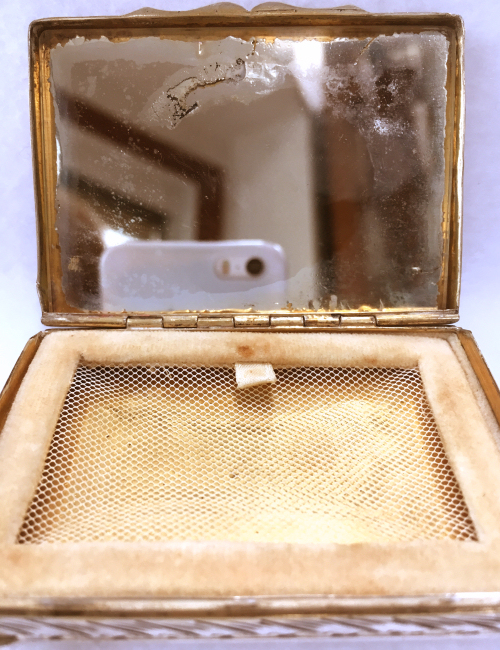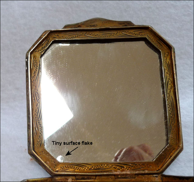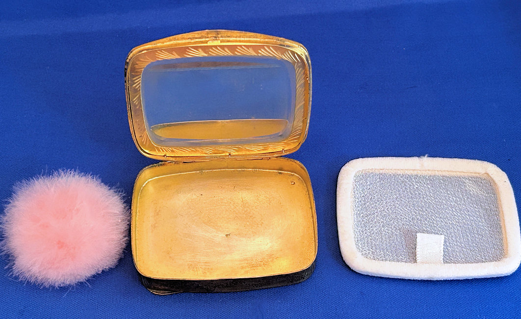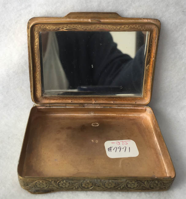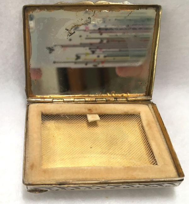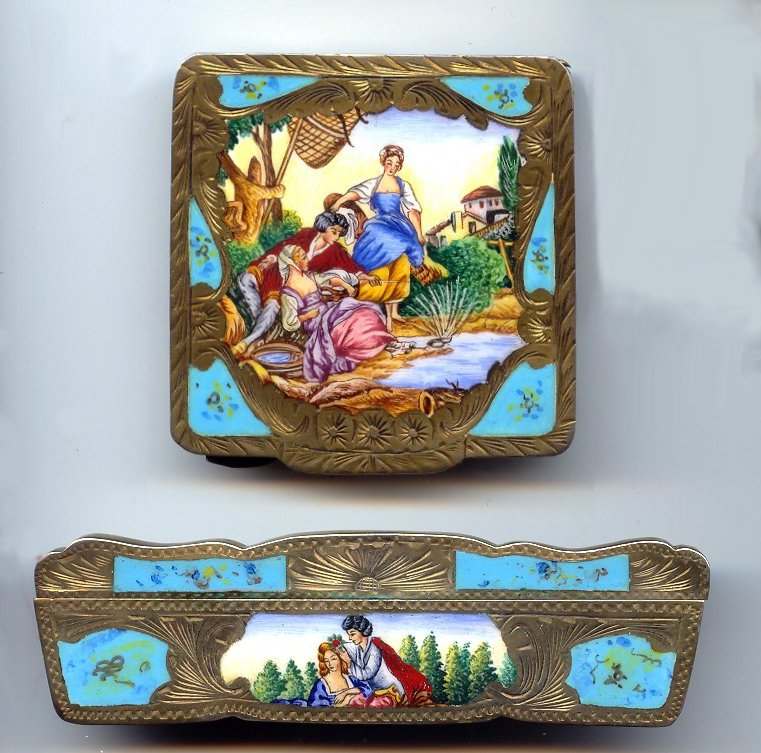 This is a beautiful case done in brass with blue enameling around a center painting of a scene from Fragonard's Progress of Love series. The painting is nicely done and is very detailed. The case is all embossed with swirls on the bottom and stamped flowers around the sides. Inside is a beveled mirror in the lid and an original powder screen in the bottom. While the compact presents very nicely, it does have some scratches in the painting which are visible when held to light but not in photos. There is also a chip in the lower right corner in the blue portion. These are taken into consideration when pricing which is below what I paid for it. Measures 3-1/8" x 2" overall. (Click on pic for more photos.) |