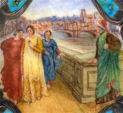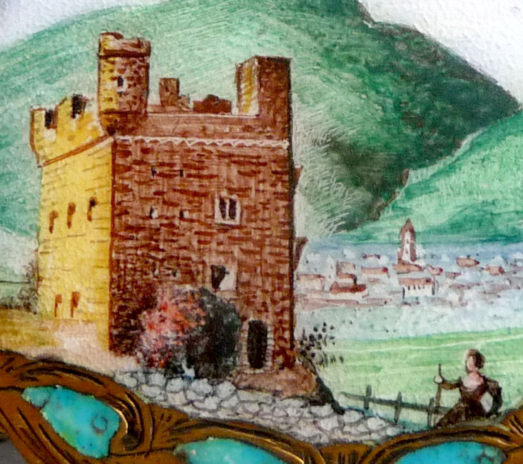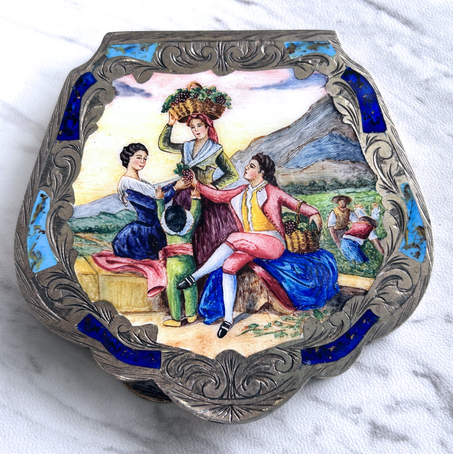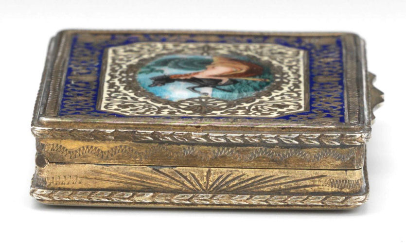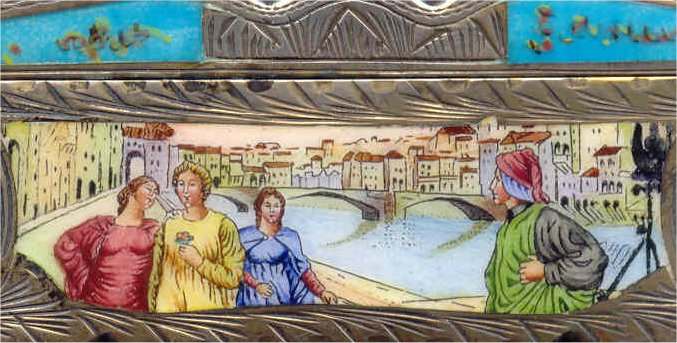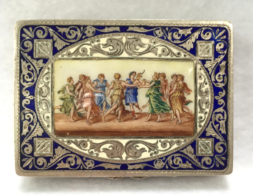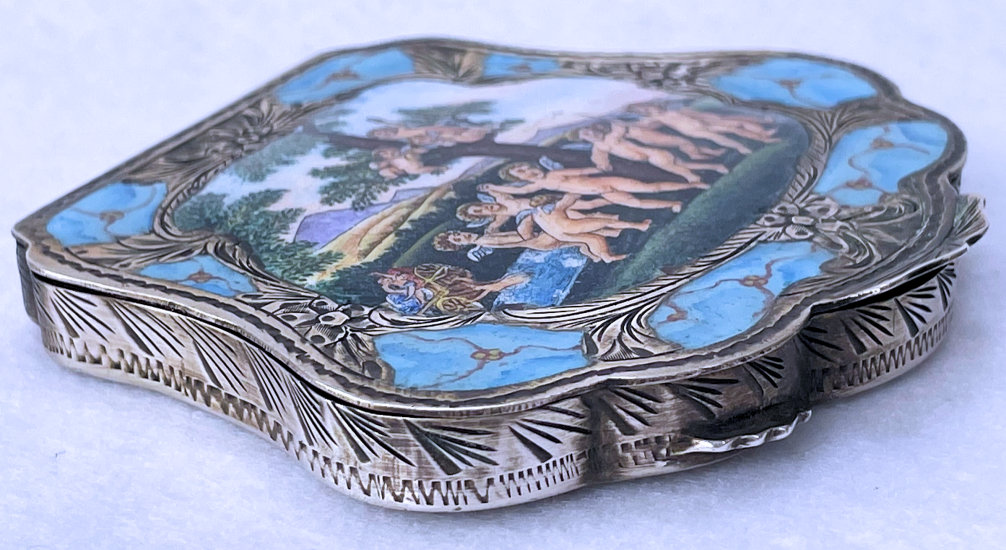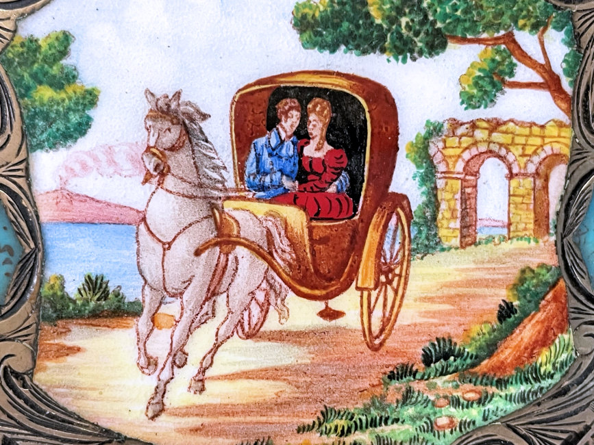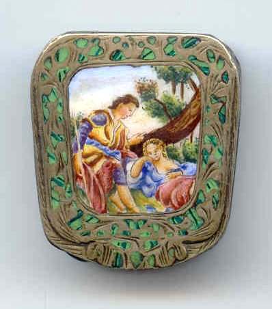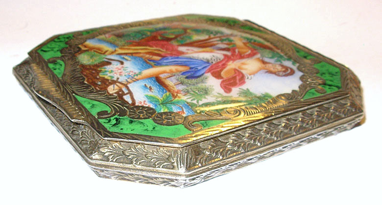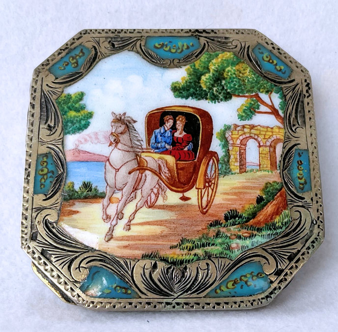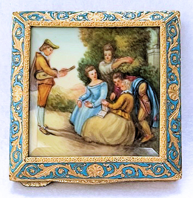 Here is another very rare scene depicting a romantic couple out for a carriage ride pulled by a beautiful white stallion. This is a scene that I have only seen one other time and that was on a website somewhere. I believe it to be extraordinarily rare as is the one right above. I'm sure it is a rendition of a long ago painting but I could not identify it. In any case, it is square shaped with cropped corners. The scene is surrounded in faux turquoise enamel. The inside has a shaped beveled mirror in the lid and a new maribou feather puff. It is marked 800 and has a lozenge mark for Florence, Italy, on the rim of the mirror. To my eye, the enameling on this is mint. I cannot see any scratches or scuffs at all. Measures 3" square.. (Click on pic for more photos.) |