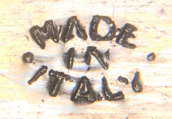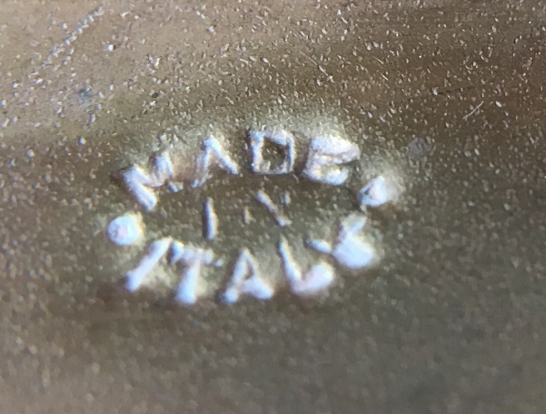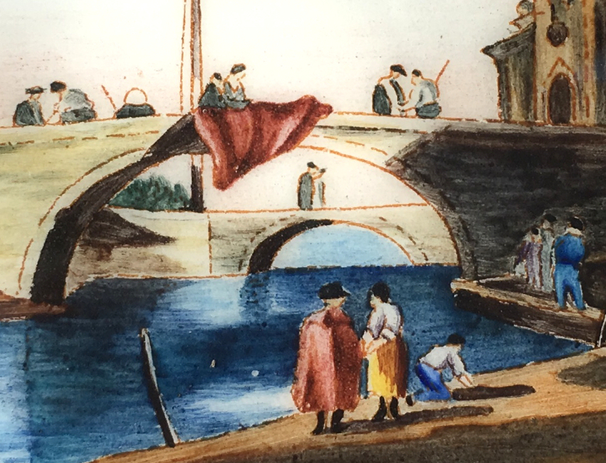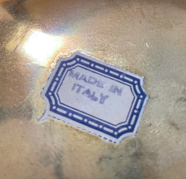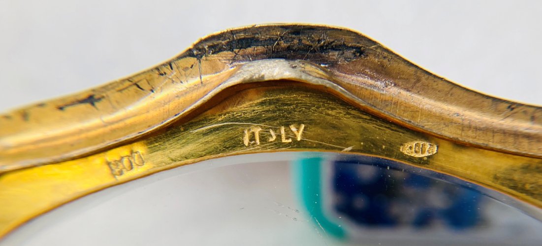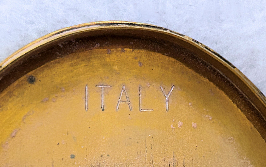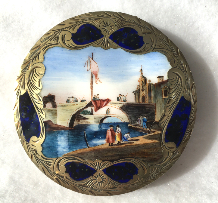 This lovely compact features a hand-painted scene of a pair of arched bridges, probably in Venice, with several people visible on the bridge and in the foreground ... it is a scene I have never seen before in all my years of collecting so I believe it is pretty rare. It was copied from a painting done by Francesco Guardi done in 1750 entitled Town with a Bridge. The border is a rich deep blue faux lapis enamel. The case is ornately embossed on all sides. The interior is done in gold vermeil and has a beveled mirror in the lid. The original powder screen and a little feathery puff are still inside as well. It is stamped 800, Made in Italy, and a hallmark that I cannot identify but am working on it. Comes with a little grey felt sleeve to protect it. I would say the enameling is in mint condition as there are no scratches that I can see on the main painting at all. There are some strange "spots" on the deep blue (you can see some on the left edge) but they appear to be in the manufacturing and are not damage that I can feel although they look a bit unusual, perhaps a glaze miss even though it is smooth to the touch. Odd! Thisis a really beautiful compact. Measures 2-3/4" diameter. (Click on pic for more photos.) |