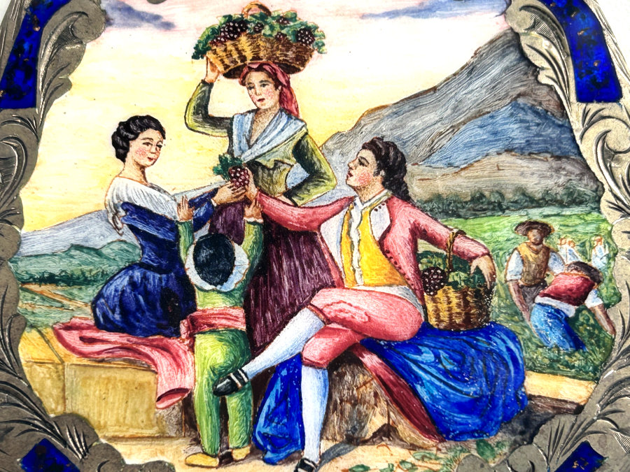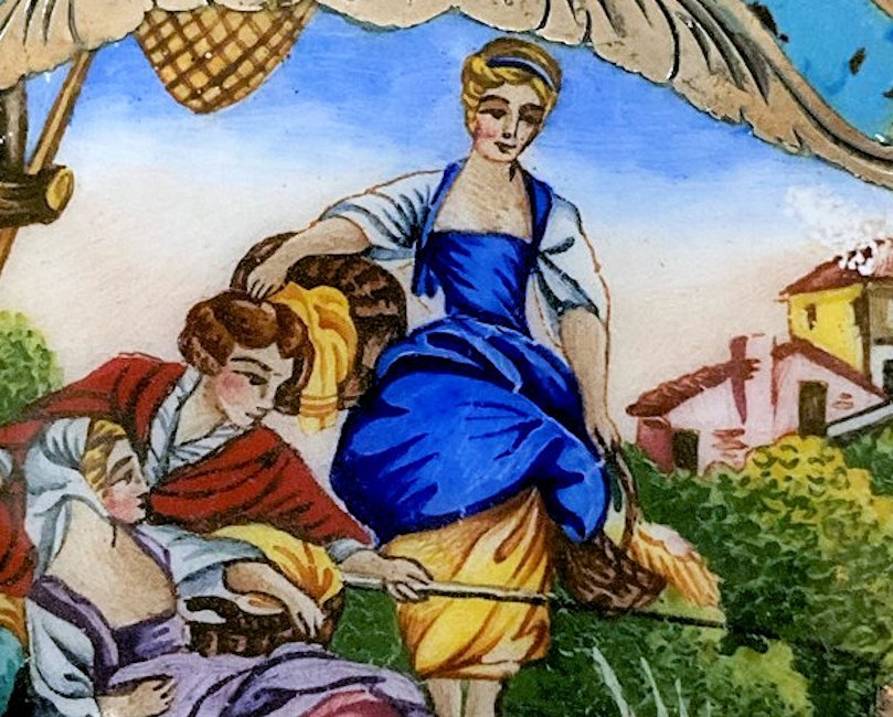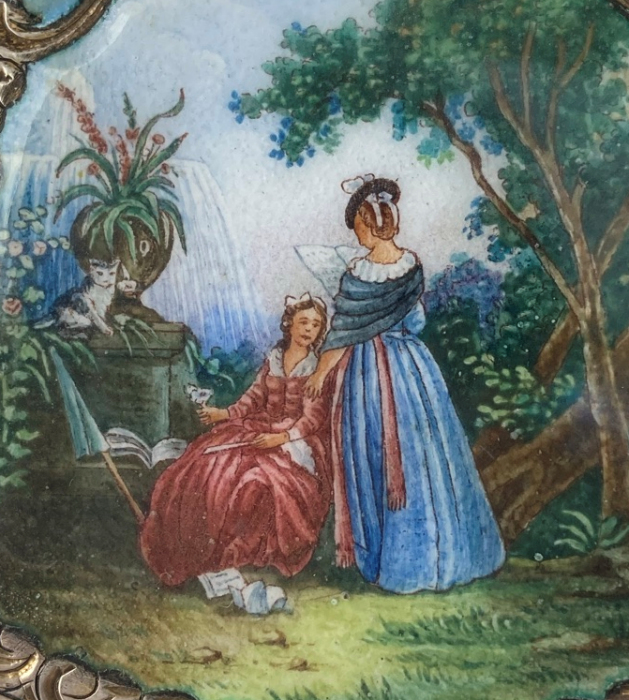 This is a more unusual scene to find on an Italian sterling vermeil compact ... it features five people in a park setting. The two seated ladies appear to be studying a book while a tutor leans over, another is picking flowers, and a fifth stands by with his mandolin in hand ready to play a tune. A tiny dog can be seen reclining on one side and a lake can be seen with a village far off in the background. Behind the group is a large statuary figure as part of the park setting. Faux turquoise surrounds the tranquil scene. Interior has a wide-beveled shaped mirror (there is a small chip in the underside of the mirror on the lower right) and swansdown puff in base. It is in very fine condition with only very, very minor superficial scuffs visible when held to light. Measures 3-3/8" x 3" overall. Previously listed for $1,250. (Click on pic for more photos.) |