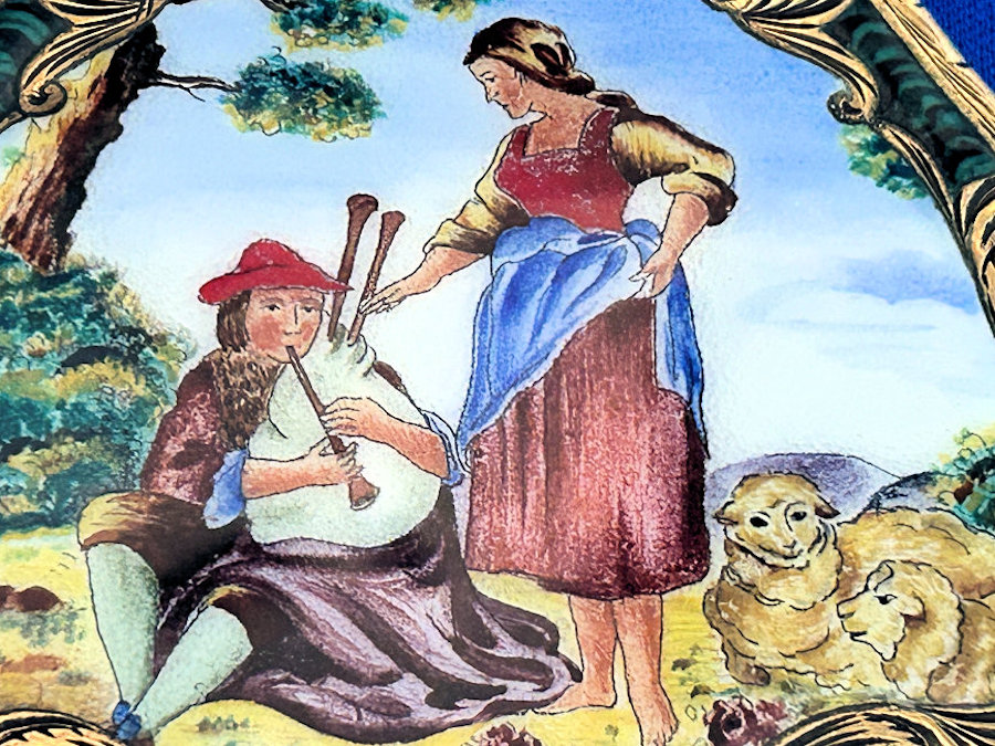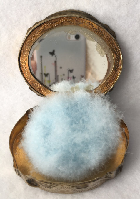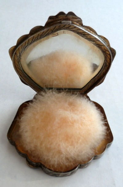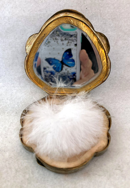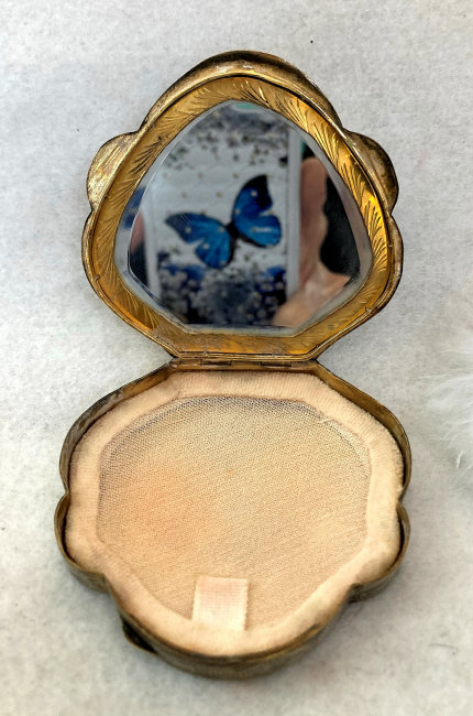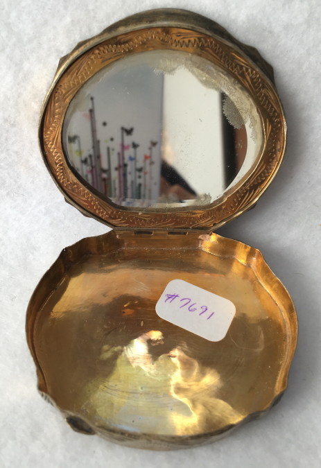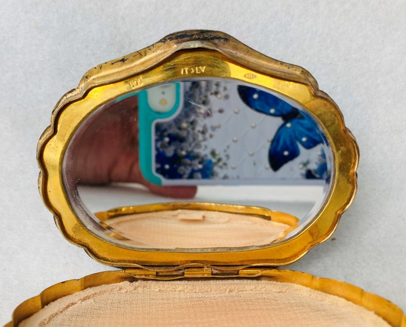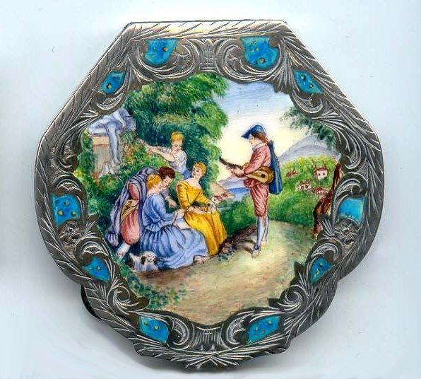 Over the years I have seen hundreds -- if not thousands -- of variations of a reclining woman with a man serenading her with various instruments from flutes to guitars. But I have never seen one where the man was playing bagpipes (or at least that is what this appears to be). There is even a dog looking on next to the lady's skirt. It is beautifully detailed and the scene is surrounded by a deep cobalt blue with turquoise accents. Inside there is a lovely shaped beveled mirror and a powder screen in the base. It is marked 800 on the rim of the mirror. Condition overall is excellent; ;in fact, I would call it pristine as there are no visible scratches that I can discern. The surface is like glass. This is a rare compact that would be a unique one-of-a-kind addition to any collection! Measures 2-7/8" wide x 2-5/8" high. (Click on pic for more photos.) |