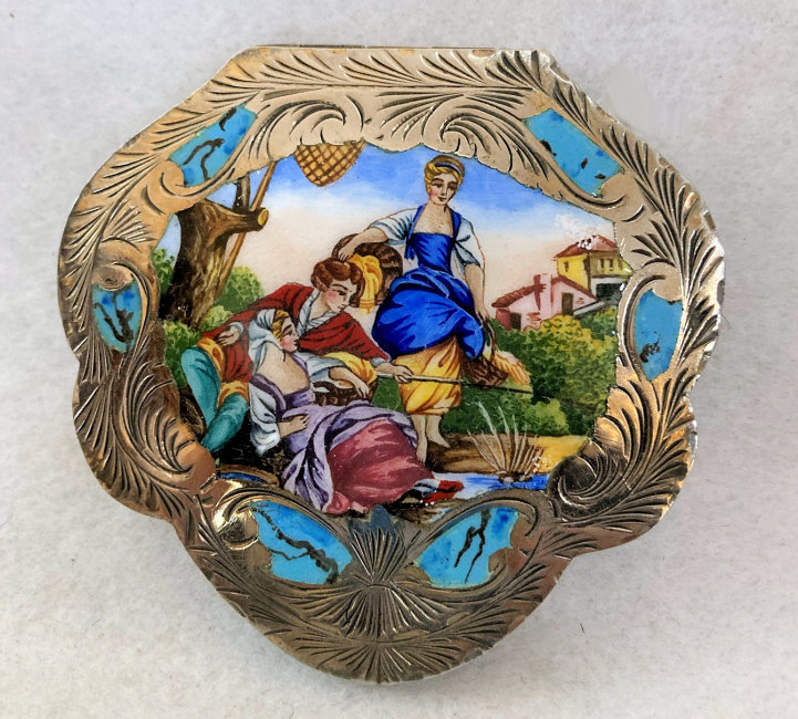 This is a pretty scene featuring a famous painting done by Francois Boucher in 1737 entitled "Charms of Country Life". Interior features a round beveled mirror in the lid in excellent condition. Base has a full powder pat and puff. Enameling on lid has surface scratches visible when held to light. Measures 2-3/4" diameter. Previously listed for $650. (Click on pic for more photos.) |