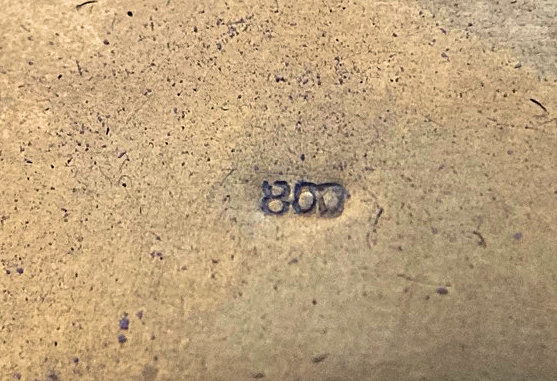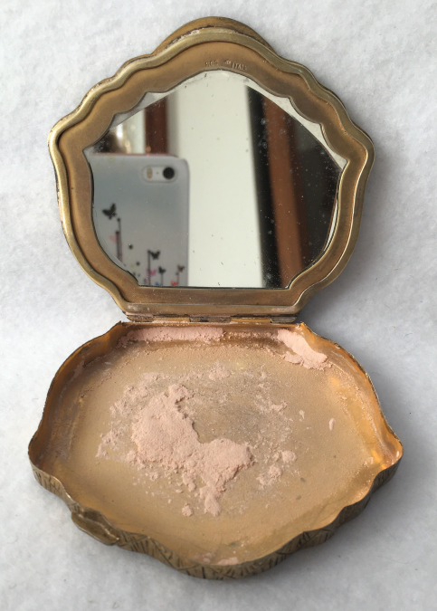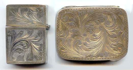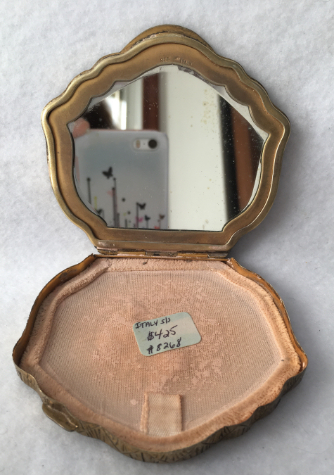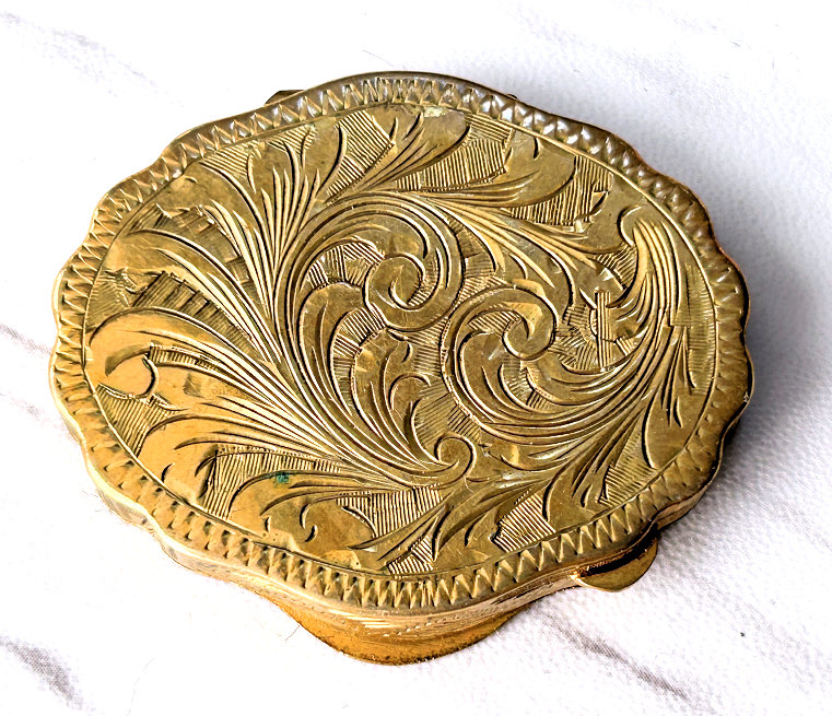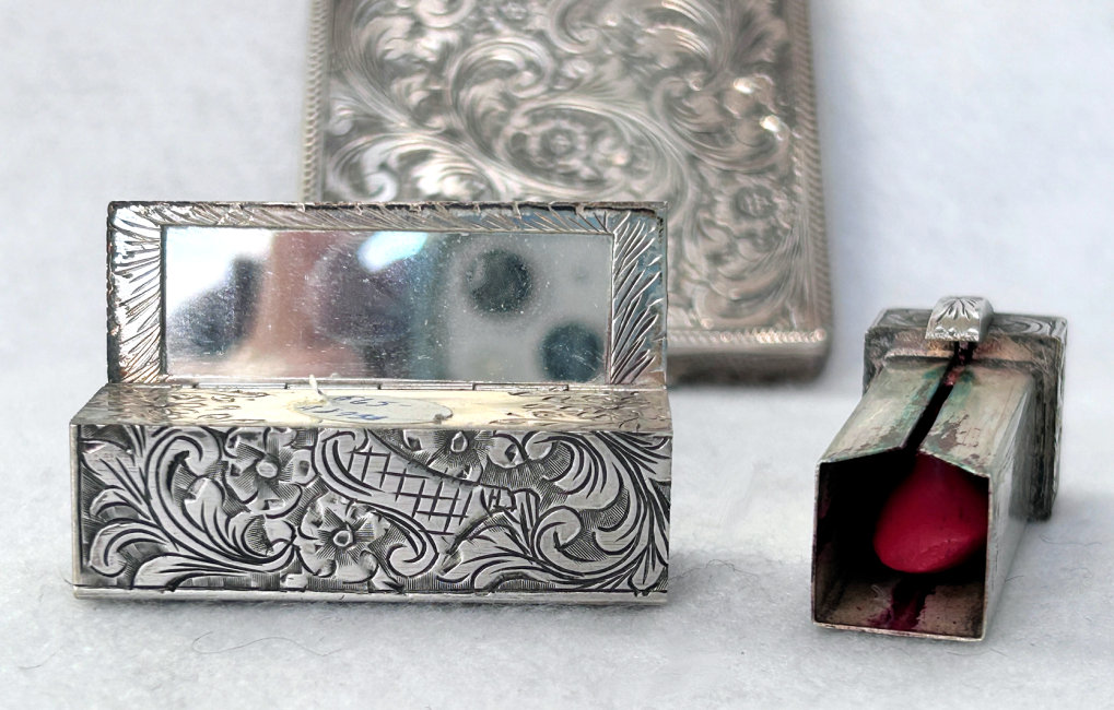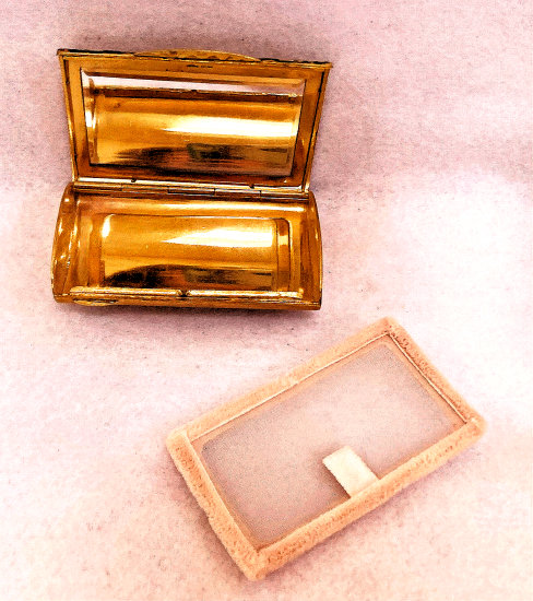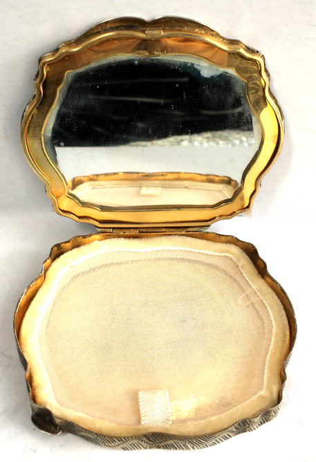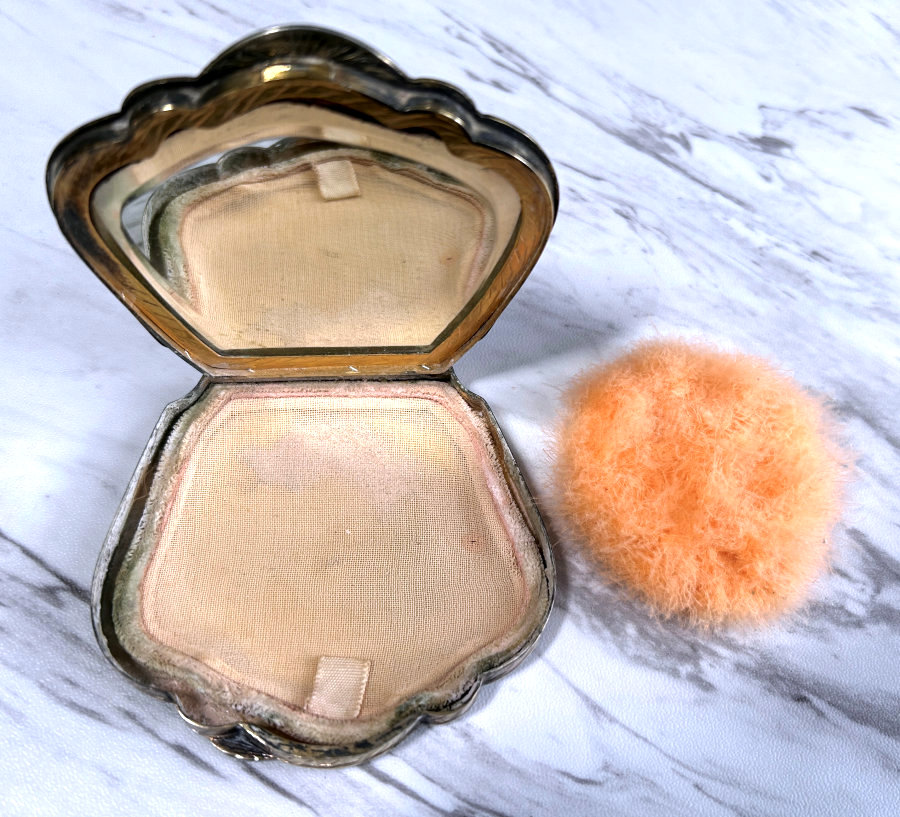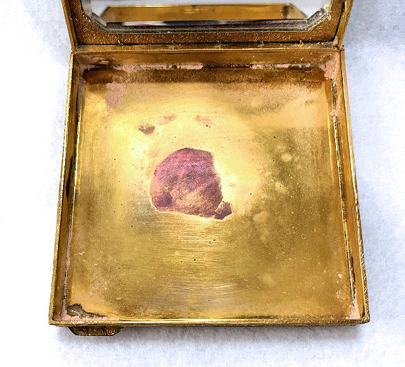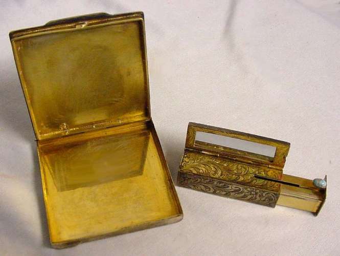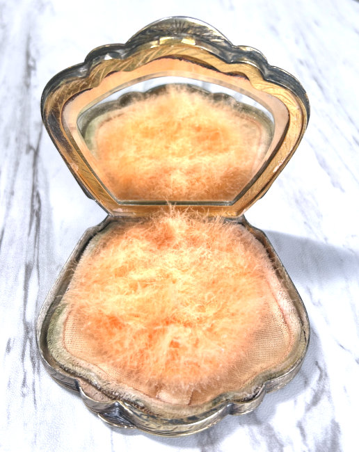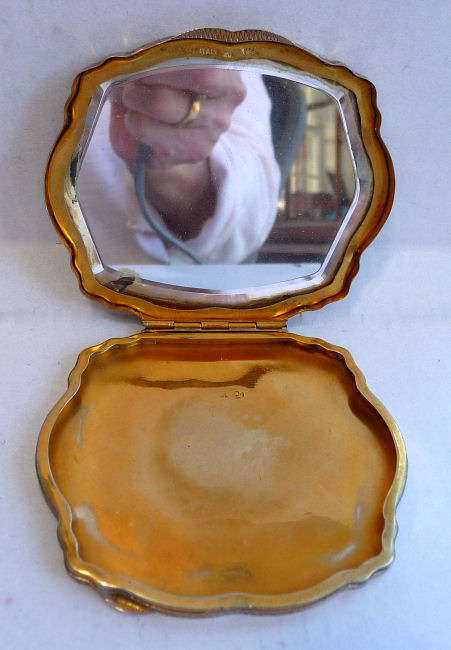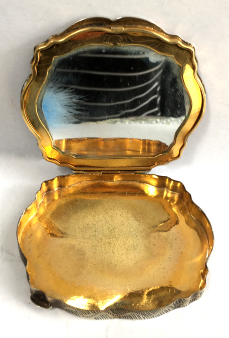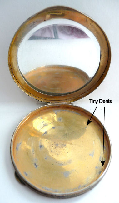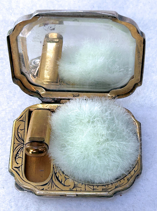 Hidden inside this beautiful smaller size compact is a tiny lipstick! The outside of the case has ornate engravings on the lid. Inside is done in gold vermeil with engraved designs on it. There is a beveled mirror in the lid and a powder well in the bottom with a tiny swansdown puff. Also on the bottom is a tiny lipstick. It is marked 800 beneath the mirror. It is just such a pretty, elegant little compact. The interior and top are in excellent condition. There are a few very tiny dents on the bottom but VERY tiny. Two of the didn't show up in photos but one of them did so you can see for comparison. Measures approx. 2-1/4" x 1-7/8". (Click on pic for more photos.) |