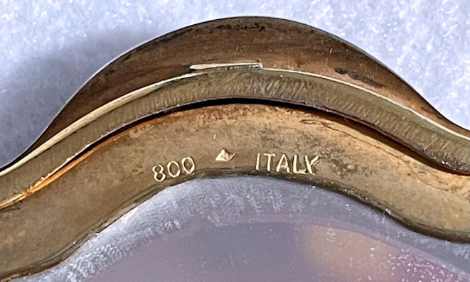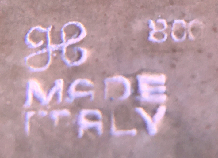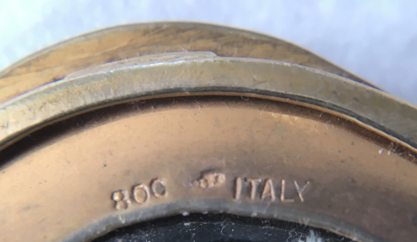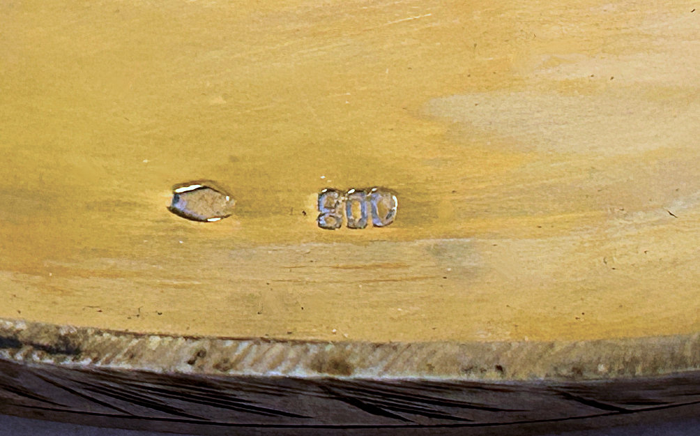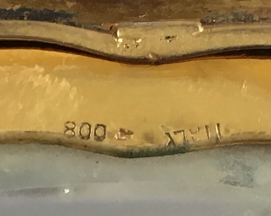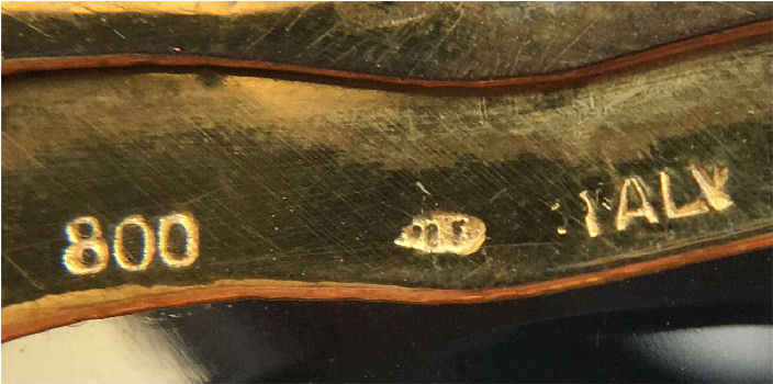 Here we have a very rare Italian sterling vermeil compact with a scene I have not seen before: a mother teaching her child how to play the mandolin. The child is holding the sheet music in her lap while the mother demonstrates on the instrument. A basket of flowers rests at their feet holding roses picked from the nearby garden and a tiny pet dog reclines close by. If you look closely, it almost looks as if they are singing a tune! This lovely scene is surrounded by faux lapis enamel and faux turquoise with tiny hand-painted flowers for embellishment. Interior of compact has a horseshoe shaped mirror in the lid which has a clean crack ... still can see clearly. Hallmarks include 800, Made in Italy, and another symbol I can't make out. Condition of enameling on lid is close to mint with only a few very, very minor scuffs visible only when held to light ... really insignificant. Measures 3-1/8" x 3-1/4" overall. Previously listed for $850. (Click on pic for more photos.) |