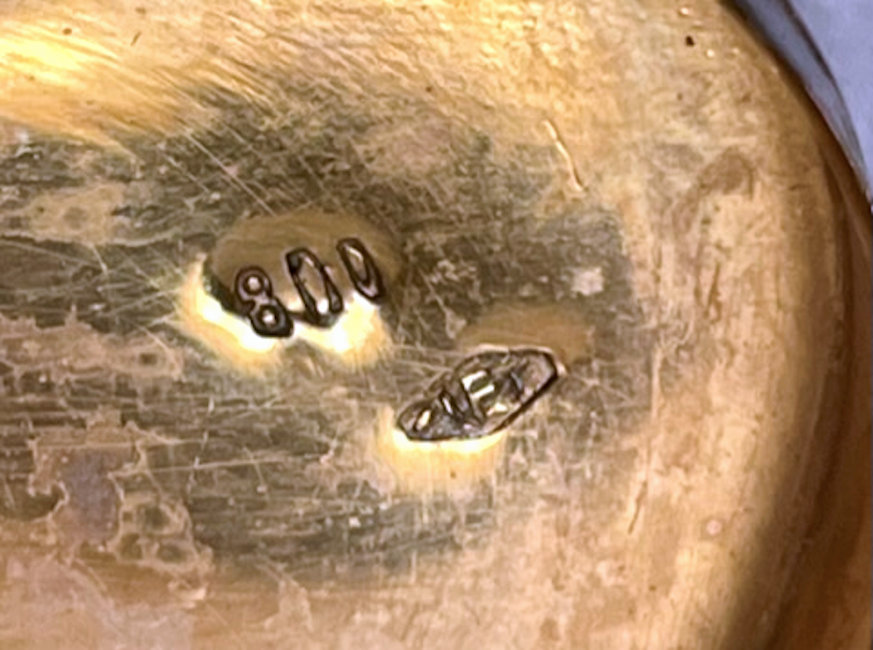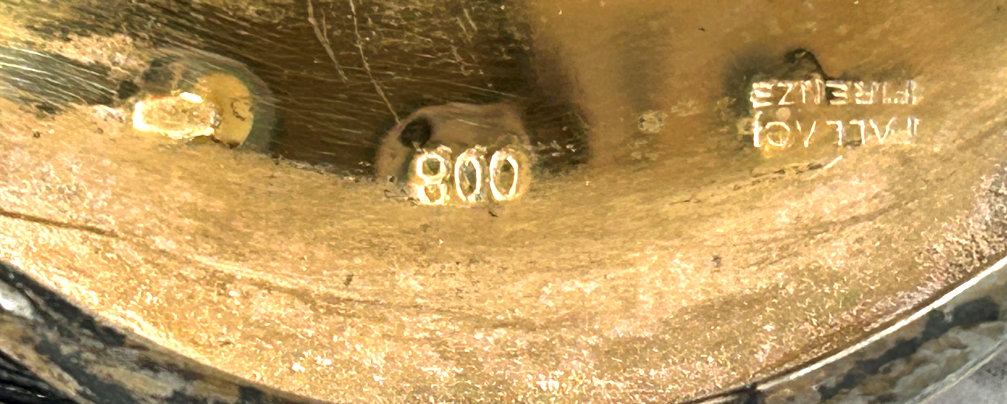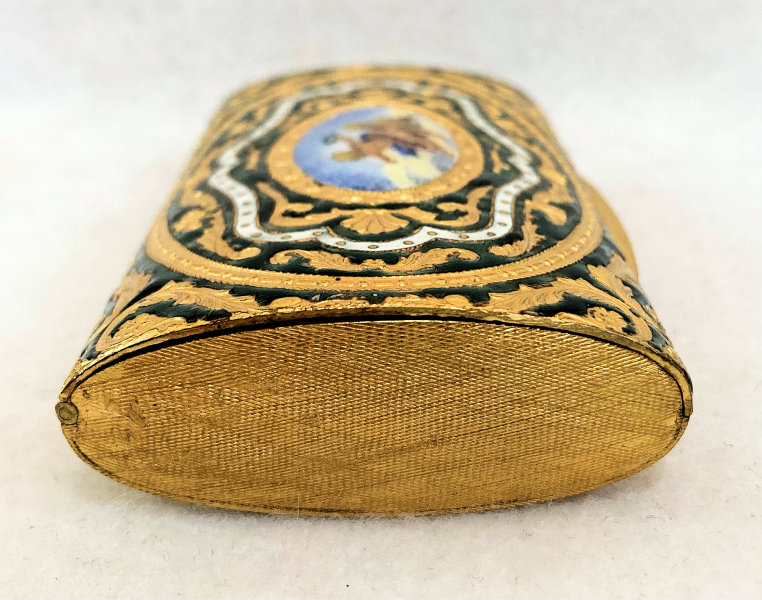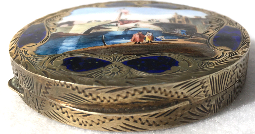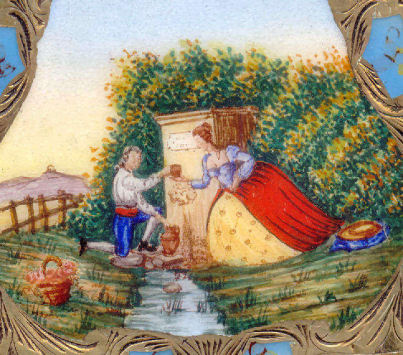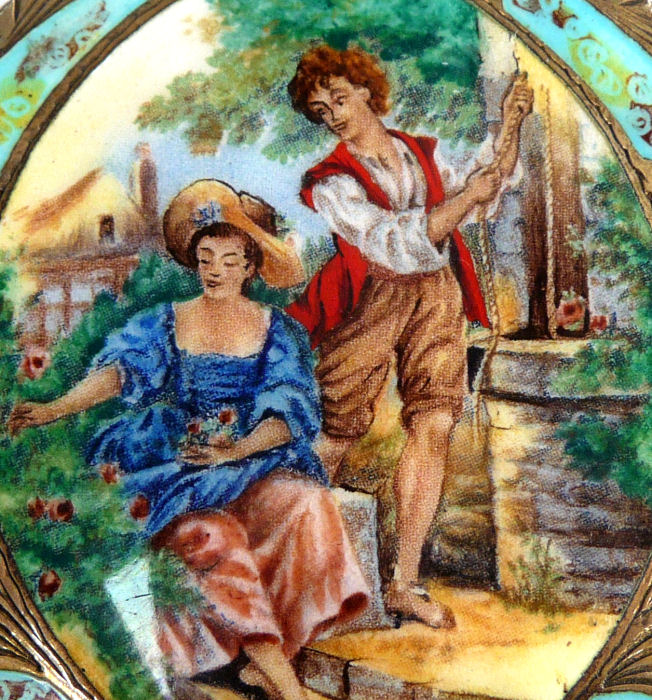 Of all the hundreds of Italian compacts I have owned, I have never had this scene before. I don't know it's origin or the original painting, but I am calling it "The Well" until I learn otherwise. The scene depicts a young woman gathering roses and a gentleman beside her drawing water up from a well. The scene appears to be part transfer and part hand-painted ... see close-up photo. The interior features a beveled mirror in the lid and the base is open ... it is all done in gold vermeil inside. Enameling on this one is about as close to perfect as you will find ... only very very minor superficial scuffs barely visible even when held to light. Marked "Made in Italy" and "800". Measures 2-3/4" diameter. (Click on pic for more photos.) |