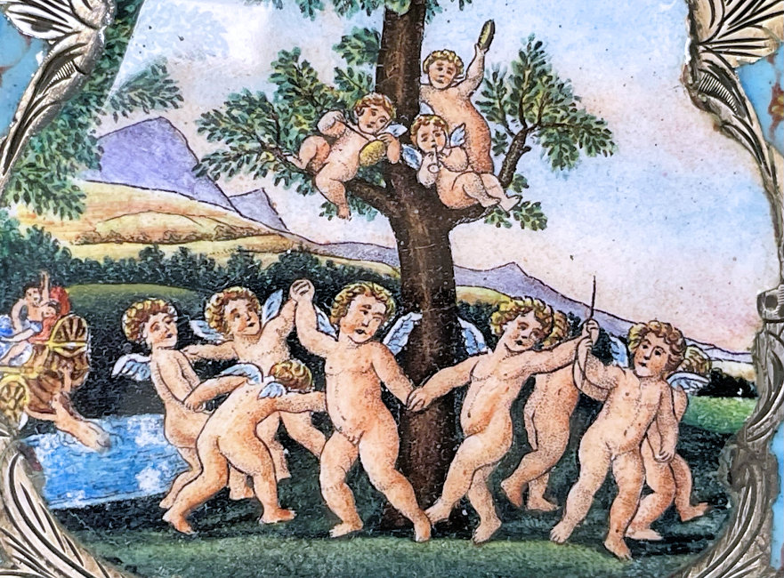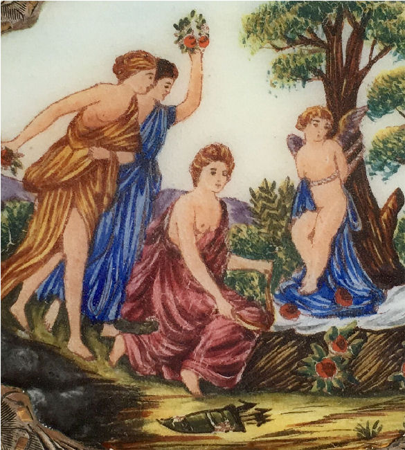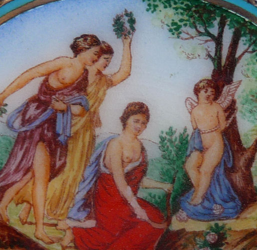 This is a beautiful compact done of a famous painting by Angelica Kauffmann called "Cupid Bound by the Graces" and it has always been one of my favorites. The scene is hand-painted and has a thin border of aqua enamel all the way around it to set it off. The interior has a shaped beveled mirror in the lid with only some minor silver loss on the edge in a few spots and an open bottom, all done in gold vermeil. There are several scuffs on the surface of the compact but only visible when held to light ... this is age-appropriate wear and does not affect the appearance in any way. Hallmarks on rim around mirror. Measures almost 3-1/2" long x 2-3/4" wide. (Click on pic for more photos.) |