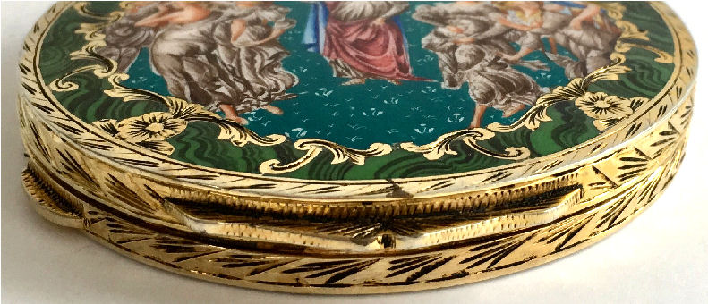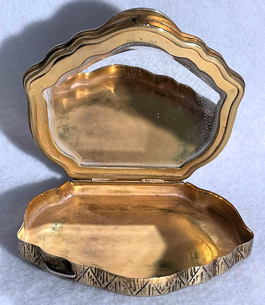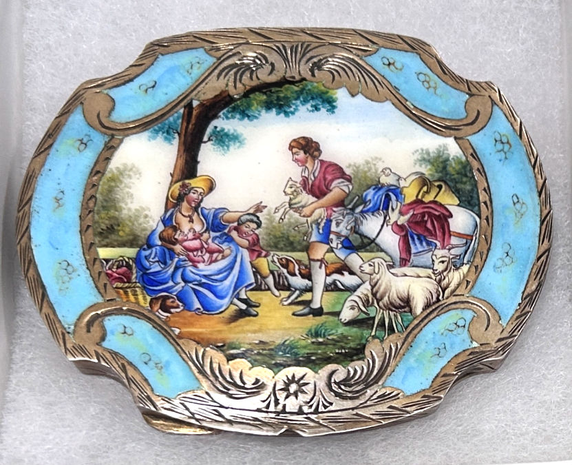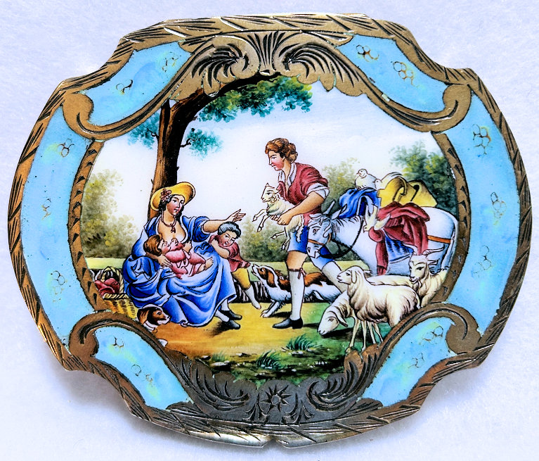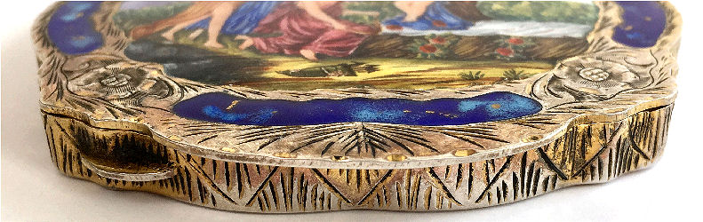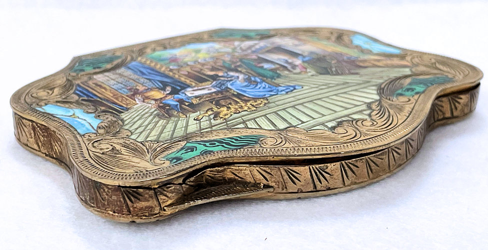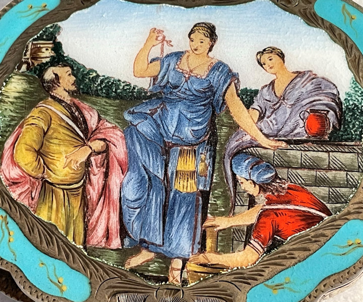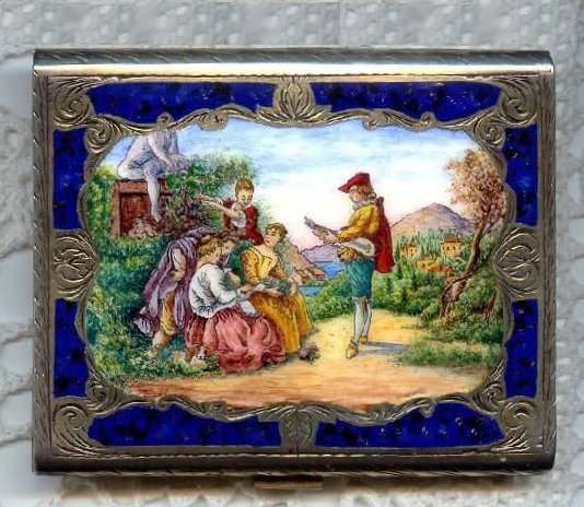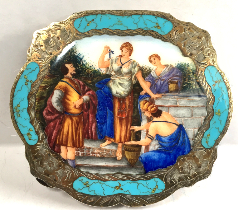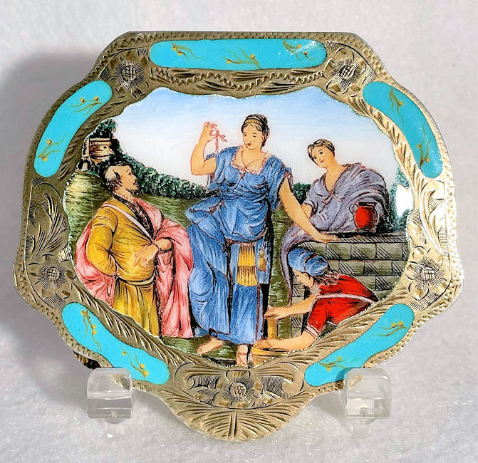 Here is a really beautiful compact that features a hand-painted scene that is a rendition of an Old Testament story, "Rebecca at the Well", painted by Gaspare Diziani around 1750 (identification thanks to a fellow collector). Although the scenes have several differences. There are four people in the scene and two of them (the two on the right) resemble servants to me. The woman in the center appears to be getting ready to be escorted on the arm of the gent on the left. Hence my "Stepping Out" title ... if someone knows the significance of this painting, please feel free to email me. I have done extensive research and not been able to find anything about it or anything even similar. Whatever the scene is, it is truly beautiful with so much detail. Now for the rest ... inside is all done in gold vermeil with a shaped beveled mirror in the lid in beautiful condition. Hallmarks inside are 800, Italy, and a small cartouche which I cannot make out the details.The colors on this compact are very vivid and it has a lot of depth in the painting. Upon very close inspection when held at an angle to the light, there are two or three scratches in the clearcoat that are really hard to find unless you are scrutinizing with a glass. Even at an angle, they are hard to pick up due to the richness of the colors. Measures 3-1/8" x 2-7/8". (Click on pic for more photos.) |