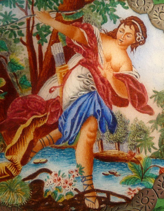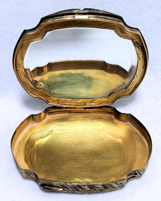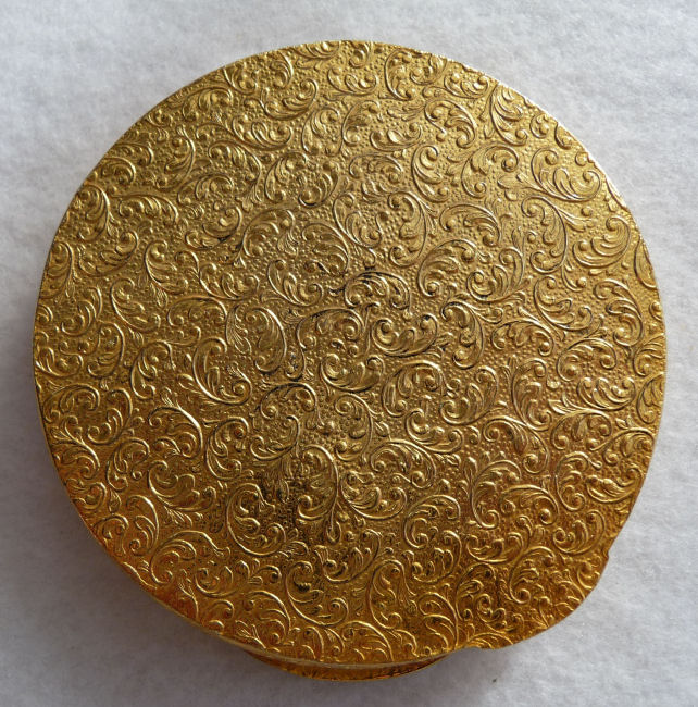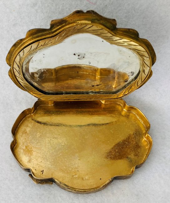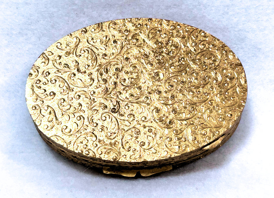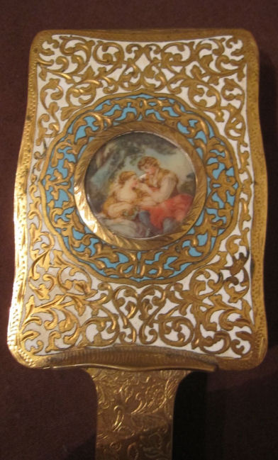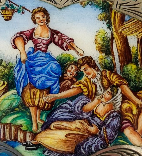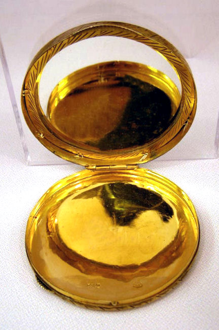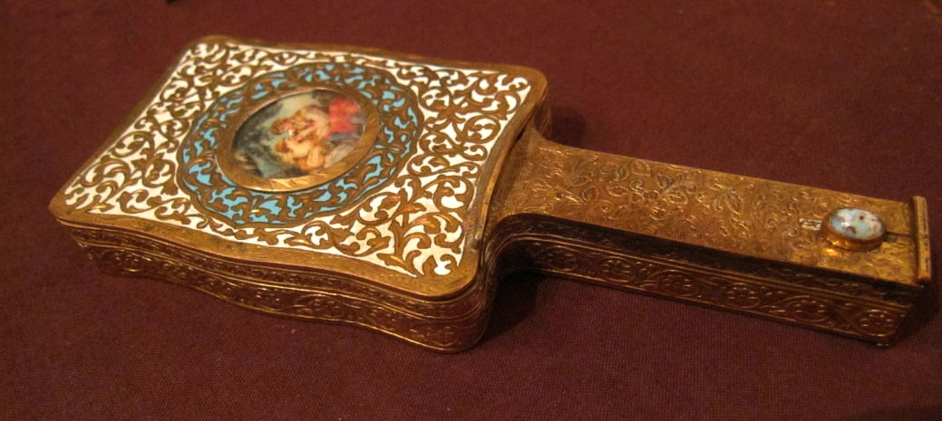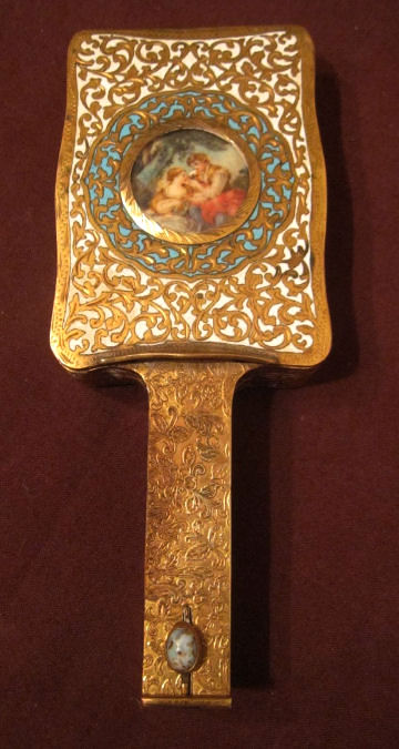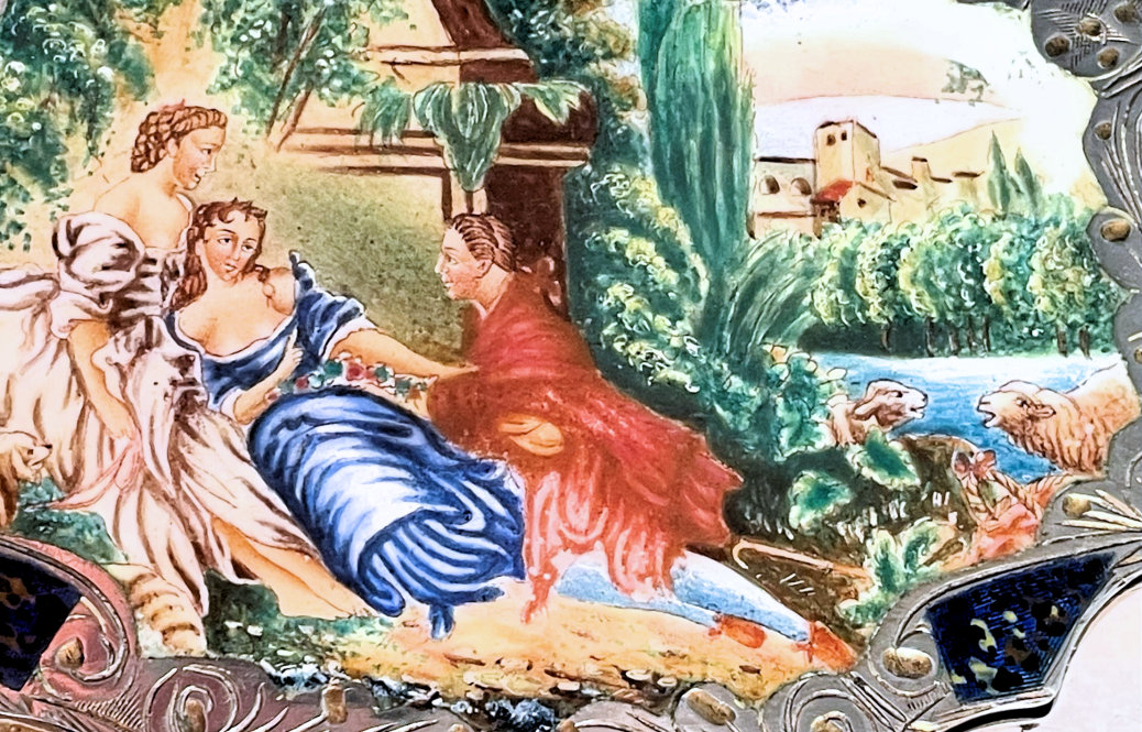 Here is a really beautiful compact that features a hand-painted scene that is a rendition of an Old Testament story, "Rebecca at the Well", painted by Gaspare Diziani around 1750 (identification thanks to a fellow collector). Although the scenes have several differences. There are four people in the scene and two of them (the two on the right) resemble servants to me. The woman in the center appears to be getting ready to be escorted on the arm of the gent on the left. Hence my "Stepping Out" title ... if someone knows the significance of this painting, please feel free to email me. I have done extensive research and not been able to find anything about it or anything even similar. Whatever the scene is, it is truly beautiful with so much detail. Now for the rest ... inside is all done in gold vermeil with a shaped beveled mirror in the lid in beautiful condition. Hallmarks inside are 800, Italy, and a small cartouche which I cannot make out the details.The colors on this compact are very vivid and it has a lot of depth in the painting. Upon very close inspection when held at an angle to the light, there are two or three scratches in the clearcoat that are really hard to find unless you are scrutinizing with a glass. Even at an angle, they are hard to pick up due to the richness of the colors. Measures 3-1/8" x 2-7/8". (Click on pic for more photos.) |
