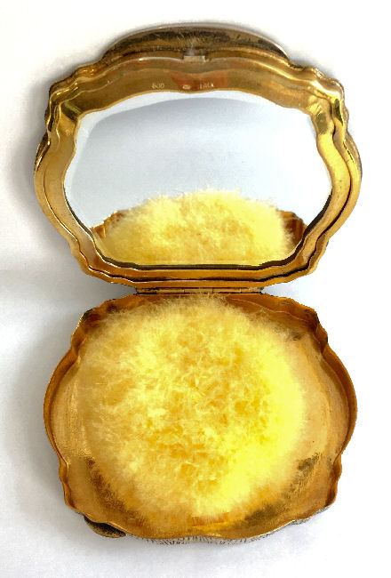 Another of my favorite type of compact ... Italian sterling vermeil with the wonderful courting scene enamel portrait on the lid, a rendition of a painting by Nicolas Lancret titled 'L'Innocence'. This one is in the round with tiny faux turquoise "stones" set in around the scene. Mirror inside the lid is round with a beveled edge. The number 800 (for sterling) is embossed in the mirror frame. There is a replacement puff in the base. Compact is in MINT condition! Measures 2-7/8" diameter. Previously listed for $625. (Click on pic for more photos.) |