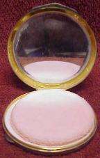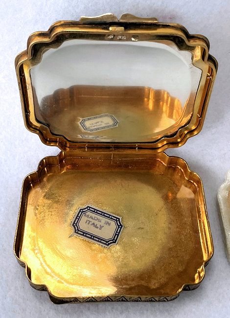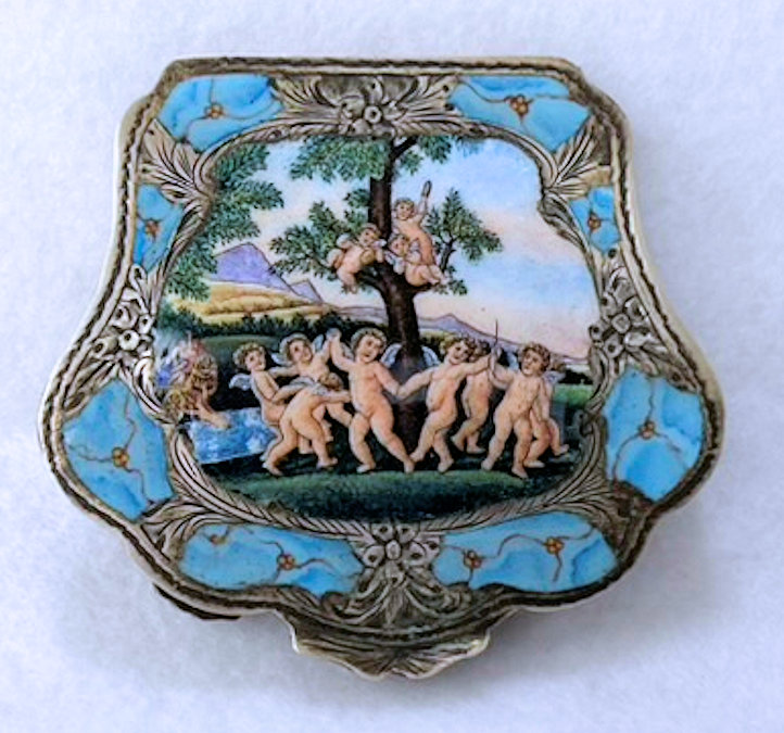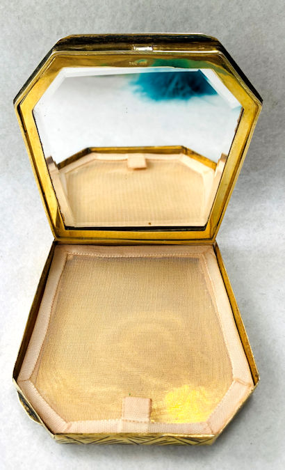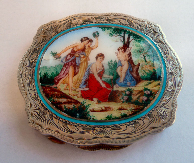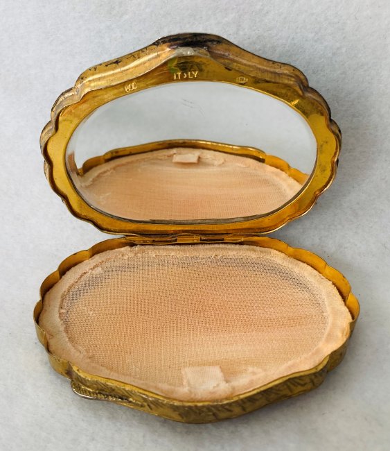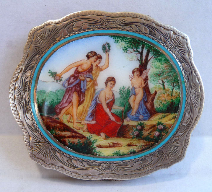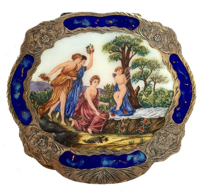 I have had (and still have) several variations of this compact which is of a famous painting by Angelica Kauffmann called "Cupid Bound by the Graces". The scene is hand-painted and has a border of faux lapis and turquoise enamel accented with gold flecks all the way around it to set it off. The interior has a shaped beveled mirror in the lid which is in perfect condition. Gold vermeil interior is all bright and shiny. There is a gold swansdown puff with a little ribbon handle which was in the compact when I got it. Hallmarks on rim around mirror read 800 and Italy and a lozenge mark that I cannot make out. The enameling on this one is in mint condition with not a single scuff or scratch that I could see. Measures 3" x 2-3/4". (Click on pic for more photos.) |