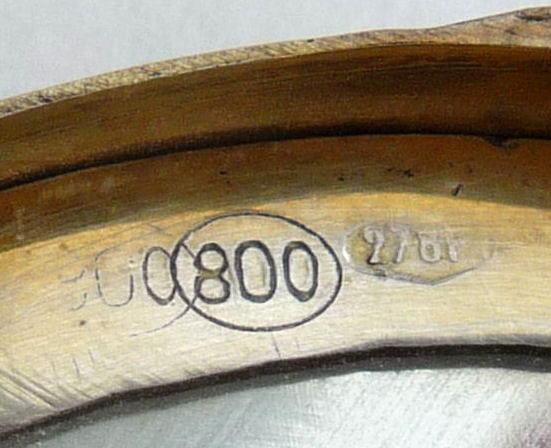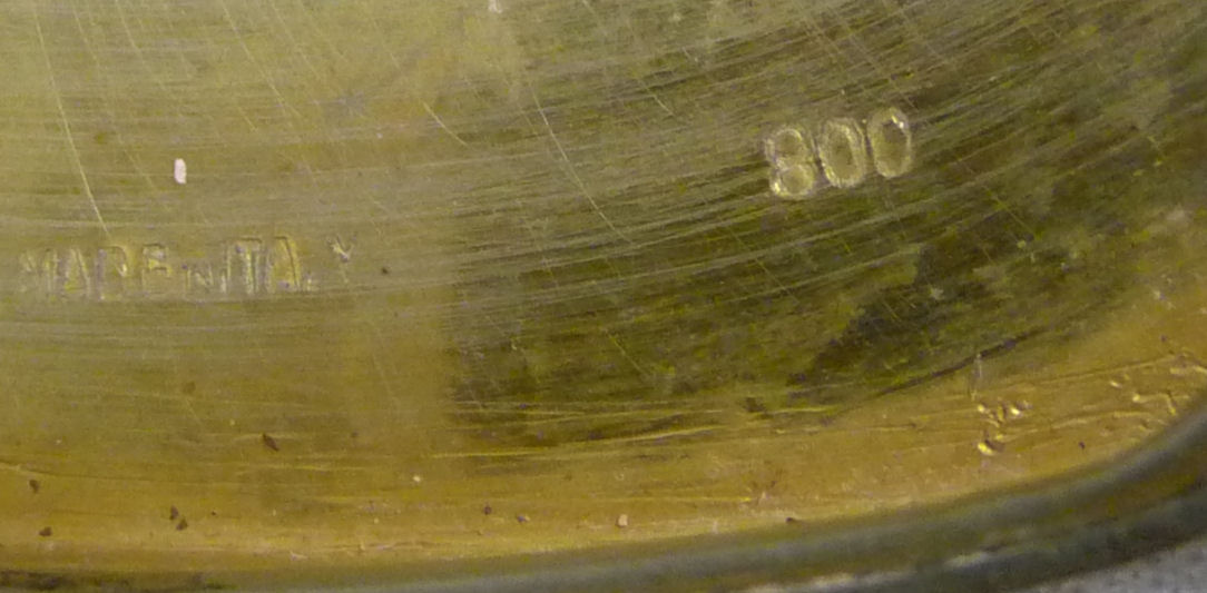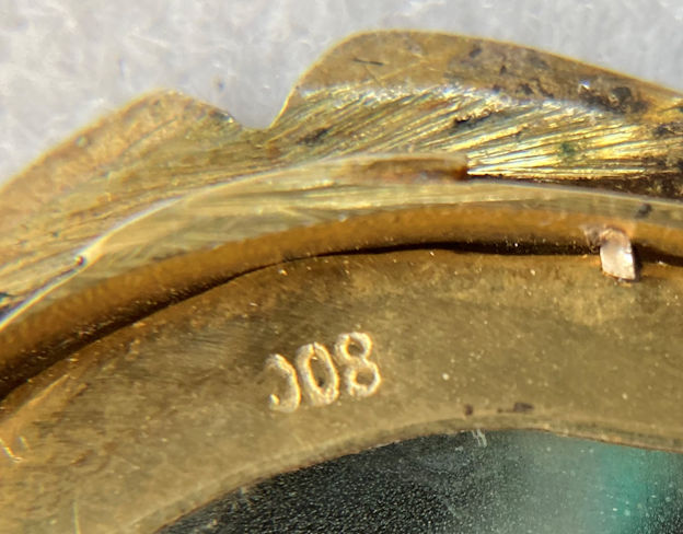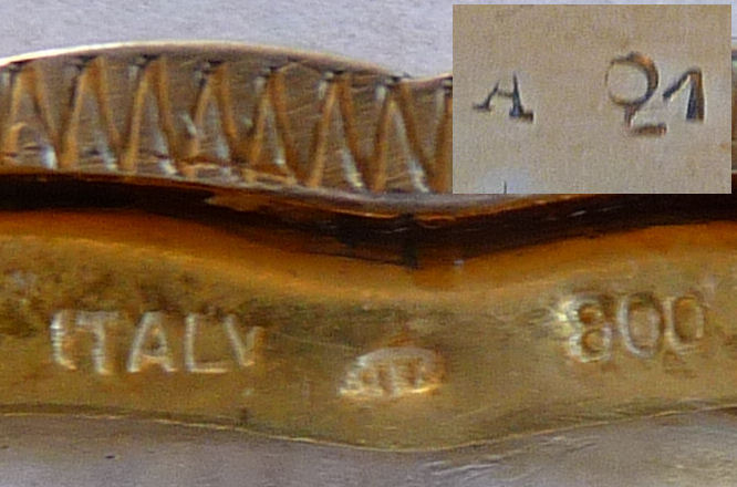 Here is a really beautiful compact that features a highly detailed scene on the lid of the famous painting by Boucher entitled "Rhea Sylvia Fleeing from the Wolf". The scene takes up most of the lid and is surrounded by faux malachite green enamel. The case has a nicely beveled shape to it with "cut" corners making it 8 sided. The sides of the case have a leaf design all around and the bottom features flowers and scrolls. Inside is all done in gold vermeil with a mirror in the lid which is bevled but the gold retainer covers a lot of it. There is a tiny surface flake in the bottom edge of the mirror which is also mostly covered up. Hallmarks inside are 117 in a cartouche and FI for Firenze (Florence). 117 is the mark for Ristori Renato di Egisto. There is also a flower mark that I am not sure what it symbolizes. Included is a new maribou puff. Condition is really excellent ... at a glance it would appear mint. It is only when you turn it to the light that you can discern one scratch in the clear top coat and several tiny superficial little nicks here and there. None are noticeable looking at it directly and the gloss is excellent! I do like my compacts to be mint or near mint and I will forgive these minor imperfections because the compact is so striking otherwise. Measures 3-1/4" square ... it is a large compact! (Click on pic for more photos.) |