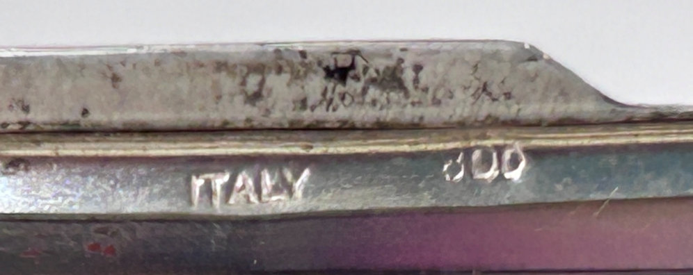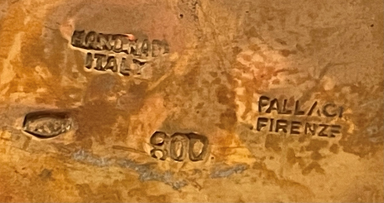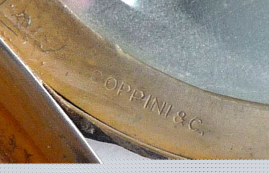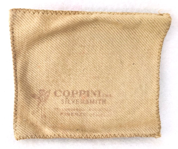 I cannot say enough about this gorgeous Italy sterling vermeil compact with a hand-painted scene which I have dubbed "An Afterrnon in the Park". It is reminiscent of paintings of a similar vein done by Nicolas Lancret entitled "Dance Before a Fountain" but I cannot find this exact one. Nor have I ever had or seen this compact anywhere else ... it is the ONLY one of its kind I have ever come across. The scene is very detailed with numerous people in their Sunday finest garb and there is even a dog in the foreground. The scene is bordered in faux lapis and turquoise enamel. The enameling is in pristine condition having no scuffs or scratches on it that I can discern even with a loupe. It comes in its original sleeve with the name Coppini Silversmiths, Firenze, Italy on it. The interior has a beveled mirror in the lid (with some silver loss) and the original powder screen. The hallmarks are in the base as shown in the photos. This one is a gem for sure! Measures almost 3" x 2-3/8". (Click on pic for more photos.) |