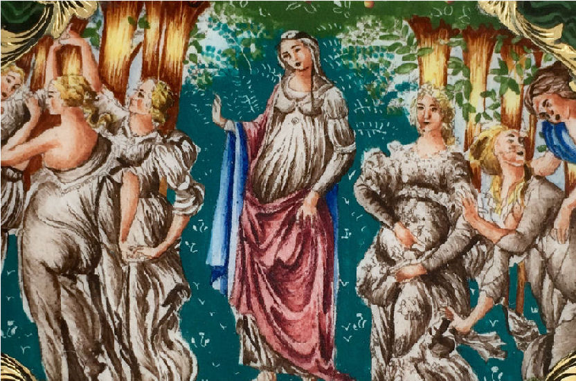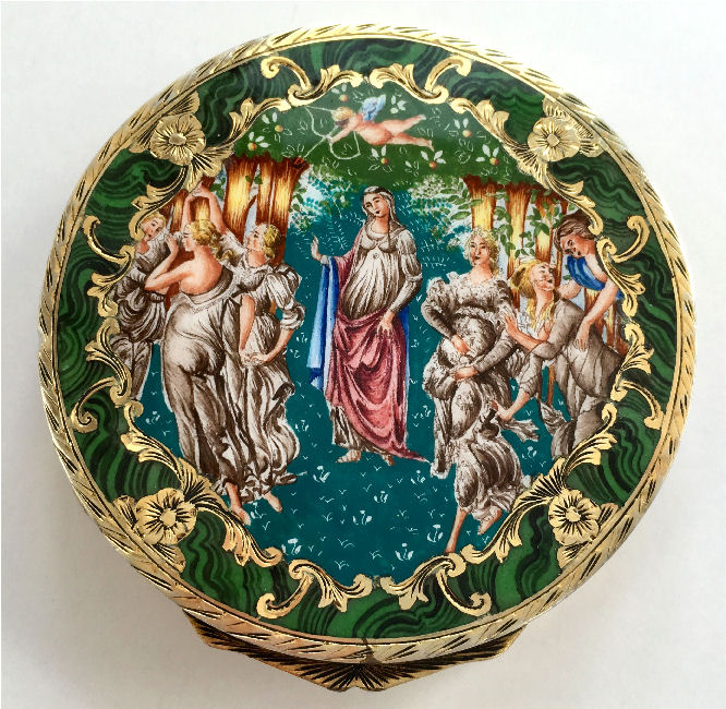 Here is an excellent hand-painted replica of Botticelli's "Primavera" (see background info). The compact features Venus in the center with Cupid overhead. The three women to her left are the Three Graces. To the right is Zephyrus, the west wind, who is grasping onto Chloris. After he succeeds in taking her for his own, they are married and Chloris transforms into Flora, the other female figure on the right side. The compact is in the round with a green enamel faux malachite border. The interior has a round beveled mirror in the lid which is very clear with only a small scratch in the lower right edge. There is a newer replacement removable powder pat inside as well as a replacement puff. Hallmarks on rim around mirror read 800 and a lozenge mark that I cannot make out. The enameling is in excellent condition with some very minor superficial marks that I had to really hunt hard to find as they are so slight and blend in with the design so well that I honestly thought it was mint! Measures 2-5/8" diameter. (Click on pic for more photos.) |