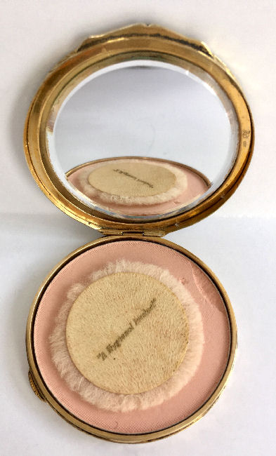 This is a really gorgeous and detailed sterling compact with gold plating on the interior. The scene on the cover is from a famous painting by Henry Holiday done in 1883 called "Dante & Beatrice". You can click here to read the complete story about it. The scene is surrounded by small lapis lazuli enameled designs, some of which resemble hearts. Interior of compact features a round beveled mirror in the lid and a solid powder pat in the base. Excellent condition throughout. Measures 2-3/4" diameter. Previously listed for $750. (Click on pic for more photos.) |