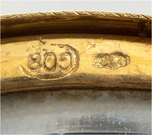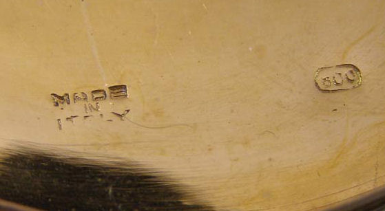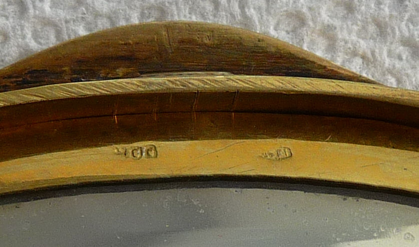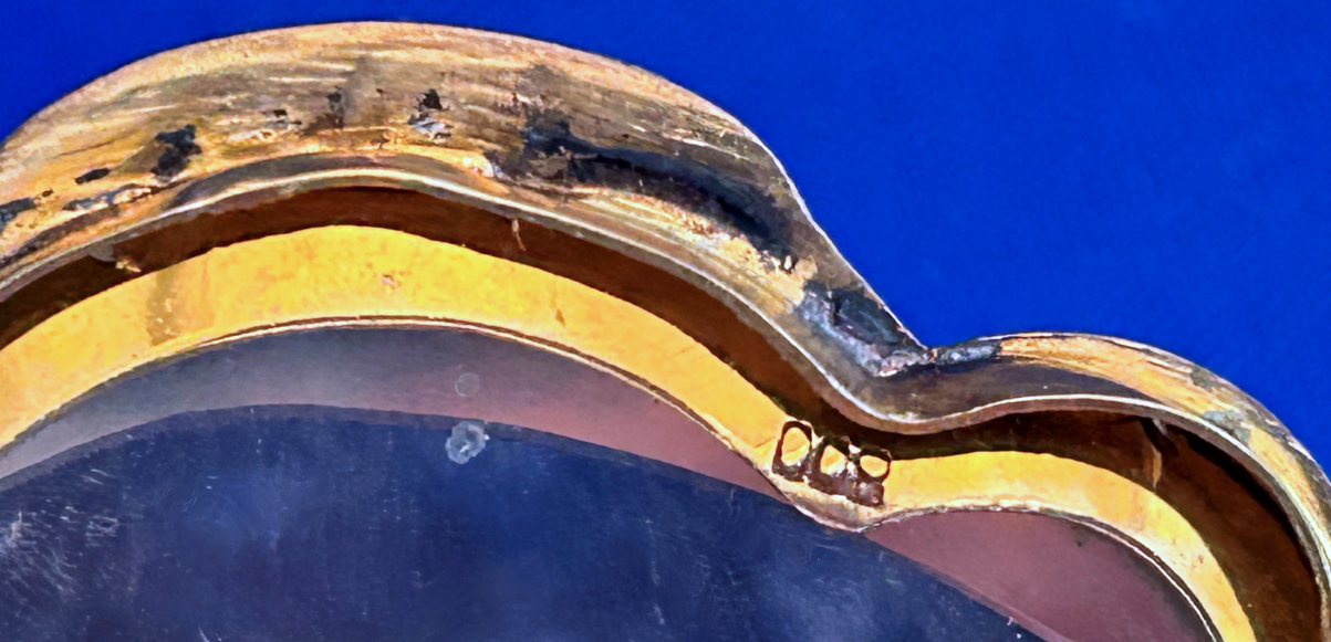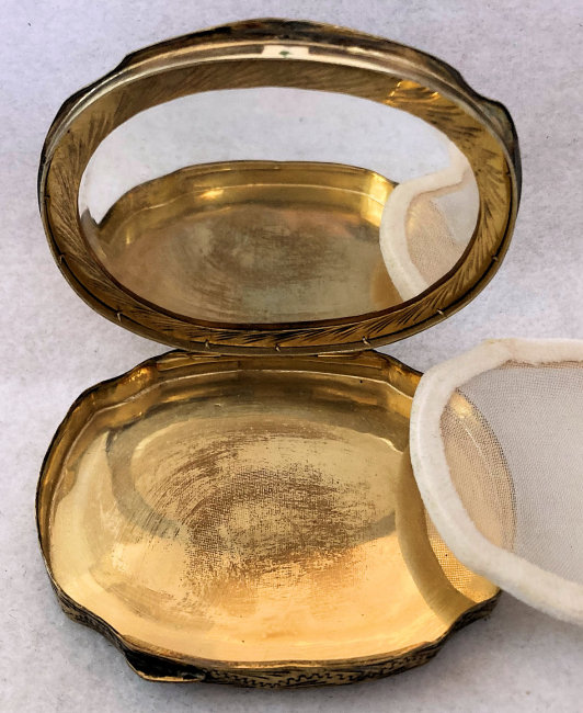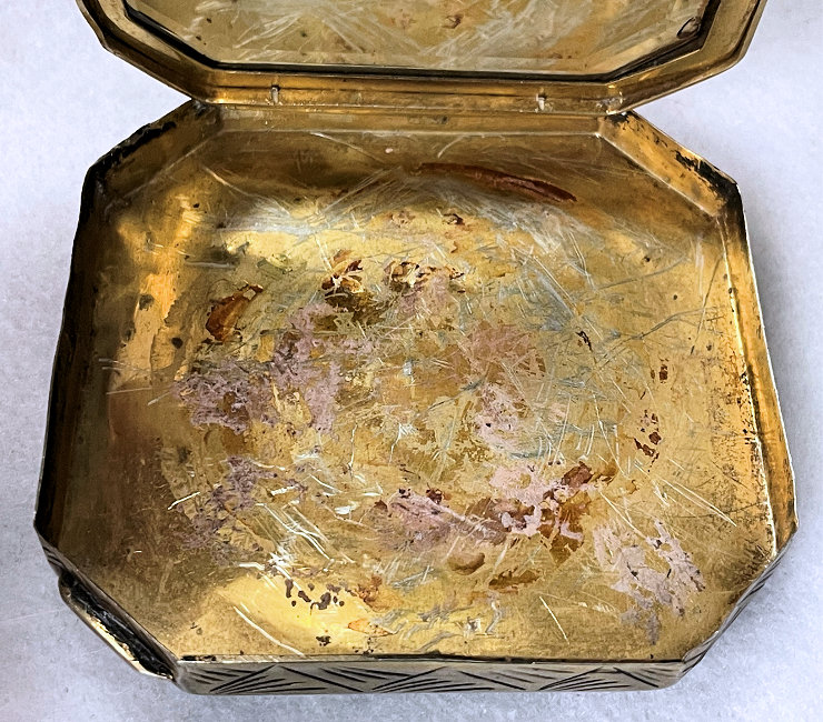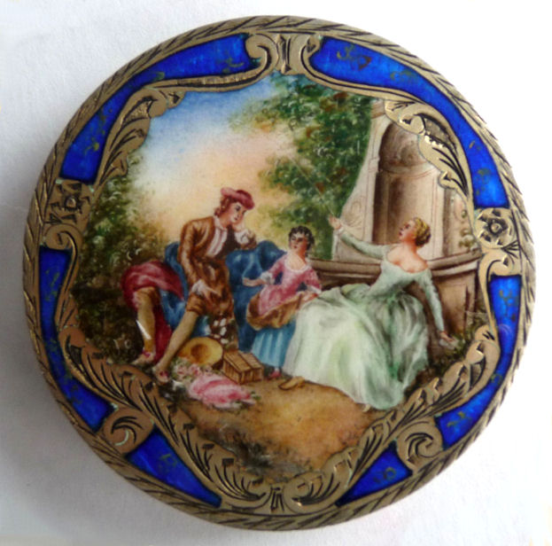 This is an adorable little patch box with a hand-painted scene that I believe is a rendition of Francois Boucher's "Lover's Tryst" painting. Originally there would have been a little mirror inside the lid which is no longer there. Probably used for a patch box, it would make a great pill box for use today. The gold vermeil on this compact is in perfect condition with no wear whatsoever and there are no scratches to the enameled surface. It is marked inside with the 800 sterling mark, a lozenge which I can't make out, and Italy. Measures approximately 1-7/8" wide x 1-1/2" high. (Click on pic for more photos.) |
