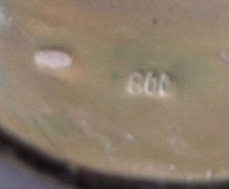 Here we have a wonderful romantic figural pastoral scene ... a young gent holds the flute for his lady fair to play ... interesting twist on a common theme. Sheep surround the couple's feet. Lovely faux turquoise borders on an Italian sterling vermeil compact. There isn't much gold on the outside but the inside is bright gold. Interior has a beveled oval mirror and original powder screen in base (has a hole in it though). New swansdown puff will be included. Enameling is in excellent condition with only superficial surface scuffs due to age as is commonly found. Stamped 800 in powder well. Measures 3-1/4" x 2-5/8" overall. Previously listed for $435. (Click on pic for more photos.) |
