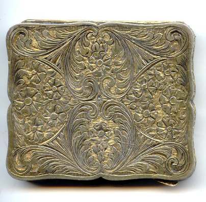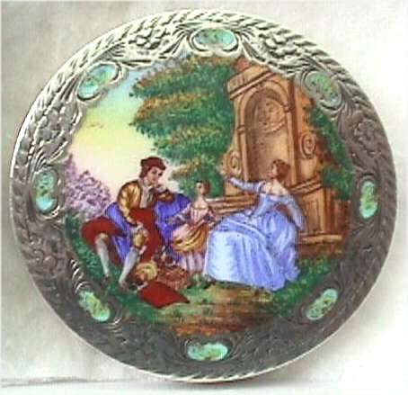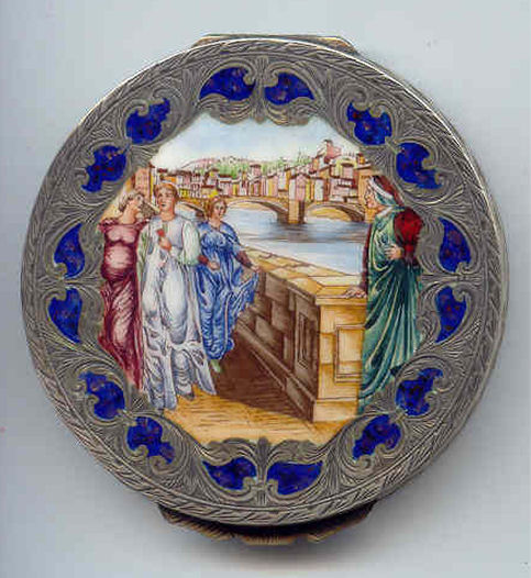 Here is a lovely Italian sterling compact with a romantic couple on the front. Nice smaller size with faux turquoise enameling around the edge. Interior has original powder screen but no mirror in lid. Excellent condition ... measures 2-3/4" x 2-1/4" Previously listed for $495. (Click on pic for more photos.) |