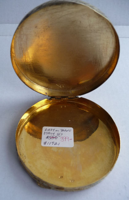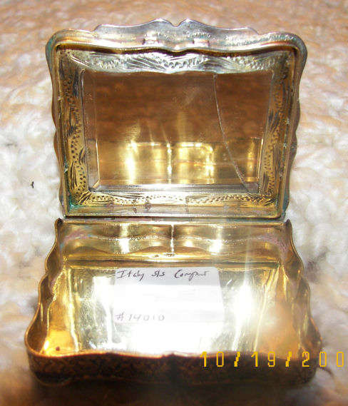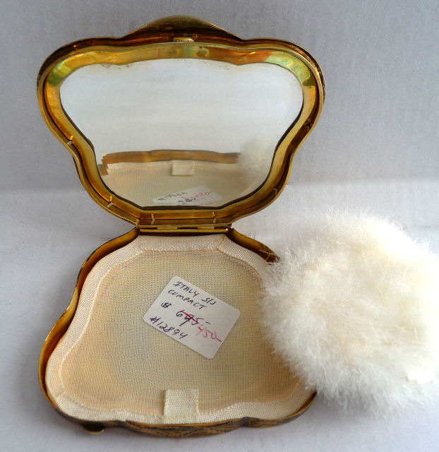 This one is a little different in that it is not a compact but a pillbox (no mirror inside, just storage). Done just like the sterling vermeil compacts from Italy, this little jewel features a romantic couple on the front with faux turquoise enameling and chased silver vermeil case. A picnic basket rests under the young lady's arm. Sides of case and back are also chased with incised designs. Measures 1-3/4" diameter x 3/8" thick. It is in perfect condition! Previously listed for $299. (Click on pic for more photos.) |