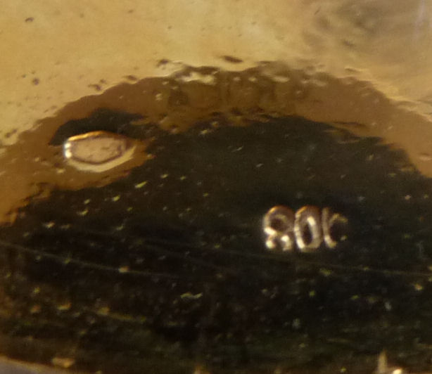 This is a very detailed and exquisite rendition of the painting La Partita a Scacchi by Geralamo Induno, circa1881. Induno was an Italian painter of the mid-19th century and a patriot who fought in defense of his country against Austria and France and with Garibaldi for the independence of Italy. This compact features faux turquoise and malachite enameled insets around the perimeter and is all done in sterling vermeil. The inside has a shaped beveled mirror in the lid and a swansdown puff in the base. It bears the hallmarks for Firenze (Florence) and 800 sterling. The enameling on this one is in absolutely pristine condition with no scratches or wear to the surface that I could discern. The lower front edge of the compact has a very tiny hairline split that doesn't show up in the photos and a tiny "divot" in the top (see photo close-ups). This doesn't affect its use or closure at all and is barely noticeable unless you know where to look. It is a large compact measuring 4" across x 3-1/2" high. (Click on pic for more photos.) |