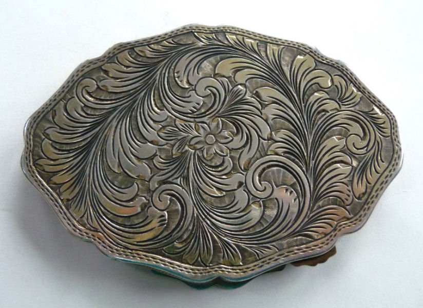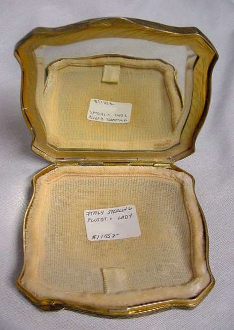 *Shipping and handling included within Continental U.S. Disclaimer: When referring to "jewels" or "gemstones", I am making no guarantees as to whether these are genuine jewels or not. To see photo gallery of all previously SOLD compacts and vanities, click here Enamel Guilloche | Italian Sterling | Miscellaneous | Novelty | Tango | Vanities