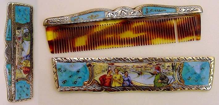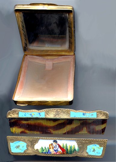 Here we have another wonderful matched set featuring a young man and two maidens fishing by a stream. The comb features the young man and one of the ladies in a more romantic pose. Both pieces are trimmed with faux turquoise enamel. Compact interior features a beveled mirror in the lid (unfortunately cracked in storage ... will update photo soon) and original powder screen in base. Condition of enameling is very good with only minor scuffs visible when held to light. Comb is faux tortoiseshell and enameling is in perfect condition. This came from a private estate in Ohio from a single collection I have recently purchased. Compact measures 2-3/4" square overall; comb is 4-5/8" x 1-3/8" overall. Previously listed for $899. (Click on pic for more photos.) |