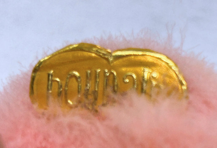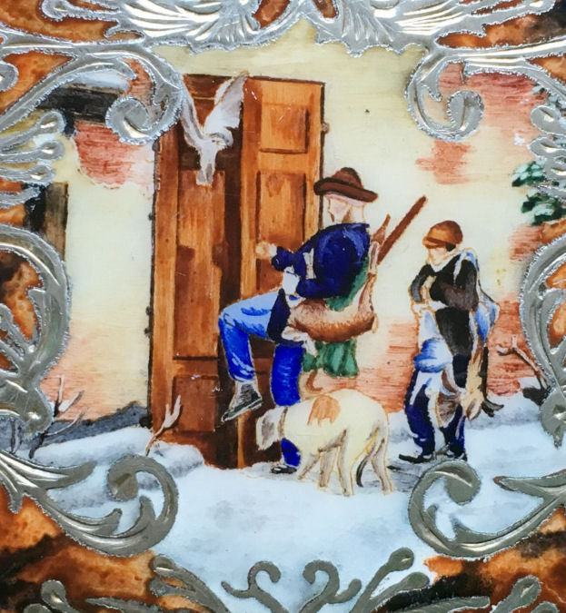 Autumn and winter are just around the corner and this compact really brings the feeling home for me! This lovely Italian compact features a hand-painted scene on the front of a man and (probably) his son returning home from the hunt with their hunting dog alongside. Both are carrying the fruits of the hunt over their shoulders. There is snow on the ground and the door is open to welcome them home. What I especially love about this compact is the VERY rare faux tortoise shell enameled background which picks up the color of the wood from the door of the house. It's quite lovely! Inside the compact you will find a beveled mirror in the lid in excellent condition and an original orange swansdown puff. The enameling on the lid is in excellent condition as well with only two or three very minor scratches on the clearcoat surface. Although I cannot find a stamp for 800, it is clearly marked Made in Italy and is in the same style as other Italian sterling compacts I have had. There was something above the Made in Italy stamp which may have been an 800 mark but it is misprinted or misstamped and is illegible. In any event, I am not going to sell it as sterling even though it very well may be. The price will reflect that. Compact measures 3-3/16" x 2-7/8". (Click on pic for more photos.) |