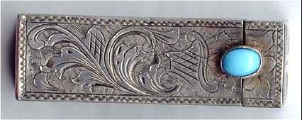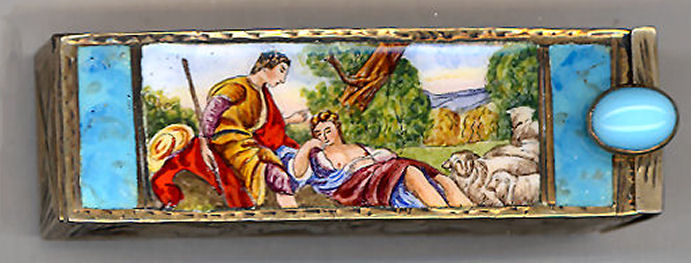 Although technically this calling card case isn't sterling silver (at least not marked as such) or Italian (it is made in Germany), the genre of the style and scene merited me placing it in this section. The scene is set in the center with beaded enamel border and depicts a romantic couple with the woman partially nude in a state of deshabille'. A flock of sheep rests alongside them. Around the scene is turquoise enameling in cloisonne' design and this is surrounded again with another border of enameled beads. Enameling is in mint condition with no scuffs or scratches visible to my eye. Interior is finished in gold wash and has a spring-loaded slip on both sides. It is marked Germany on the border. Case measures 3-1/4" x 2-1/8" overall. There is a lipstick in our collection that is a very good match to this case. The same scene is surrounded in faux turquoise enameling with a turquoise jewel clasp. When open, the lid flips up to reveal a mirror (some foxing around edges). Overall in very good condition! Lipstick is 2-1/4" long. Previously listed for $1,049 for the set. (Click on pics for more photos.) |