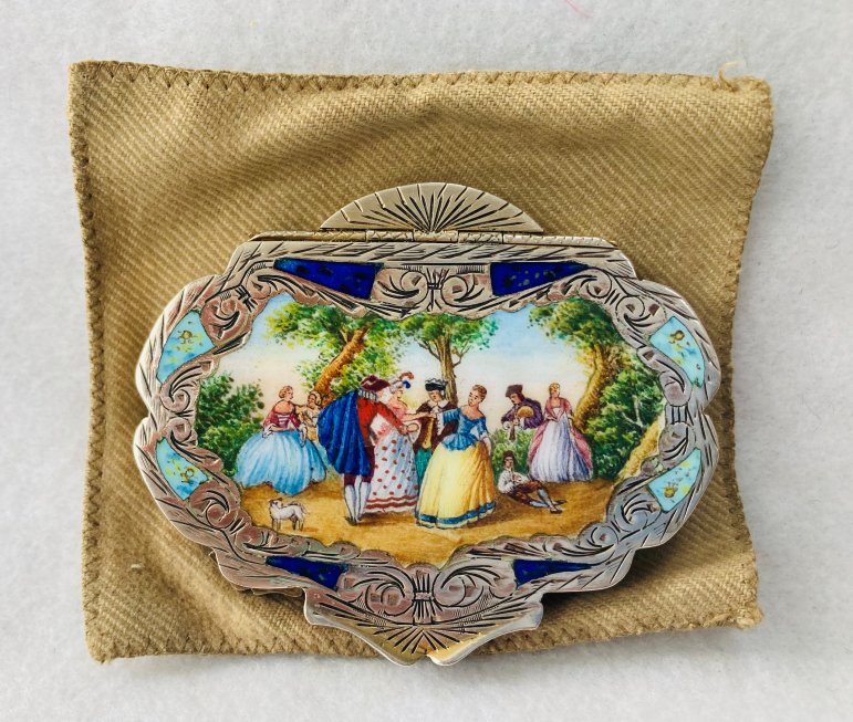 This Italian sterling silver compact with gold vermeil interior is features a famous painting done by Nicolas Lancret in the 1700's entitled "L'Innocence". The painting on these compacts is more commonly found but the variances in the hand-paintings can be significant. In all of them, a woman is seated in a park next to a large carved wall of some type. Her lady-in-waiting or chaperone is off to one side and a gentleman caller is seated alongside. In some of them, you can see a little bird in flight that appears to have just been released from the lady's hand. In this painting, the bird is not visible but the lady's outstretched arm can clearly be seen. Interior is gold plated but has no mirror or powder screen ... it is empty. Excellent condition ... measures 2-3/4" diameter. Previously listed for $550. (Click on pic for more photos.) |