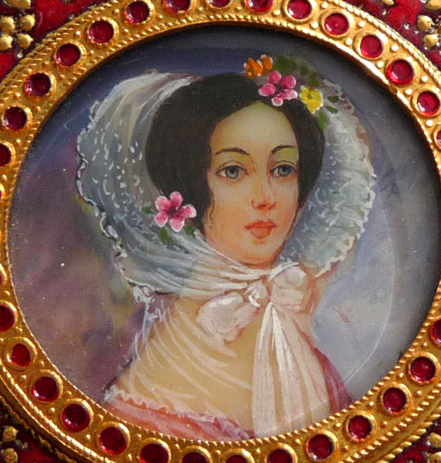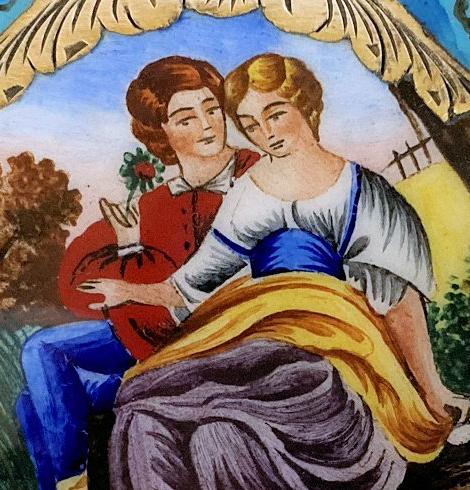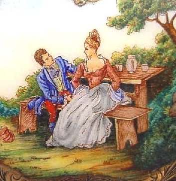 Here we have a rendition of the "Music Hour" featuring a gentleman playing his mandolin for two ladies fair. This one is done to resemble a fine painting ... almost in pointilistic style. There is significant wear to the clearcoat on the top of the piece, but the colors and style of this piece make it stand out. The scratches aren't visible unless viewed when held to light. Both women have a white flower in their hair and there is a garland of roses casdcading down over the column behind them. It is quite a large compact measuring a full 4-1/4" wide x 3" high. Interior has a mirror in the lid which is not beveled so it may be a replacement. Due to the scratches, this one is priced very reasonably! Previously listed for $395. (Click on pic for more photos.) |
