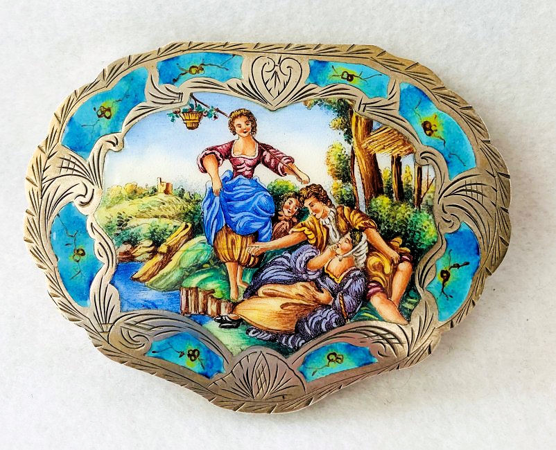 This lovely Italian sterling vermeil compact features a scene called "Pleasures of Fishing" in the manner of Francois Boucher. As the title implies, the scene depicts a young man fishing in a stream with three friends alongside. The scene is very detailed and the border is faux turquoise. Gold vermeil interior boasts the original beveled mirror in excellent condition as well as the original powder screen. Hallmarks on rim around mirror read 800 and Italy and a lozenge mark that I cannot make out. The enameling on this one is in pristine condition with not a single scuff or scratch that I could see. Measures 3-1/4" x 2-1/2". (Click on pic for more photos.) |