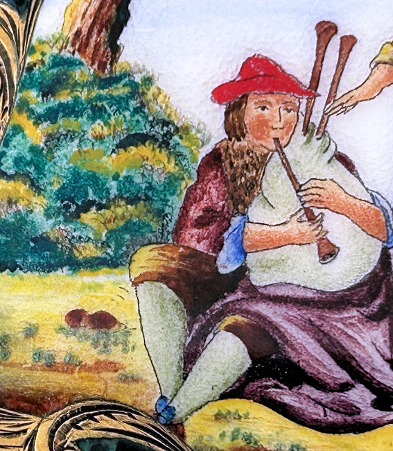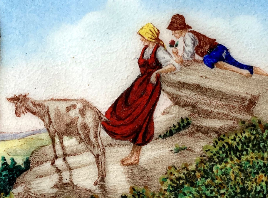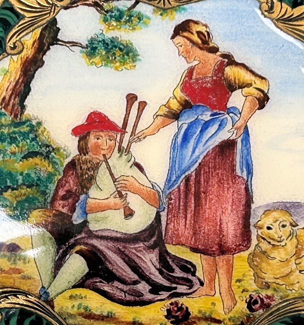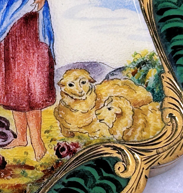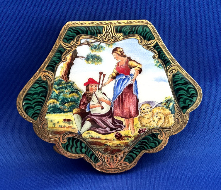 This is a fabulous scene which I cannot find anywhere nor have I ever seen it before. It is a pastoral scene depicting a minstrel playing a zampogna (an Italian bagpipe) with his lady fair and two sheep looking on. The border is done in an enameled faux malachite. All of the gold vermeil on this one is like the day it was made! Inside is a beveled mirror with a few age spots but still perfectly clear. The base has the original powder screen (unused) and a small swansdown puff. There are two hallmarks inside on the mirror bezel. I don't believe this compact has ever been used as there is not a single sign of wear to the puff or screen. In fact, I would consider this compact to be in mint condition. It comes in a black velvet sleeve which may or may not be original. The enameled scene on the top is slightly convex and does not lay flat as most do which gives it a pillowed effect. They don't get much better than this! It measures 3-1/2" x 2-7/8" overall. (Click on pic for more photos.) |