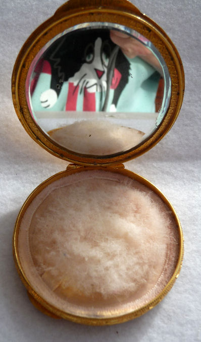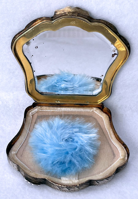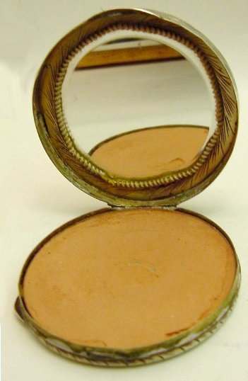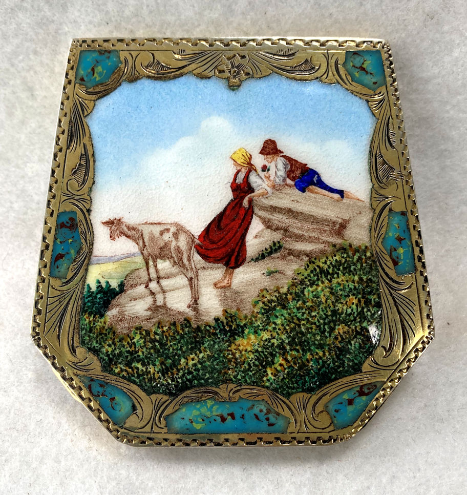 Here is another extremely rare scene (have never seen it before anywhere). It is a large hand-painted scene depicting a lass with a mountain goat while a gentleman is looking over from a large rock with a rose in his hand for his lady love. The young woman is barefoot and has a yellow scarf on her head. The scene is surrounded by insets of turquoise enamel. Inside there is a full beveled mirror in the lid and a powder screen in the base. It is marked with a lozenge and 800 stamp on the rim of the mirror. The condition of this compact is what I would call mint ... it shows very little if any use and the enamel surface is pristine with no scratches anywhere. It is like glass! I have also included a new teal maribou puff. This is a large compact measuring 3-1/8" wide x 3-1/8" high in an unusual shape as well. (Click on pic for more photos.) |