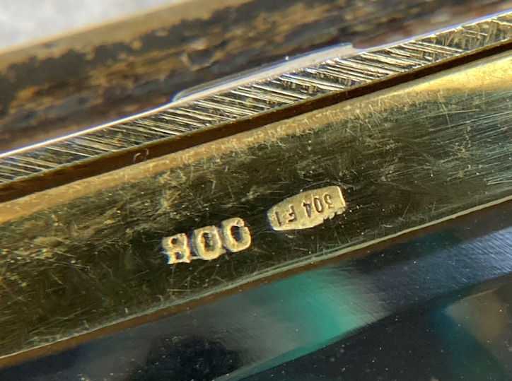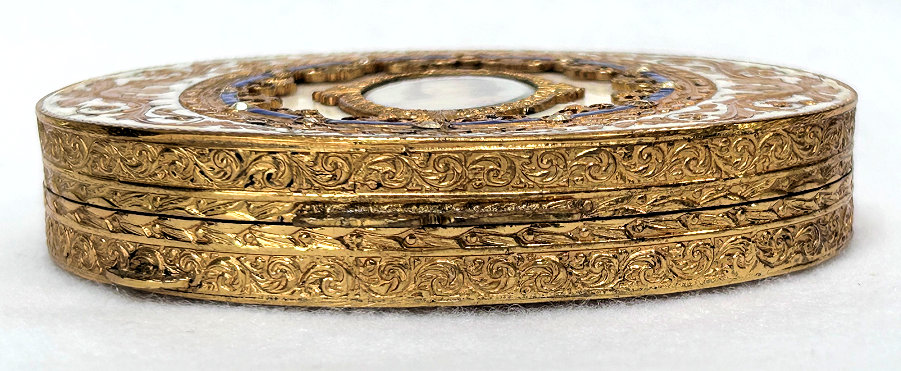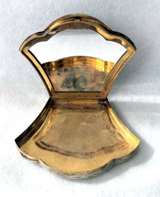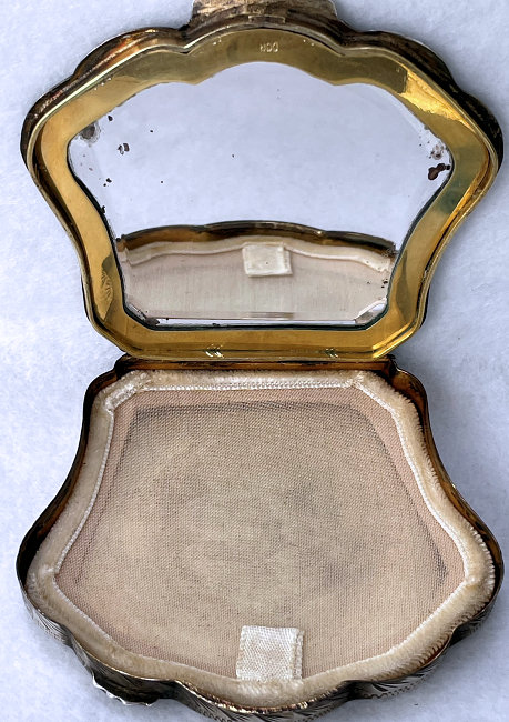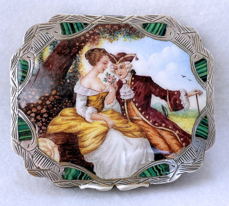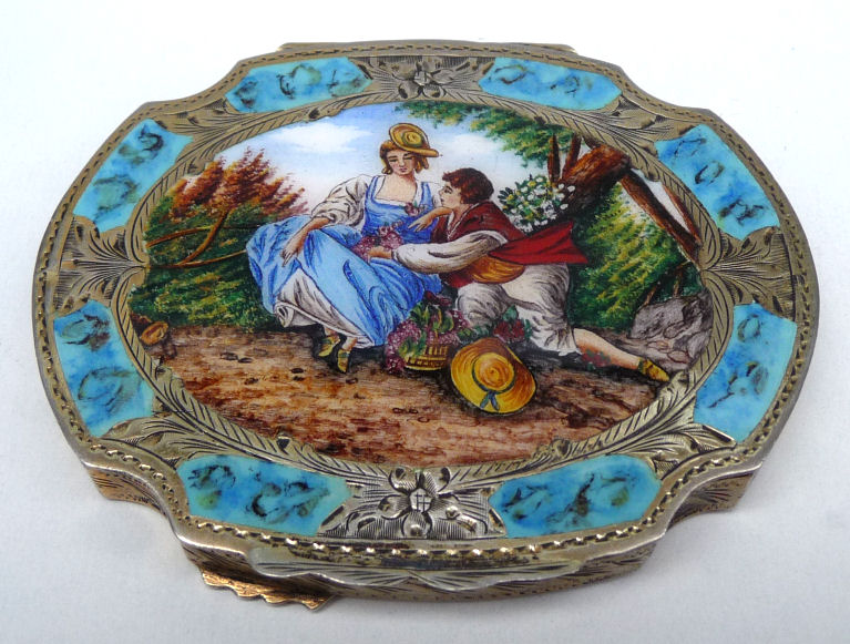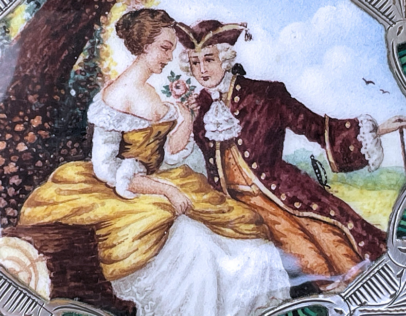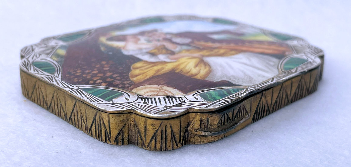 This is an extremely rare figural Italian sterling vermeil compact featuring a scene I have never come across before. This one features a courting couple with the gentleman presenting a rose to his lady fair. Both are in their elegant Sunday finest, he being topped with his lace cuffs and jabot, powdered wig and tricorn hat. She has an off-the-shoulder elgant gown with split tiered skirt. You can see his sword handle at his hip and he has a walking stick or cane in his hand. This is a beautifully detailed scene and a fabulous addition to any collection. The scene is bordered in faur malachite enamel panels. The inside has a shaped beveled mirror in the lid (it is a little crooked and could be straightened if desired) and a swansdown puff in the base. It is marked 800 (for sterling) on the mirror rim with a lozenge and bird symbol which is for Ottavio Spinelli's cases. It is in absolutely pristine condition with no scratches or wear to the surface that I could discern. It is quite large measuring 3-3/8" across x almost 3" high. (Click on pic for more photos.) |